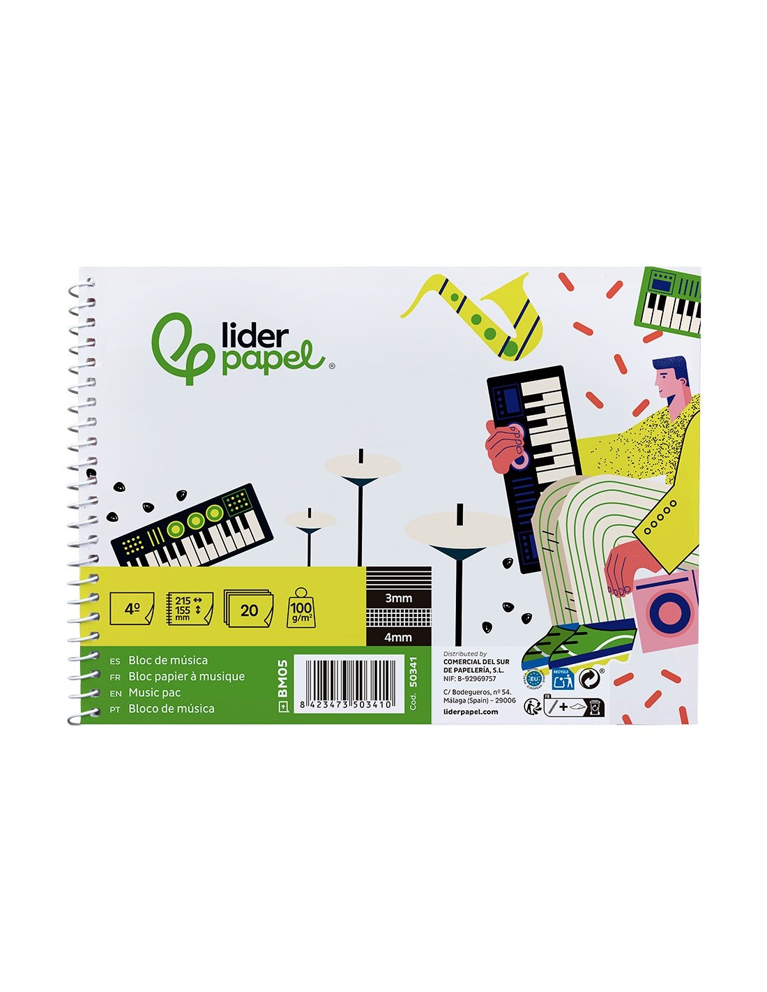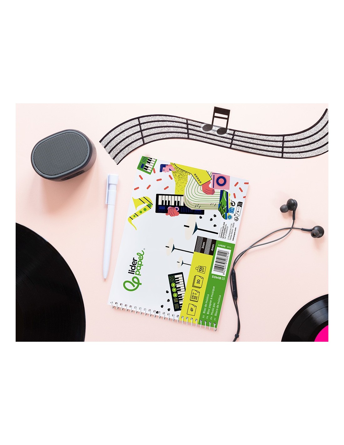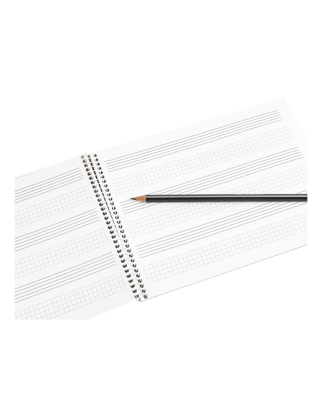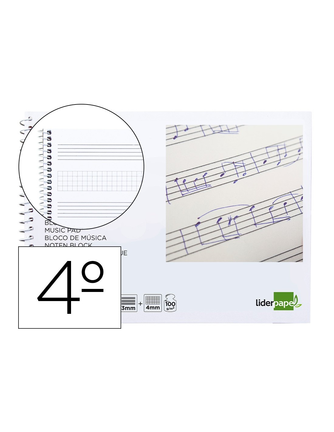 Tamaño cuarto apaisado (215 x 155 mm). 20 hojas. Papel de 100 g/m². Impresión pentagrama de 3 mm de interlineado, con espacio para anotaciones en cuadrícula de 4 mm.