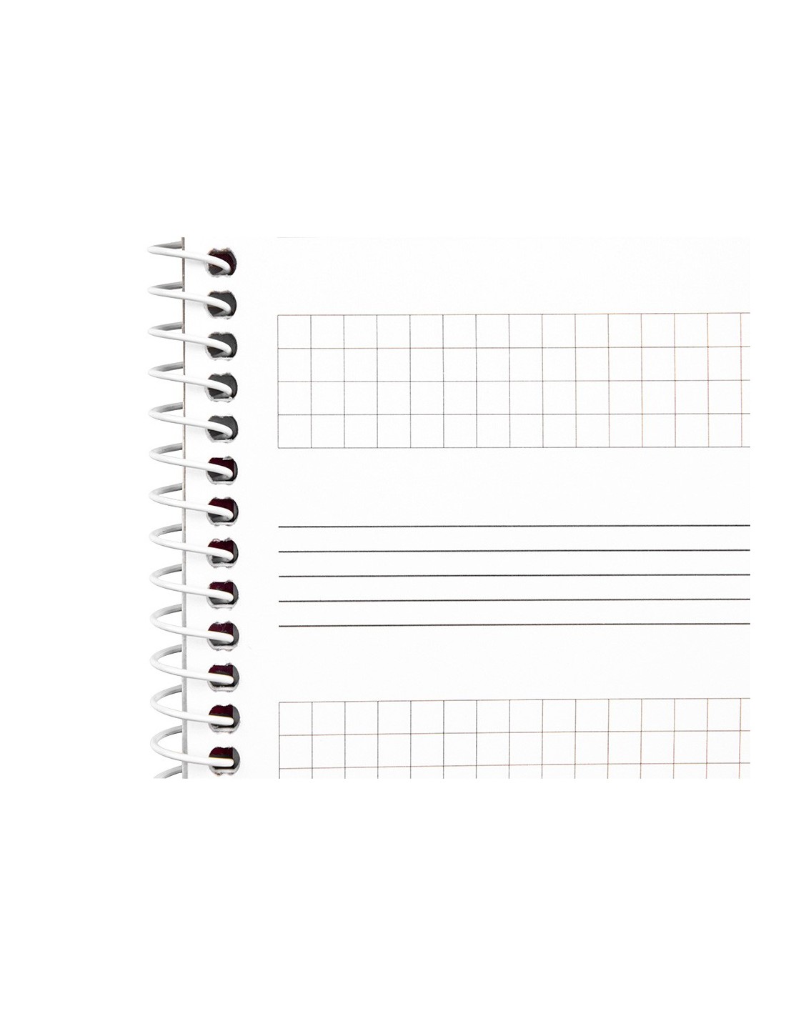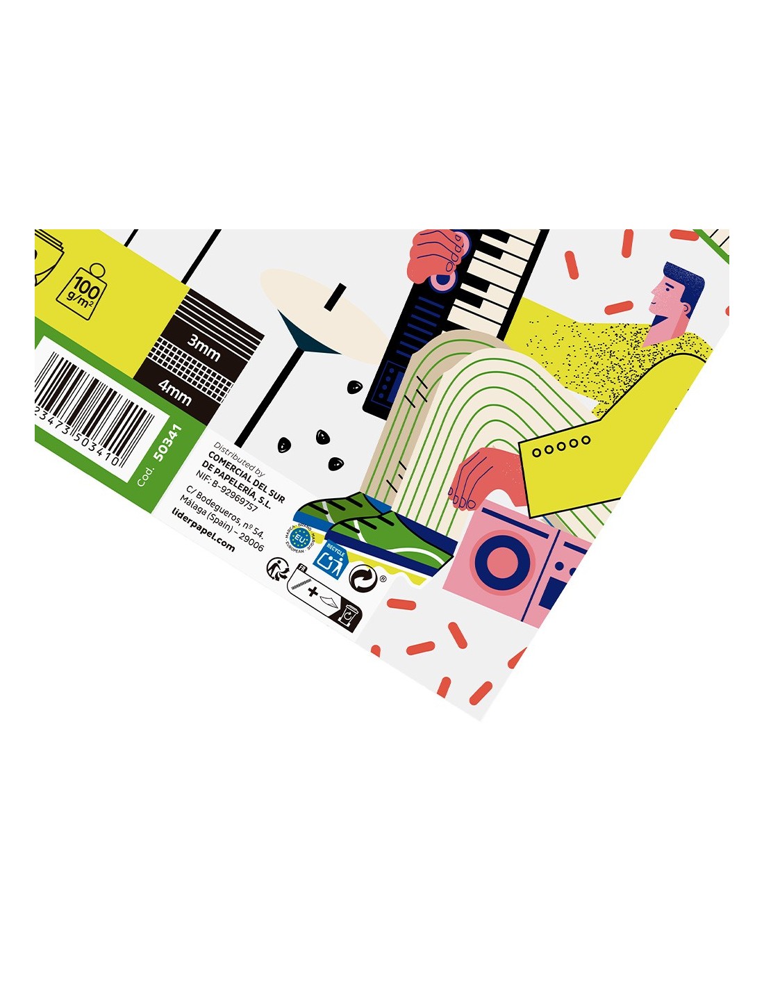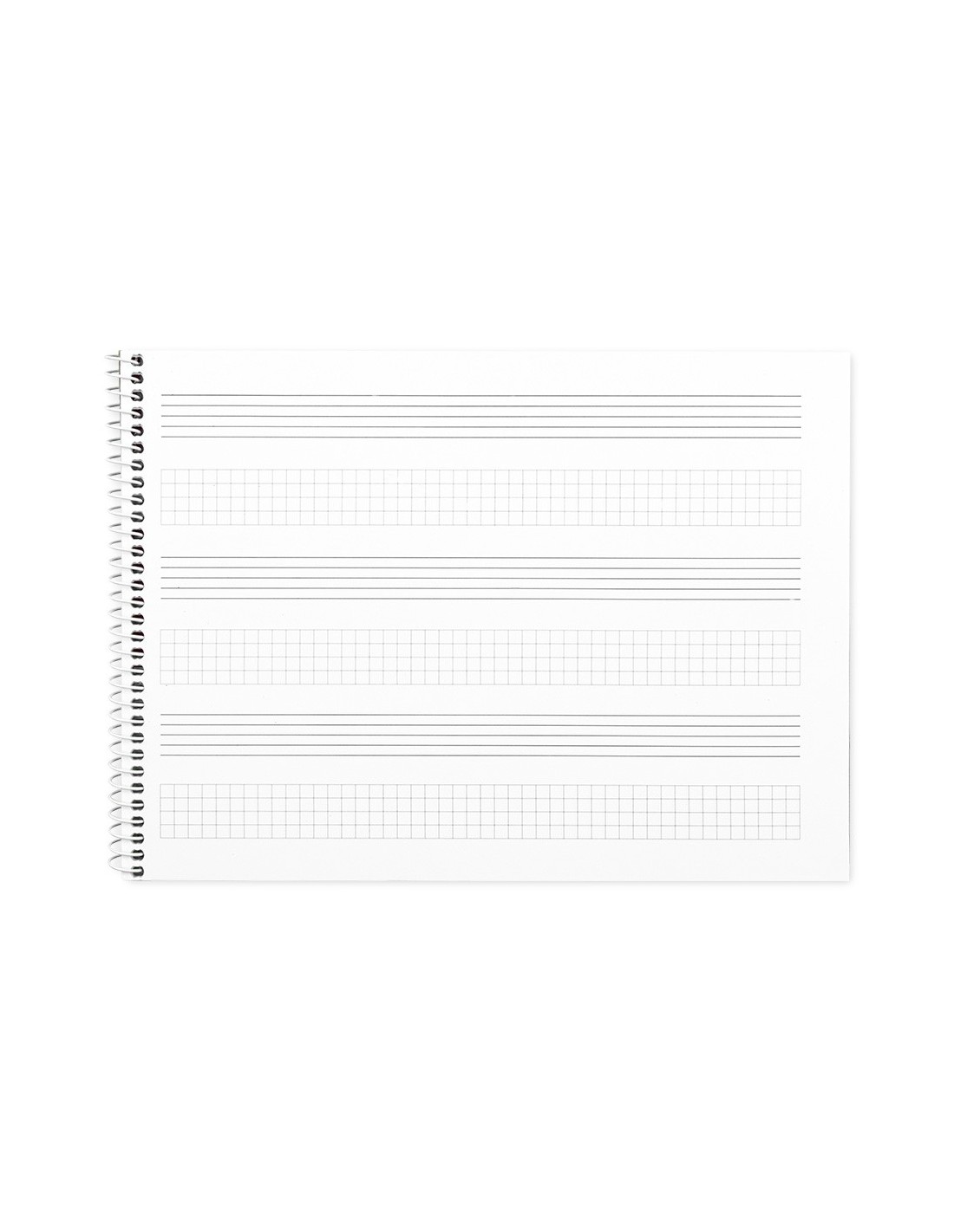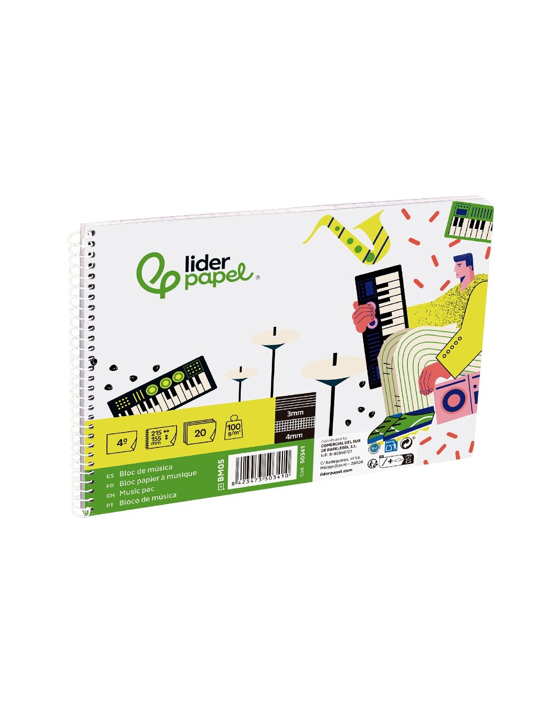 Tamaño cuarto apaisado (215 x 155 mm). 20 hojas. Papel de 100 g/m². Impresión pentagrama de 3 mm de interlineado, con espacio para anotaciones en cuadrícula de 4 mm.
