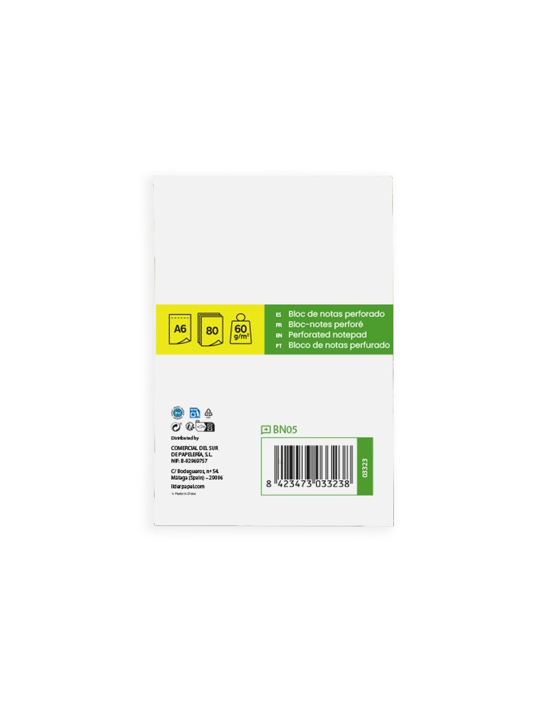 Tapa de cartoncillo impreso de 250 g/m². 80 hojas. Papel de 60 g/m². Perforado.