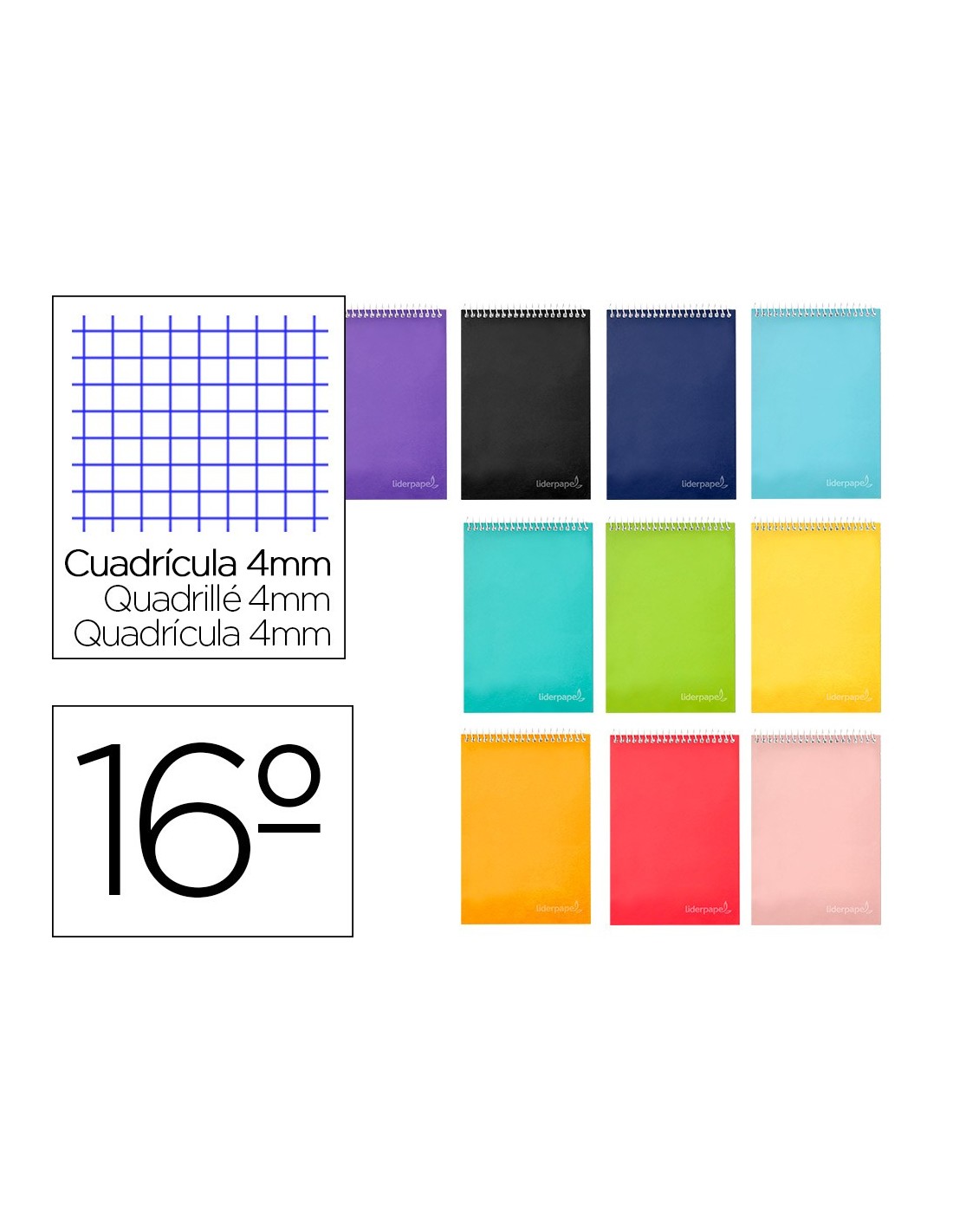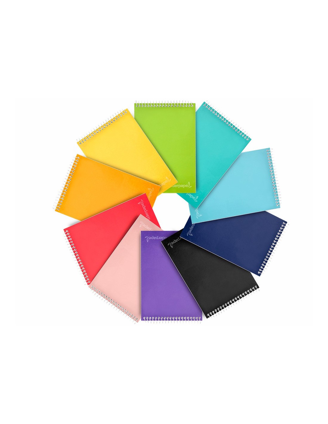 Tapa de cartoncillo de 800 g/m² con doble encolado, impresa y plastificada mate. Gran resistencia y rigidez. Papel de 75 g/m². Espiral nylonizada. Con margen. Coil-lock. Colores surtidos.