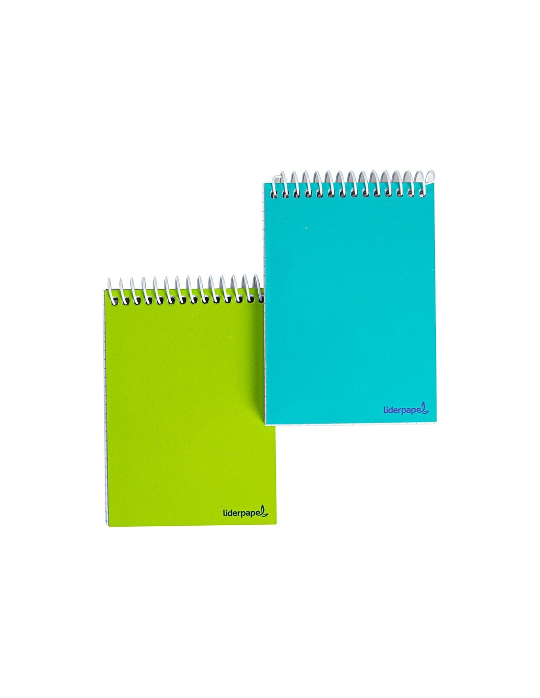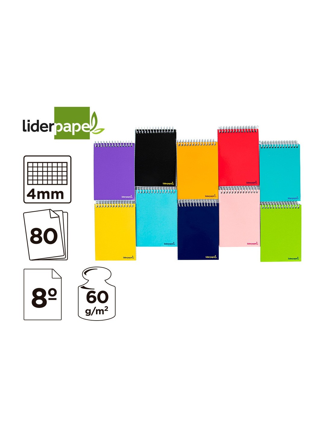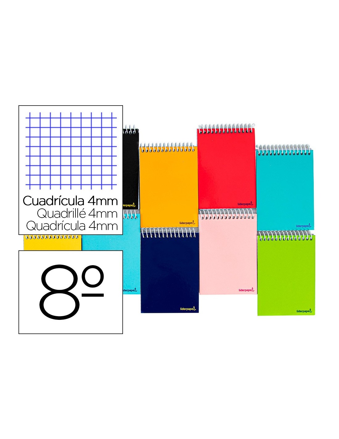 Tapa de cartoncillo de 400 g/m² impresa y plastificada en polietileno brillo. Contratapa de cartoncillo de 400 g/m². 80 hojas. Papel de 60 g/m². Espiral nylonizada blanca. Sin margen. Cuadrícula de 4 mm. Colores surtidos.