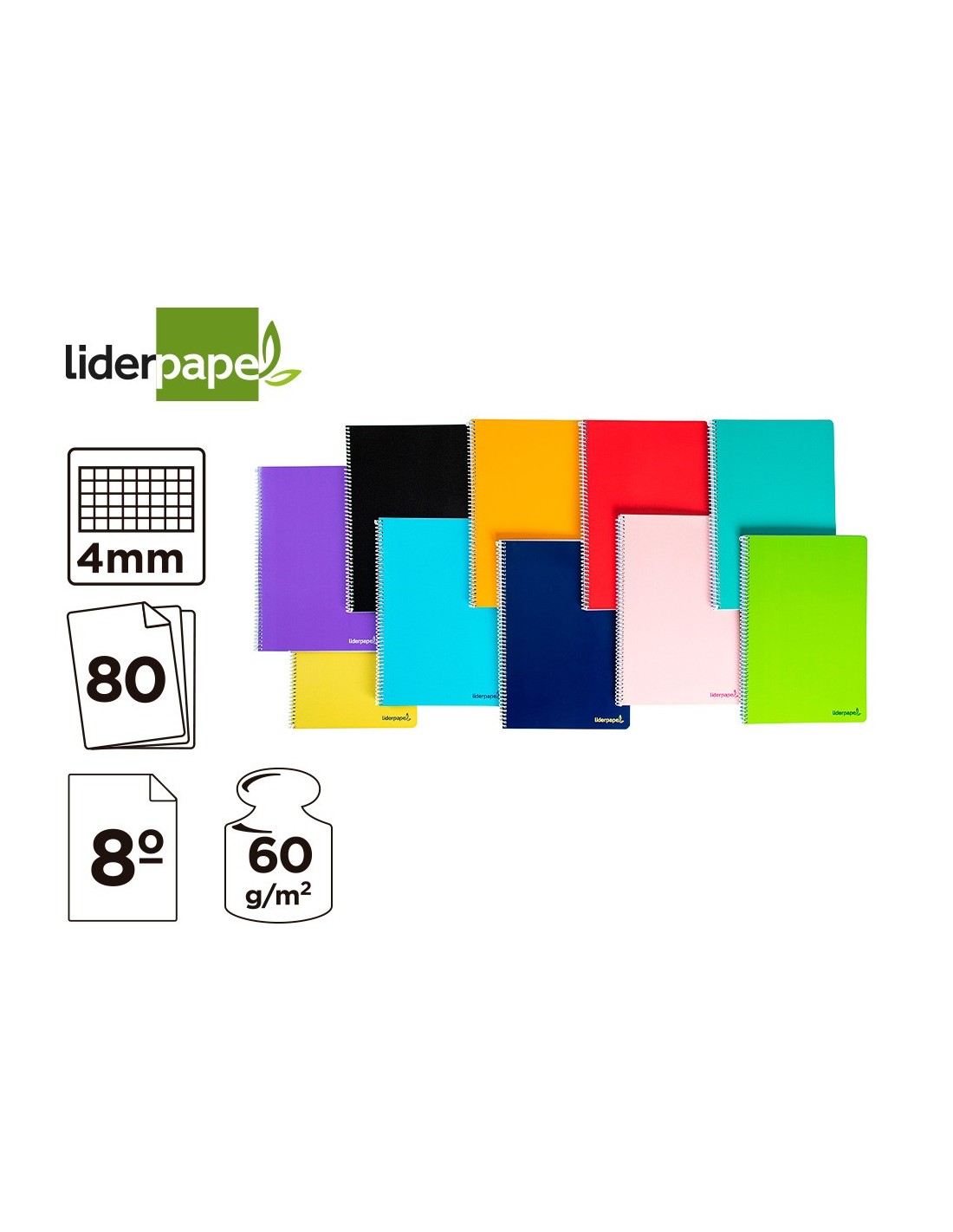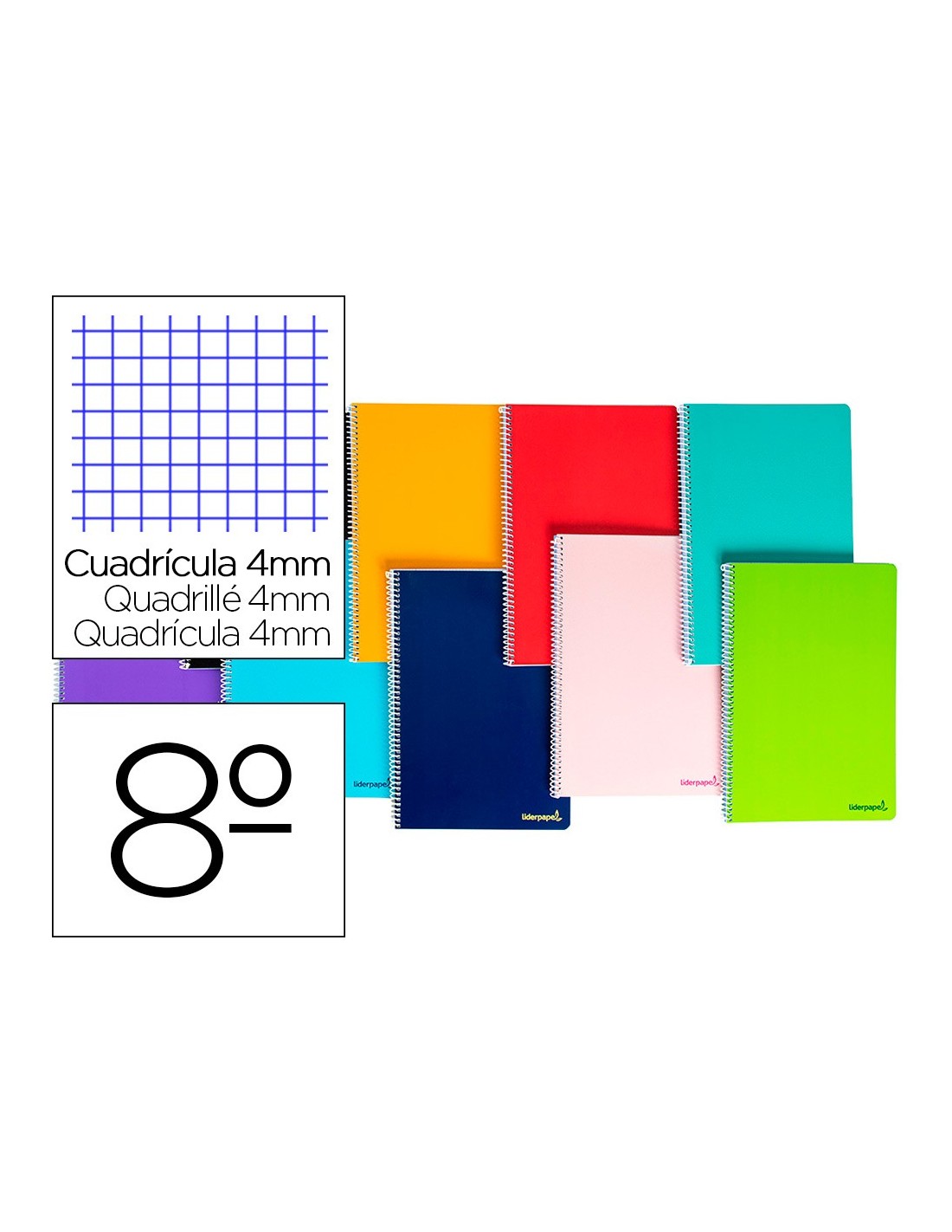 Tapa de cartoncillo de 400 g/m² impresa y plastificada en polietileno brillo. Contratapa de cartoncillo de 400 g/m². 80 hojas. Papel de 60 g/m². Espiral nylonizada blanca. Sin margen. Cuadrícula de 4 mm. Colores surtidos.