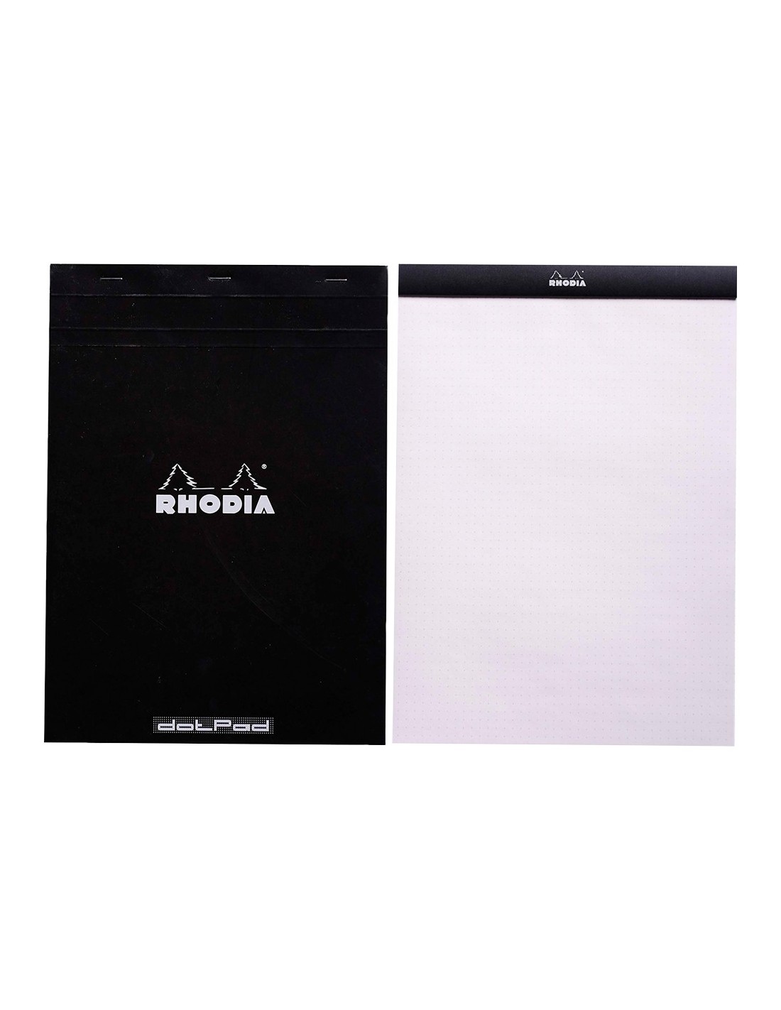 Bloc de notas. Tapa resistente e impermeable en color negro. 80 hojas. 80 g/m². Microperforadas en la parte superior para poder separarlas fácilmente. Impresión de puntos de 5 mm.