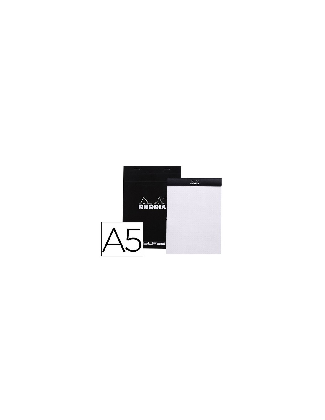 Bloc de notas. Tapa resistente e impermeable en color negro. 80 hojas. 80 g/m². Microperforadas en la parte superior para poder separarlas fácilmente. Impresión de puntos de 5 mm.