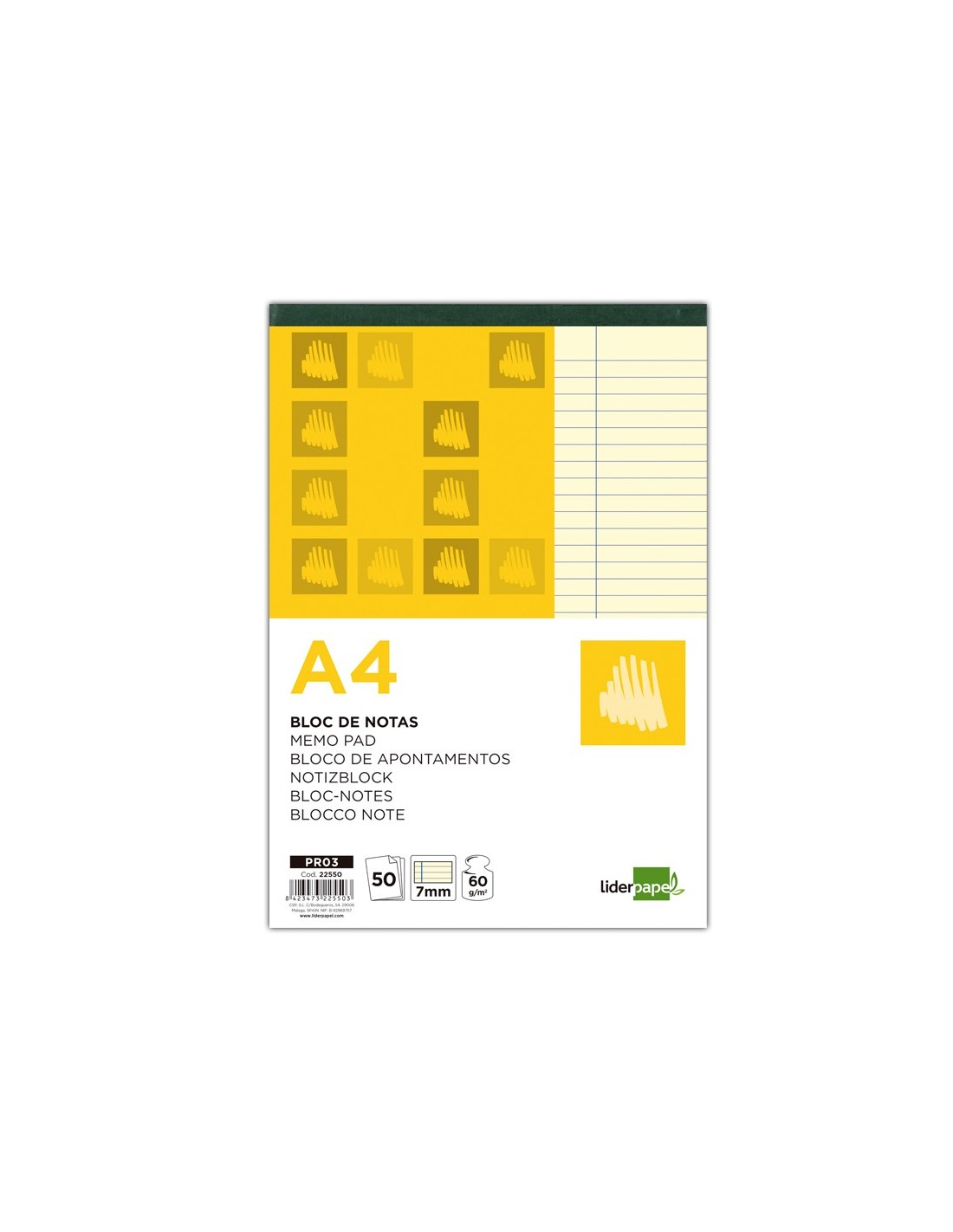 Din A4. 50 hojas. Papel de 60 g/m². Rayado horizontal. Con margen. Hojas amarillas.