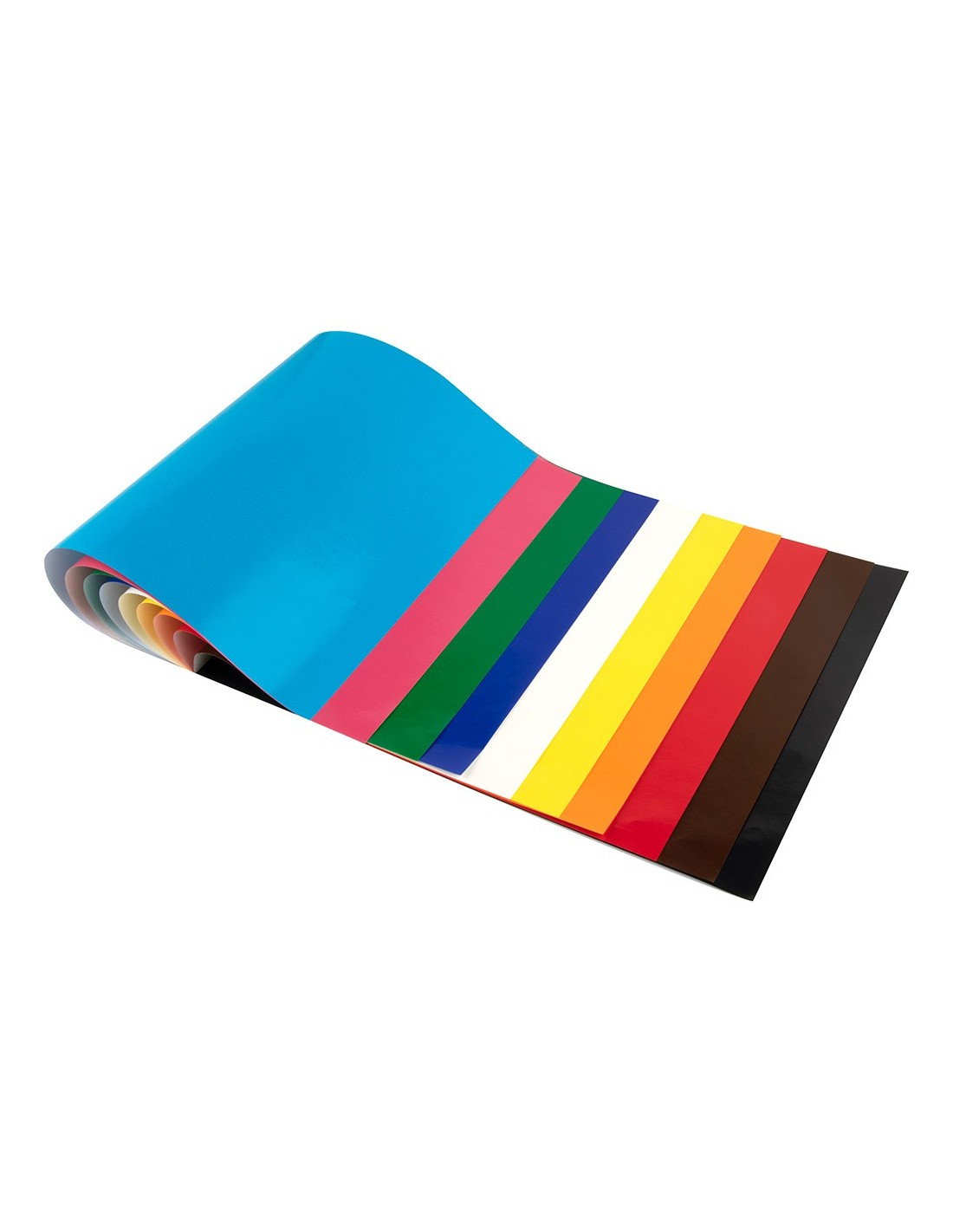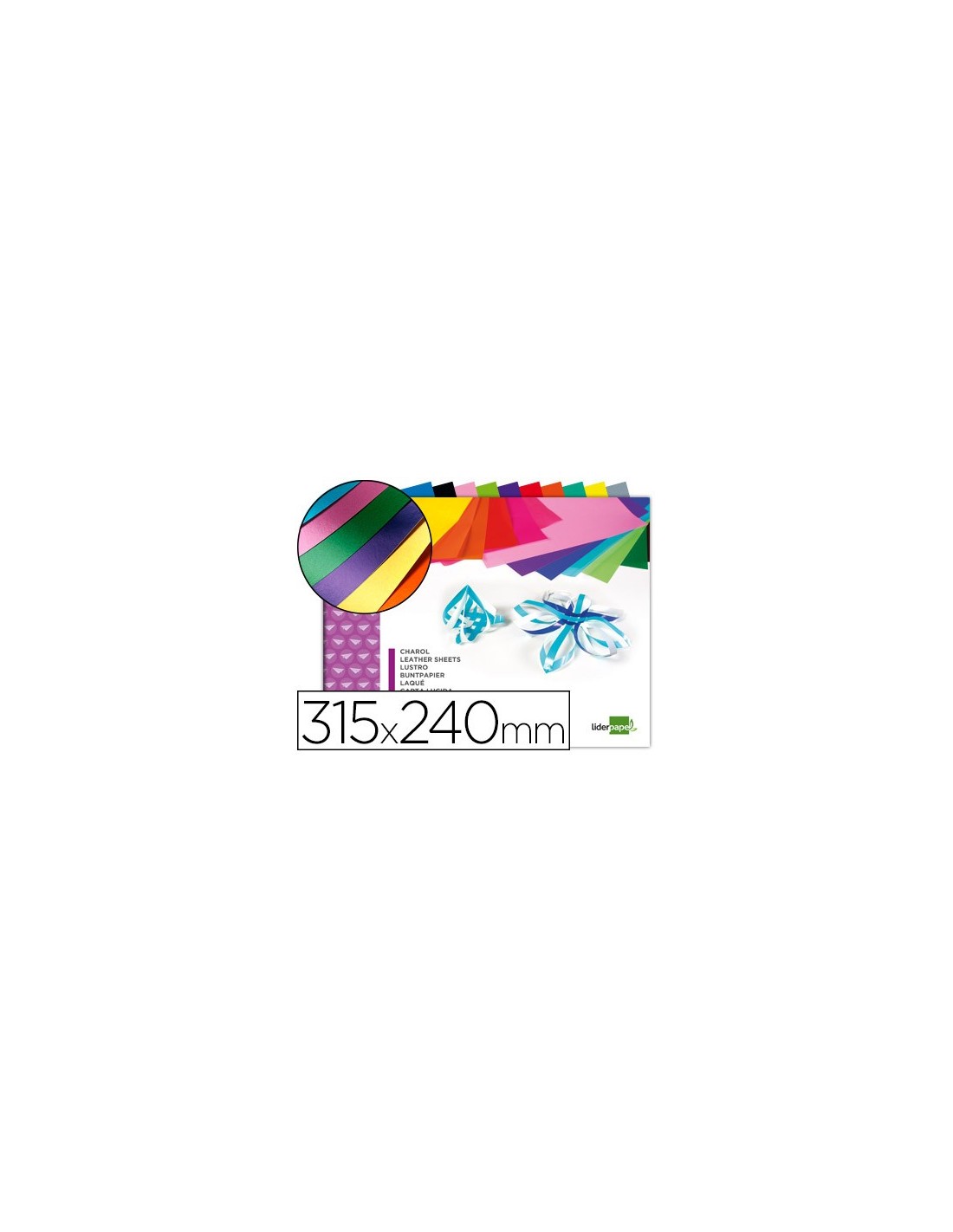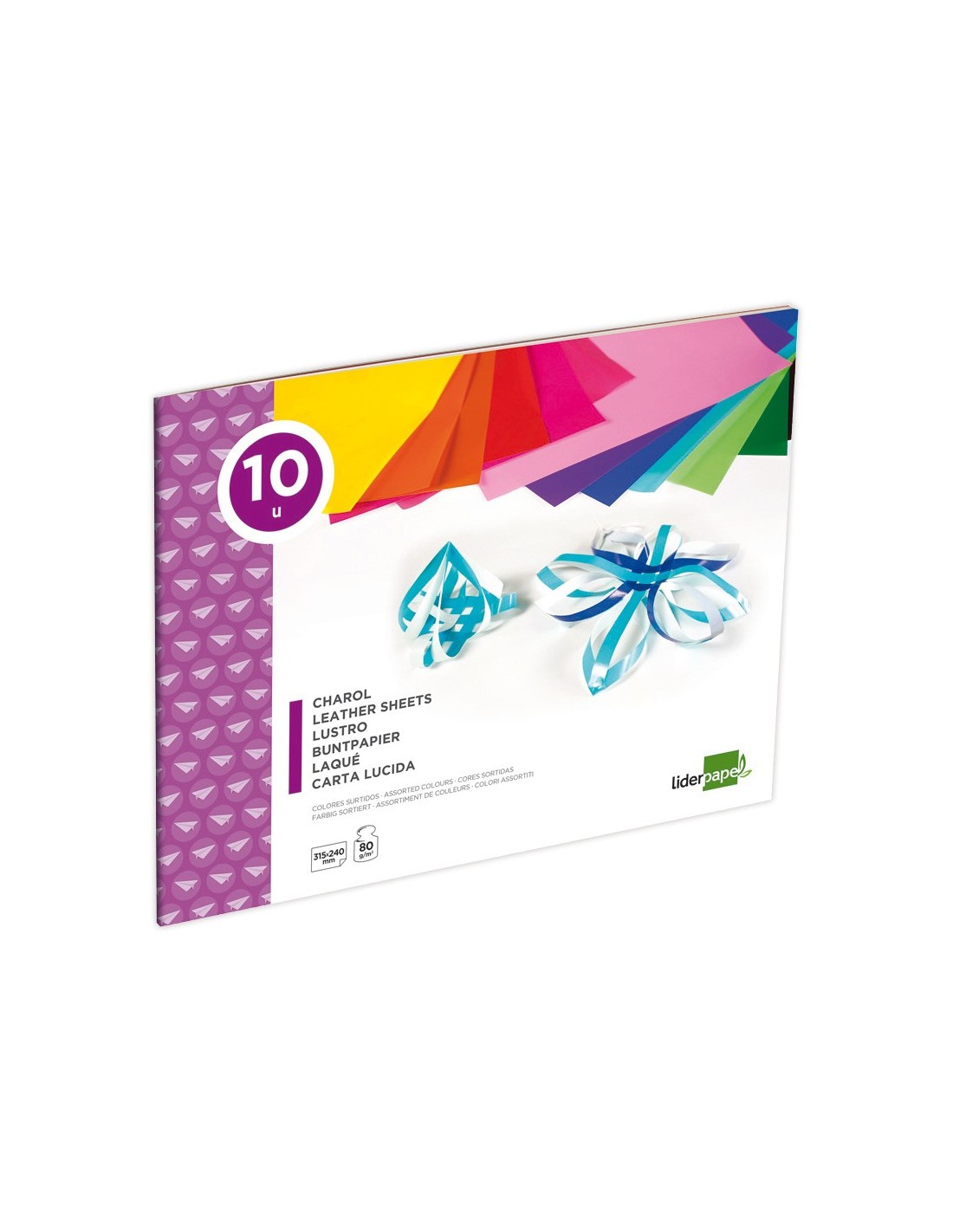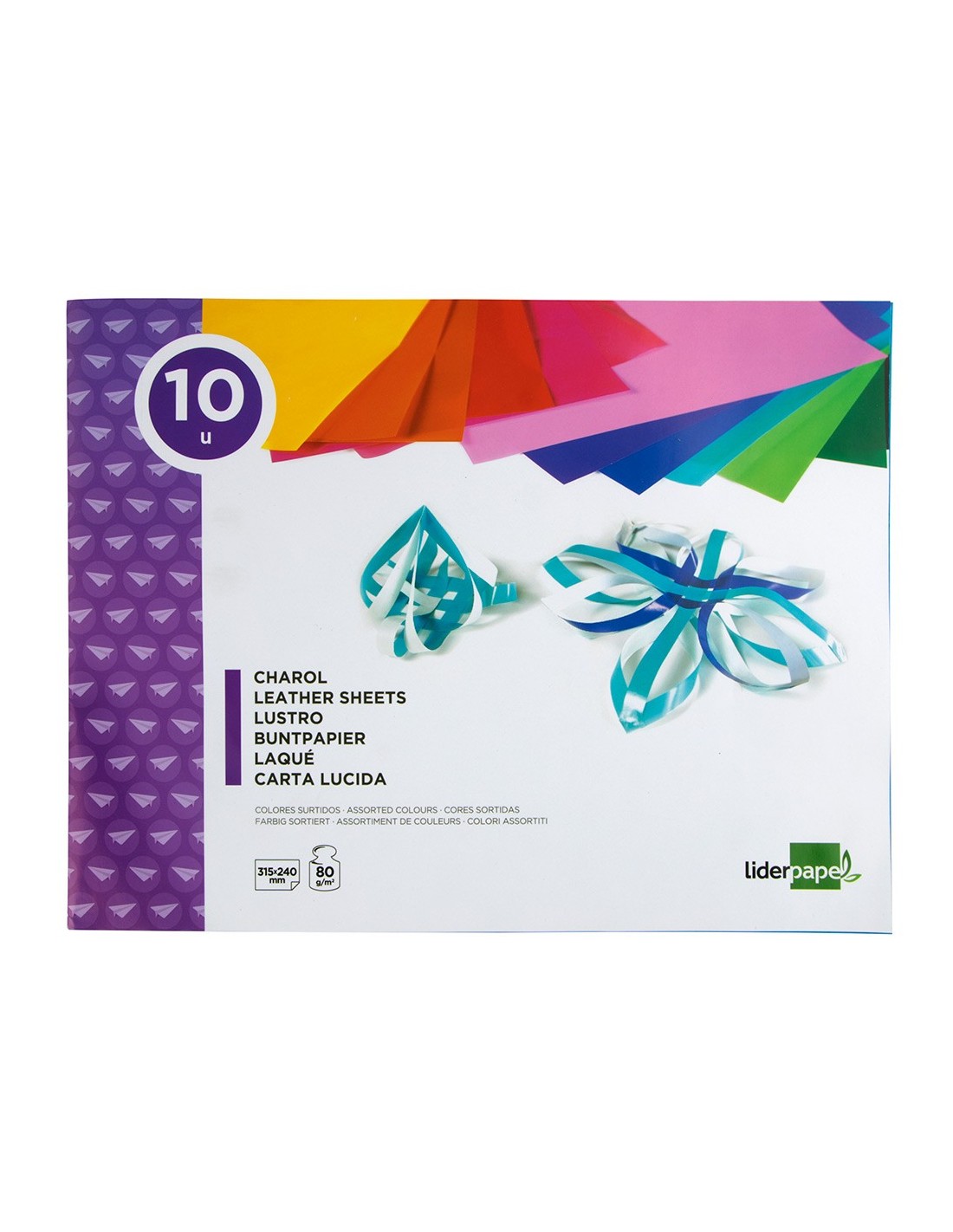 10 hojas de papel charol en colores surtidos. Gramaje 80 g/m². Medidas: 315 x 240 mm.