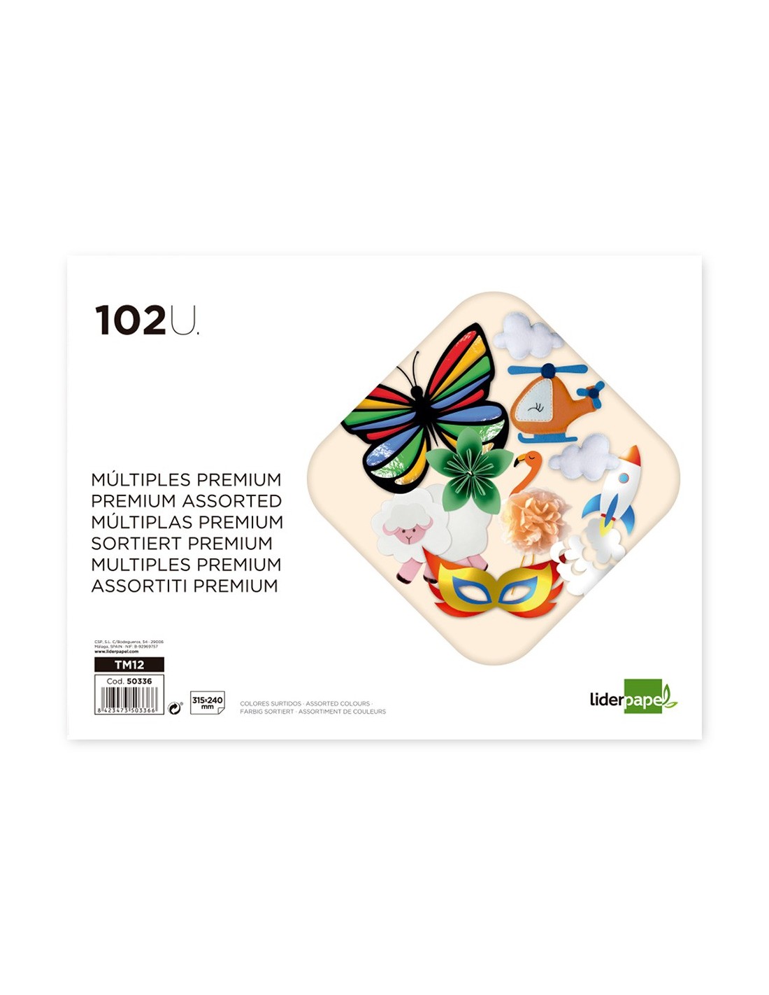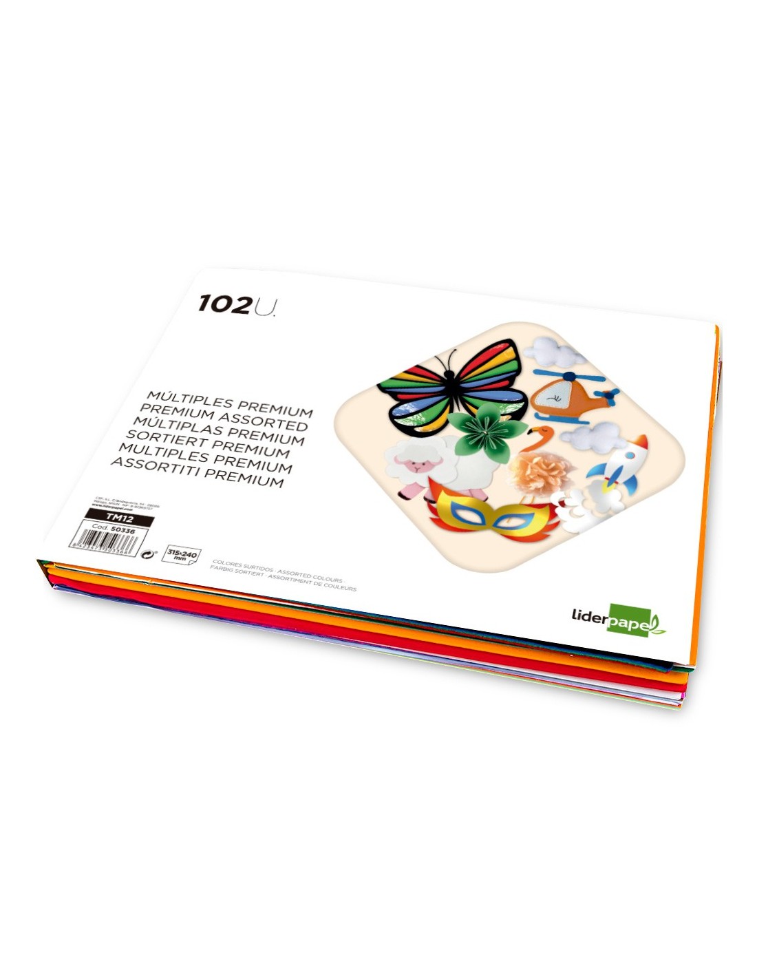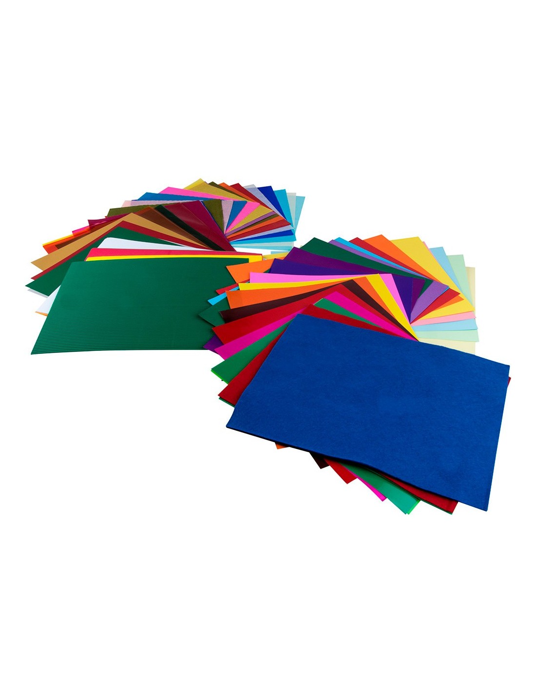 Contiene: 10 hojas de cartulina, 10 hojas de charol, 10 hojas de papel crespón, 50 hojas de papel seda, 6 hojas de papel celofán, 4 hojas de cartulina metalizada, 4 hojas de goma EVA, 4 hojas de cartón ondulado y 4 hojas de fieltro. Medidas: 315 x 240 mm.