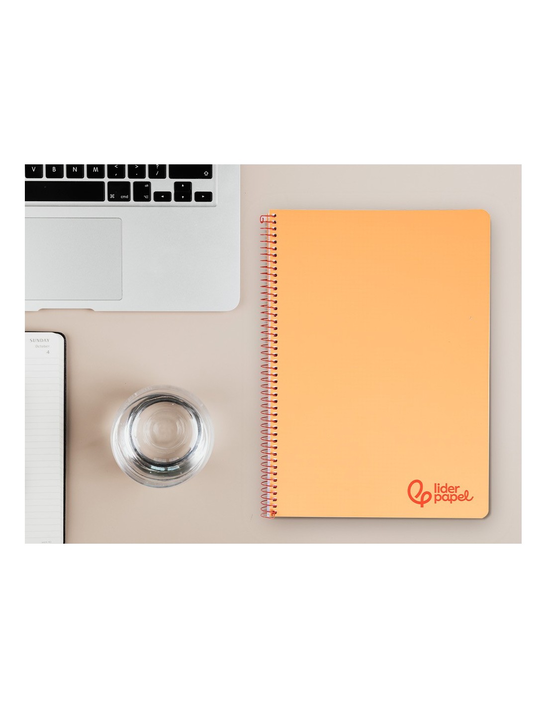 Tapa de polipropileno opaco de 600 micras impreso, que proporciona mayor duración y flexibilidad al cuaderno. Papel de 90 g/m².