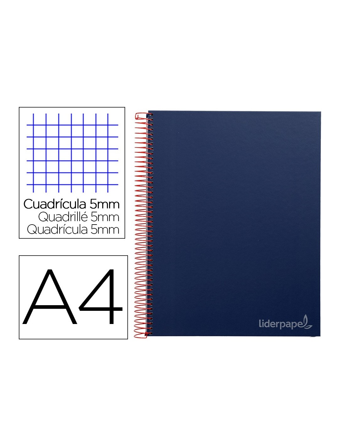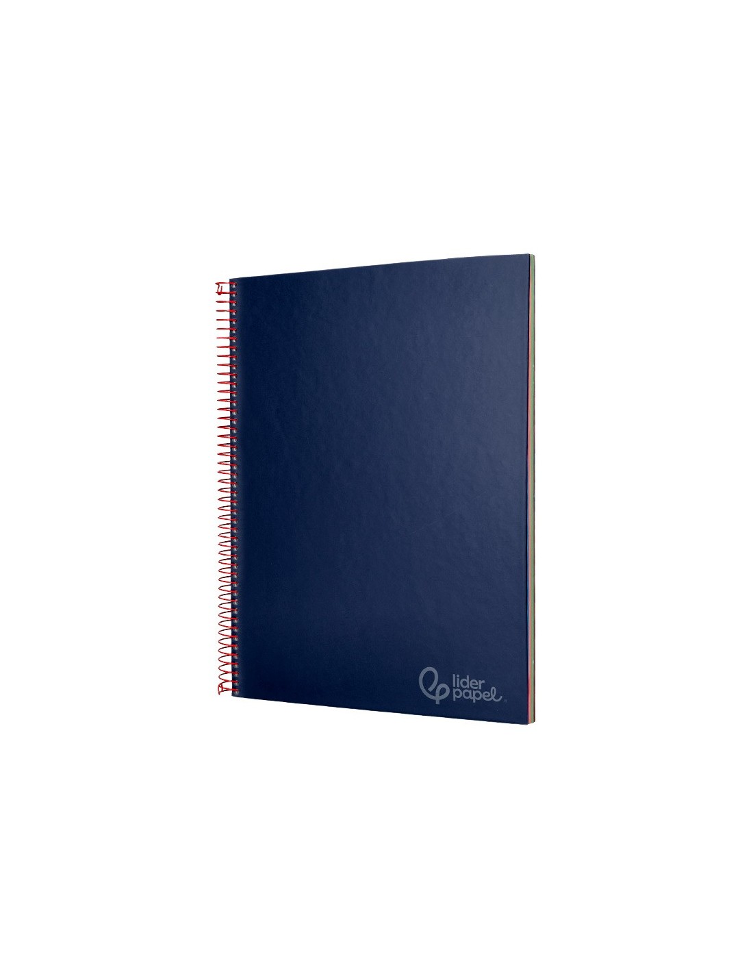 Tapa de cartón entrecolado de 1,5 mm de espesor, forrado con papel estucado mate de 135 g/m². Guarda interior blanca. Papel de 75 g/m ². Microperforado. 140 hojas. Bandas de 5 colores. Con cajetín. Espiral nylonizada. Coil-lock.