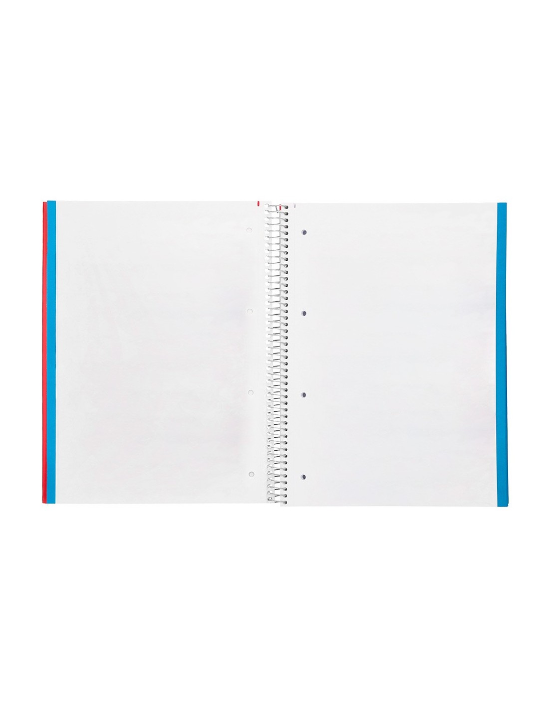 Tapa de cartón entrecolado de 1,5 mm de espesor, forrado con papel estucado mate de 135 g/m². Guarda interior blanca. Papel de 75 g/m ². Microperforado. 140 hojas. Bandas de 5 colores. Con cajetín. Espiral nylonizada. Coil-lock.