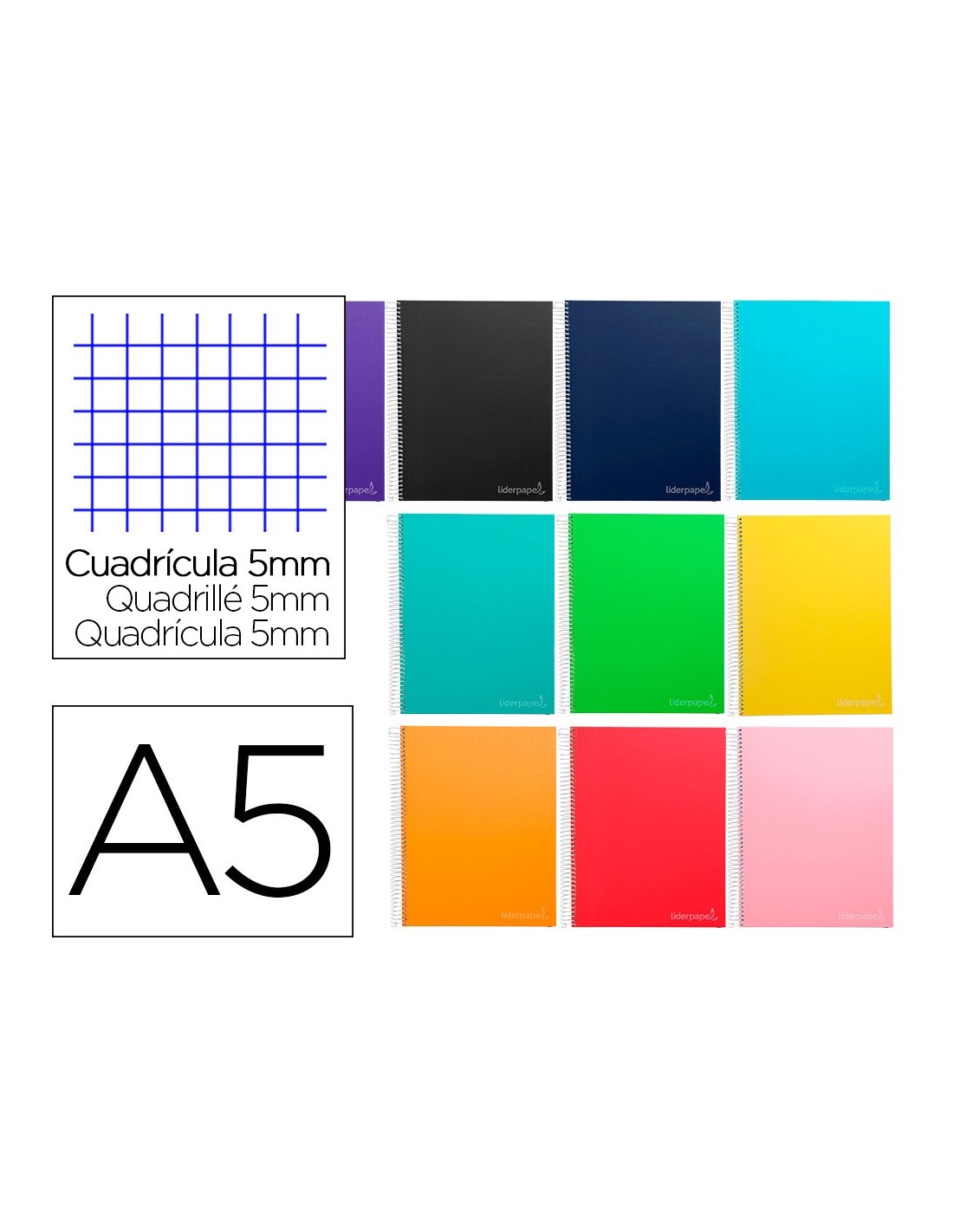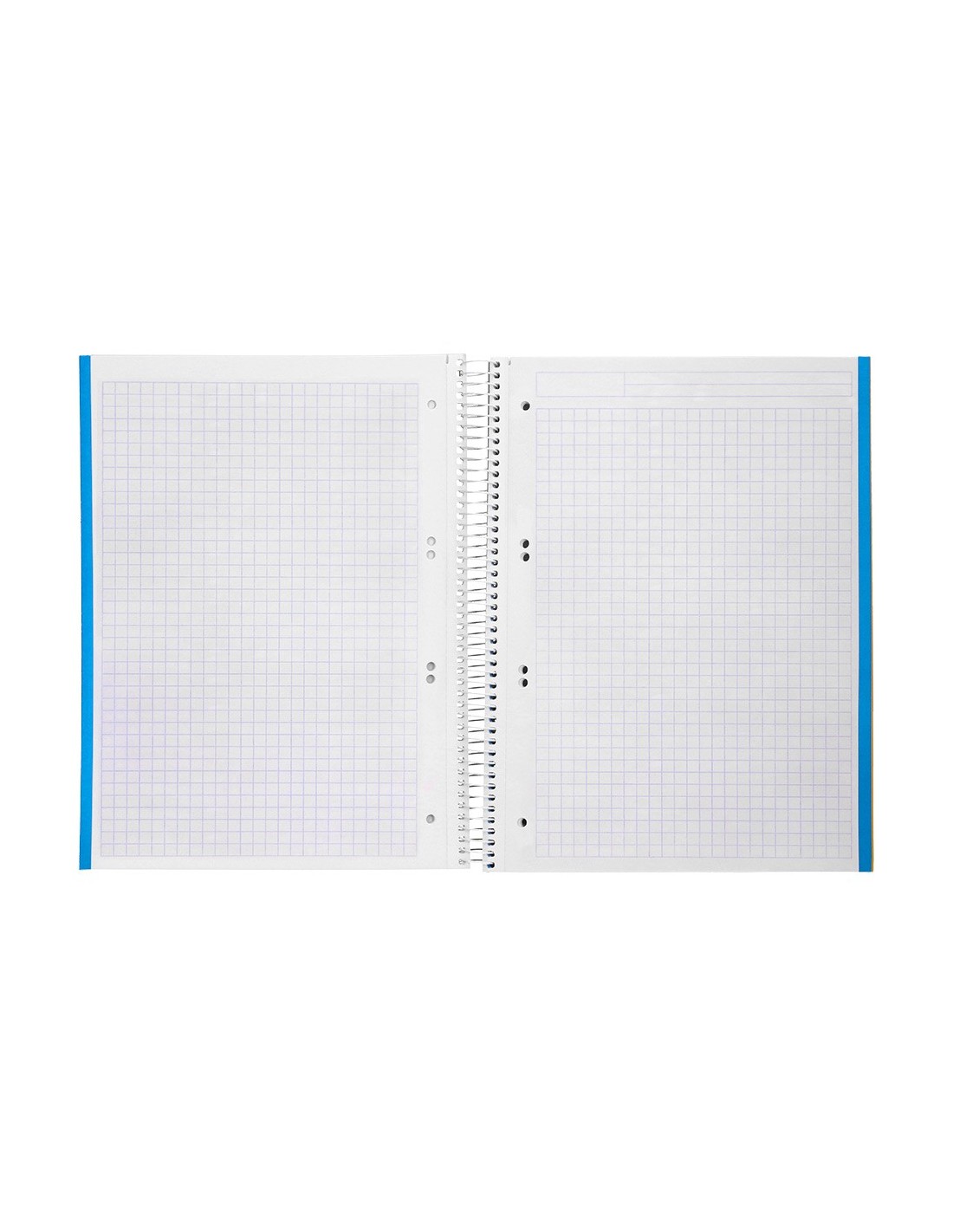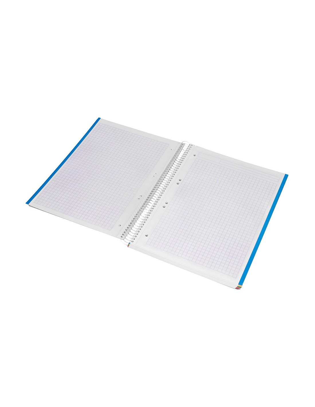 Tapa de cartón entrecolado de 1,5 mm de espesor, forrado con papel estucado mate de 135 g/m². Guarda interior blanca. Papel de 75 g/m ². Microperforado. 140 hojas. Bandas de 5 colores. Con cajetín. Espiral nylonizada. Coil-lock.