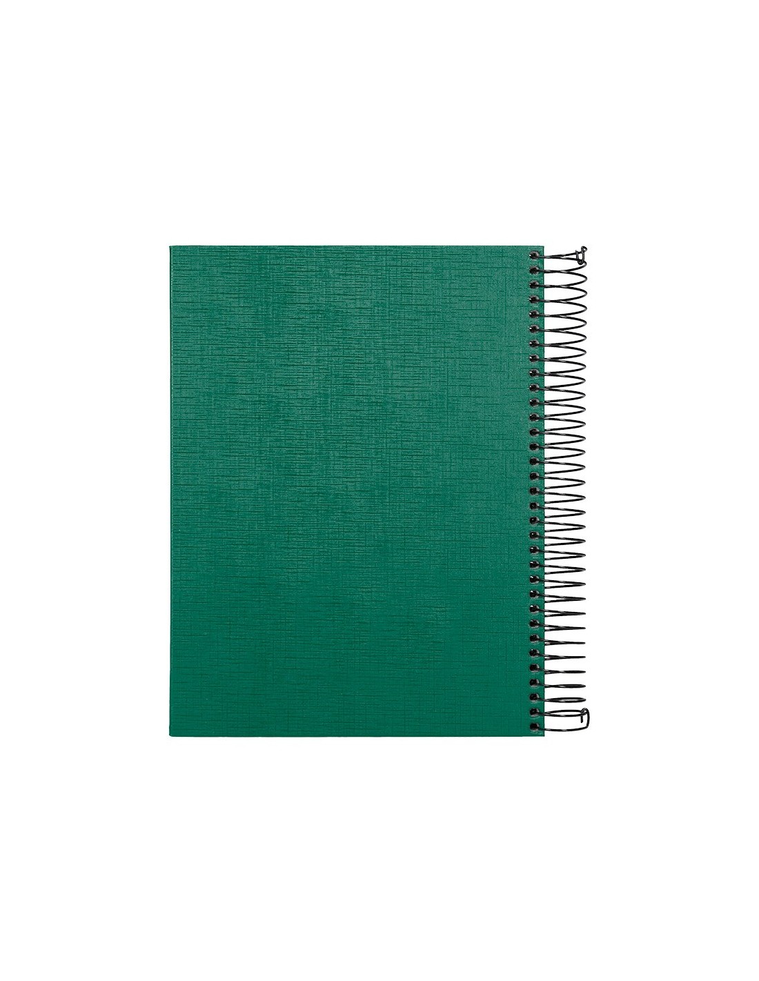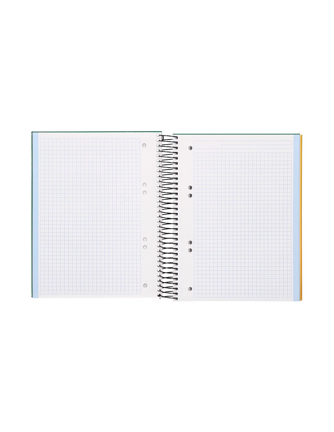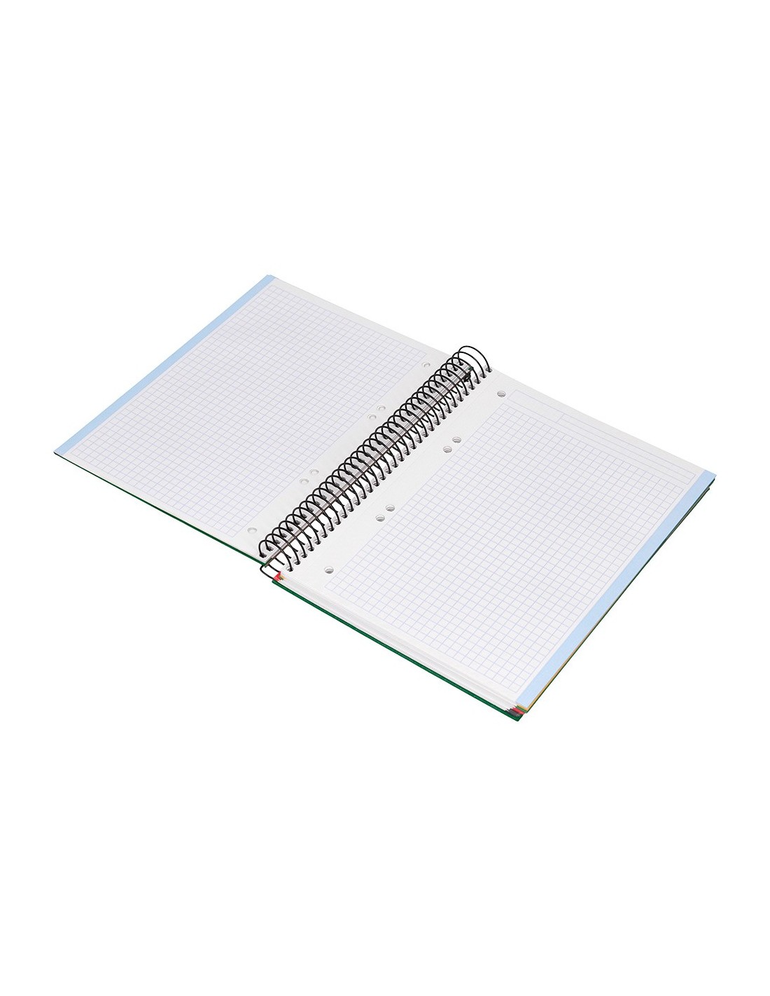 Tapa de cartón entrecolado de 1,50 mm de espesor, forrado con papel de encuadernación plastificado, gofrado tela en PVC. 140 hojas. Papel de 75 g/m². Bandas de 5 colores. Cuadrícula de 5 mm. Guarda interior impresa. Espiral nylonizada negra. Coil-lock.