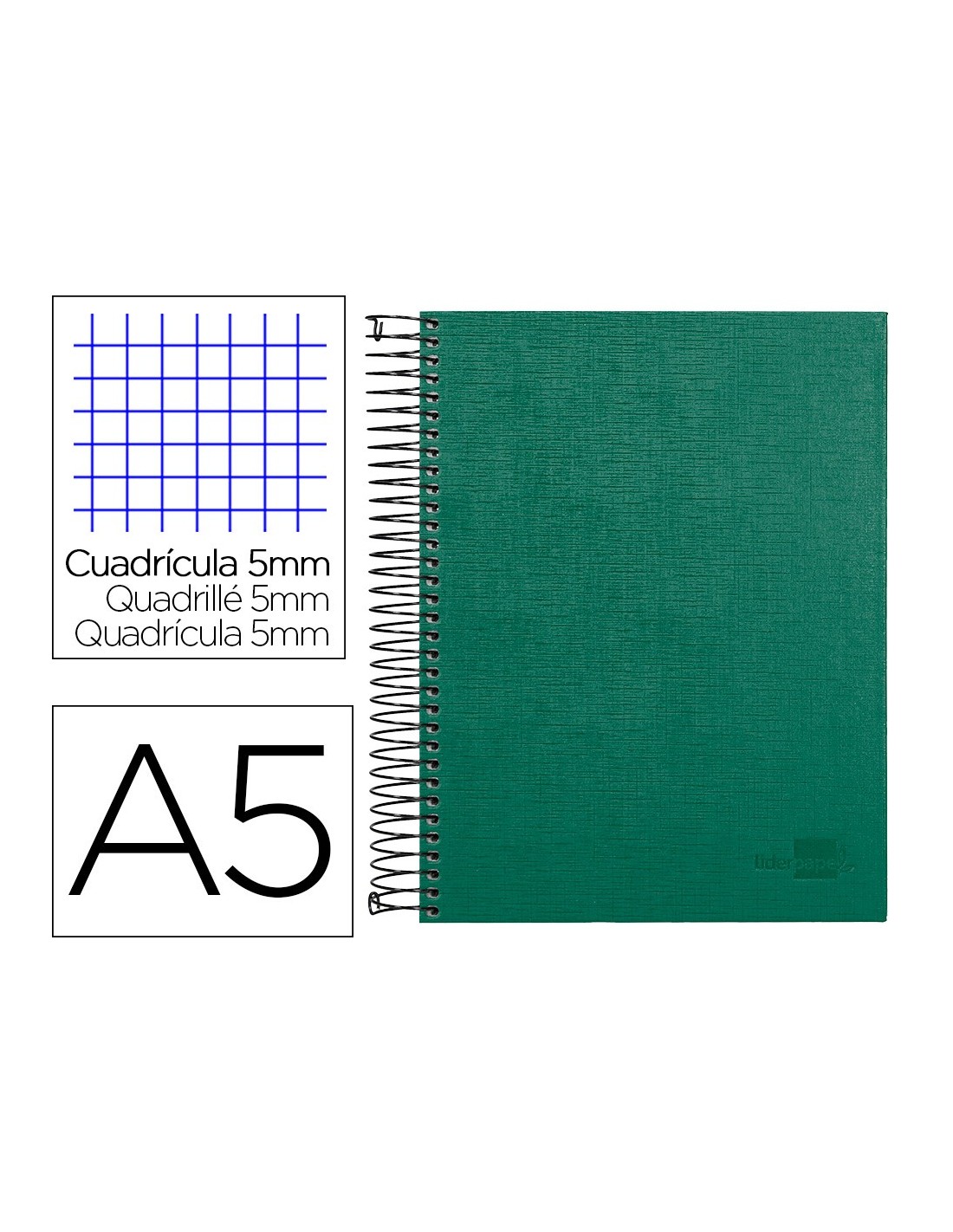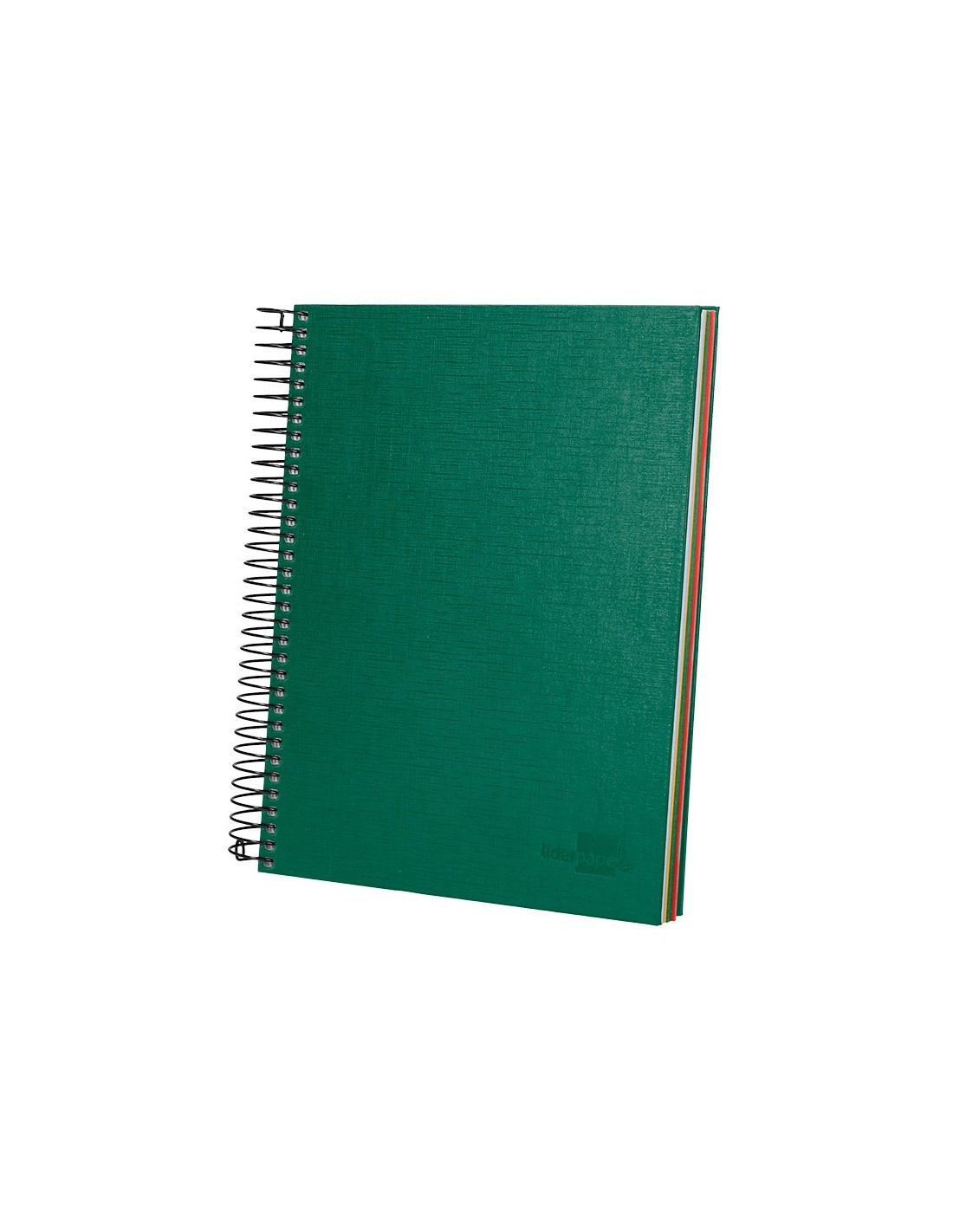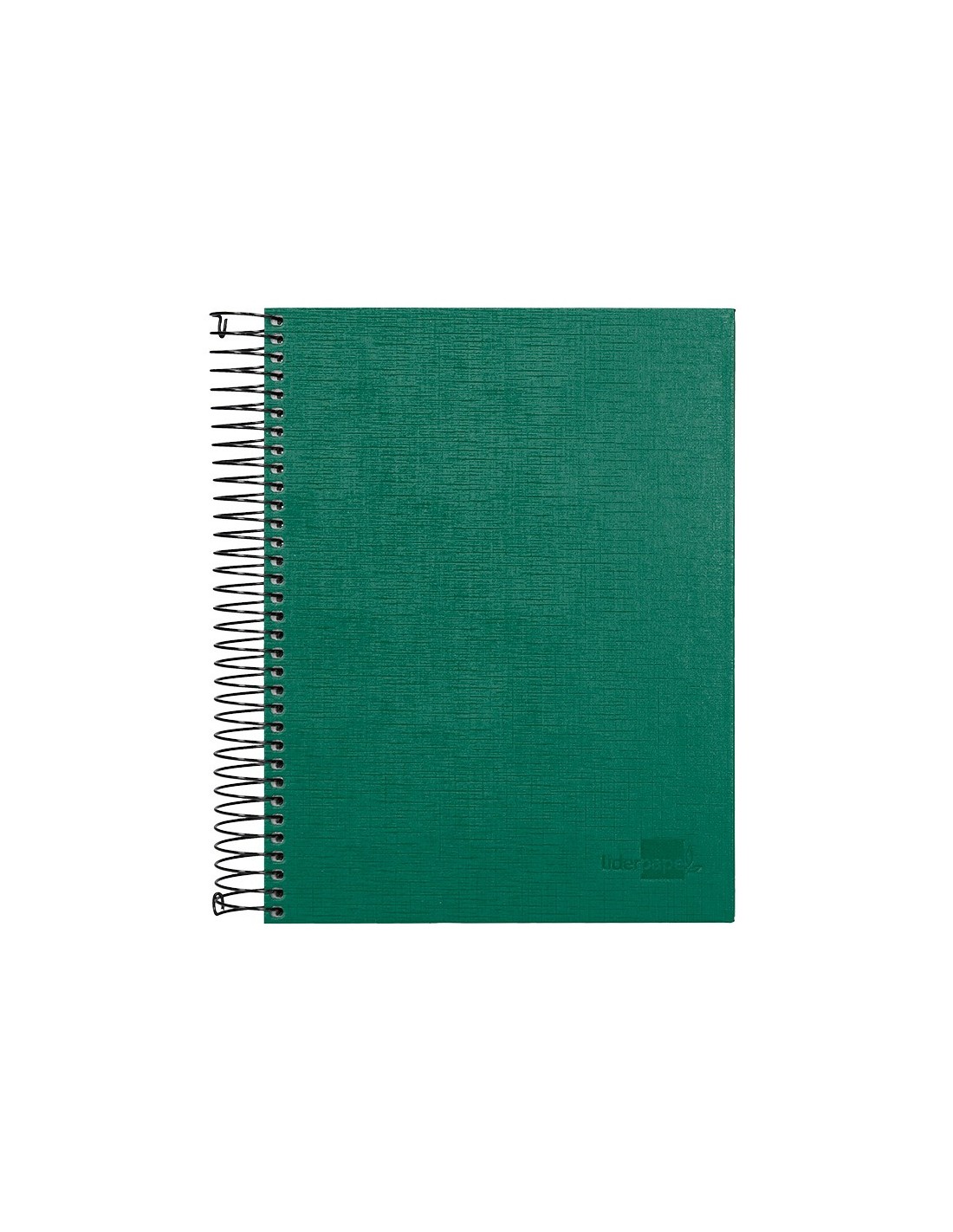 Tapa de cartón entrecolado de 1,50 mm de espesor, forrado con papel de encuadernación plastificado, gofrado tela en PVC. 140 hojas. Papel de 75 g/m². Bandas de 5 colores. Cuadrícula de 5 mm. Guarda interior impresa. Espiral nylonizada negra. Coil-lock.