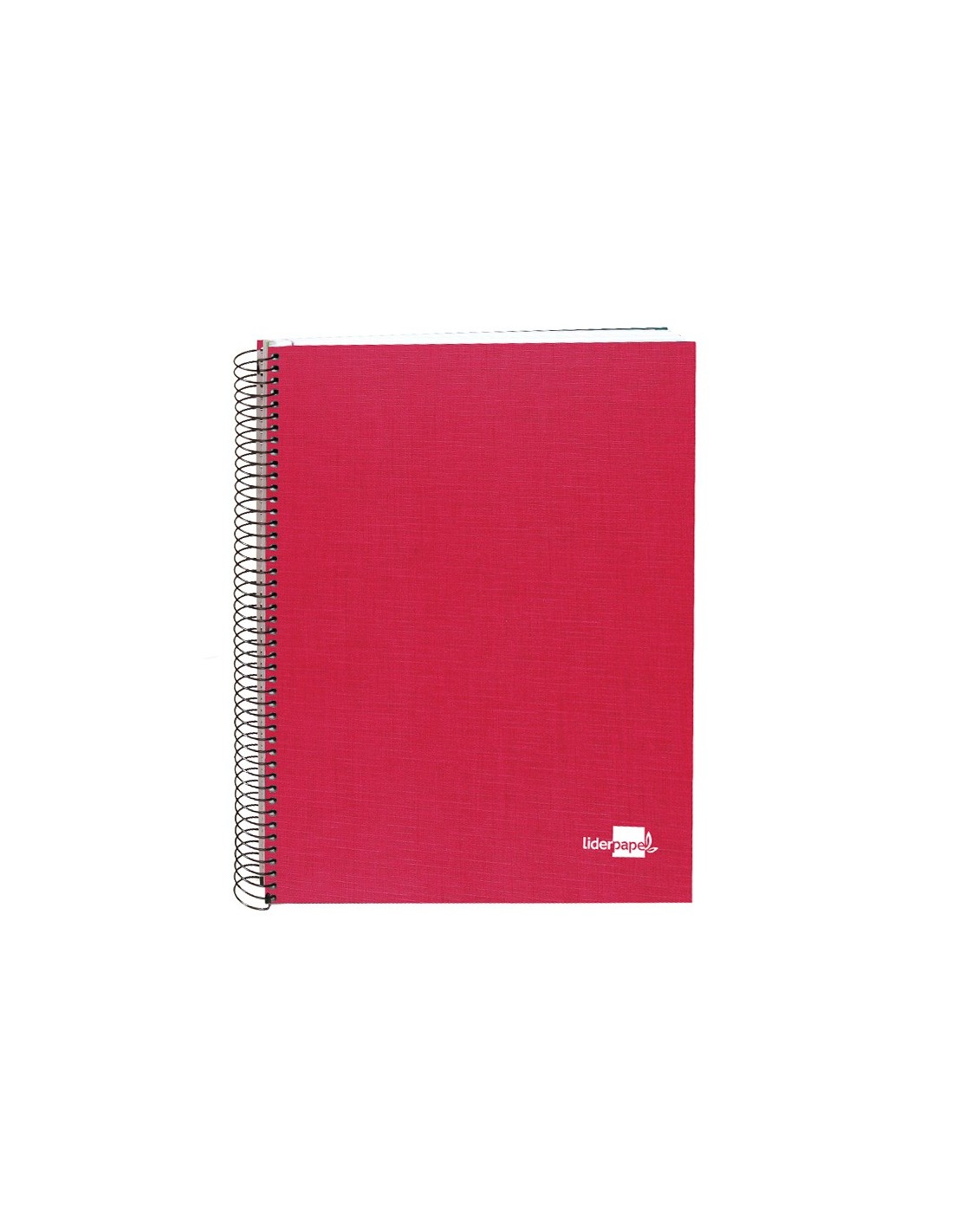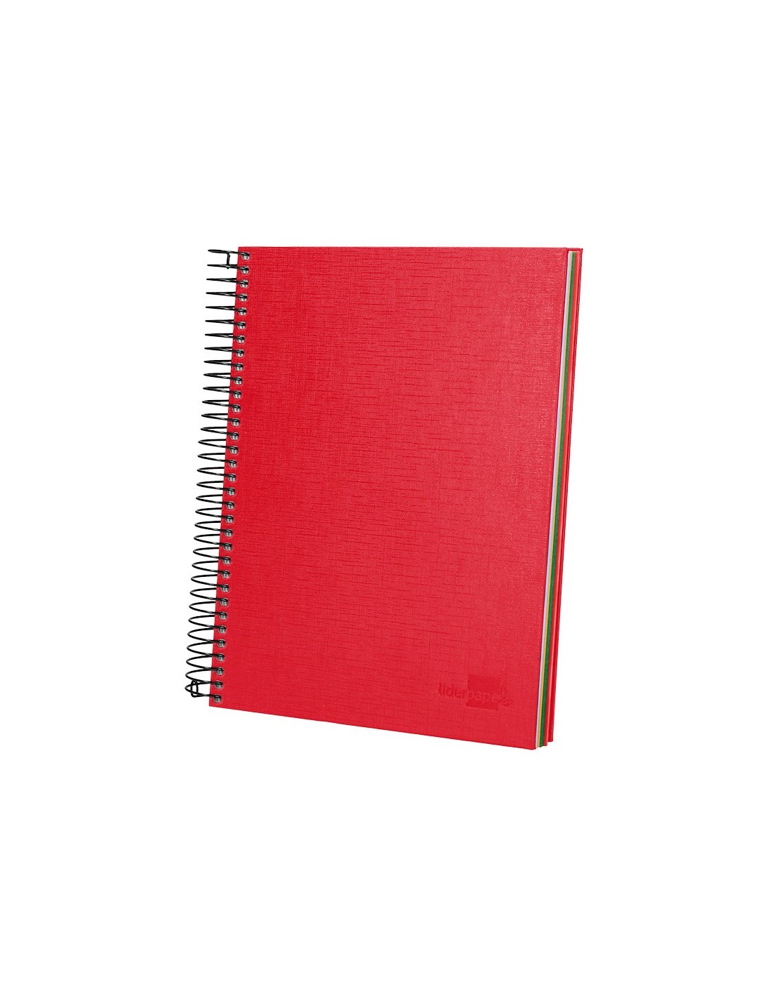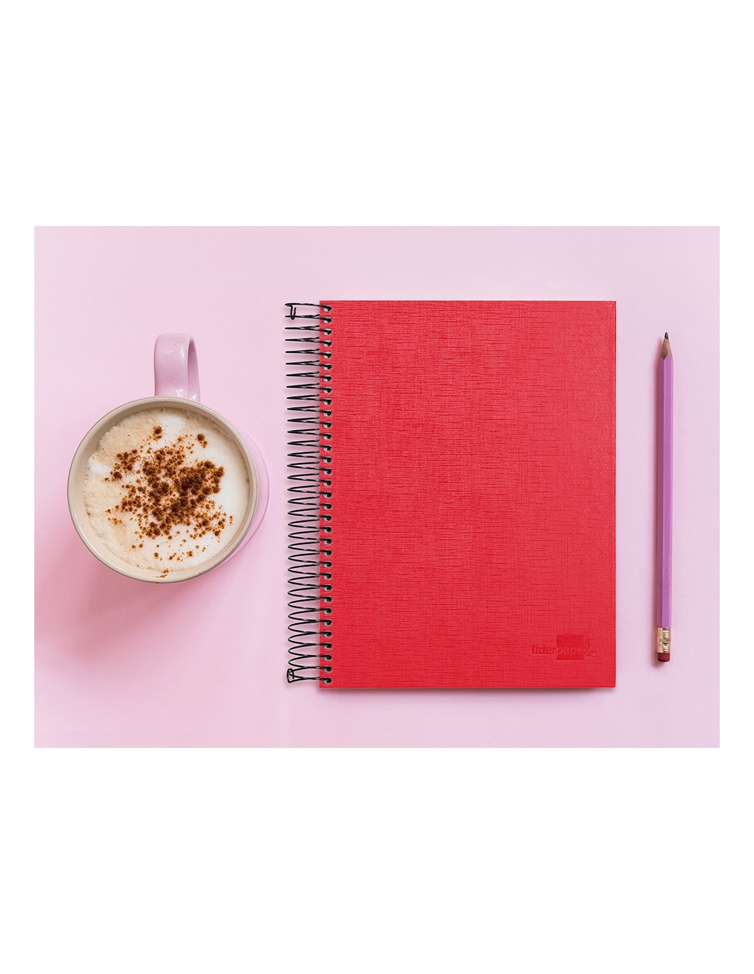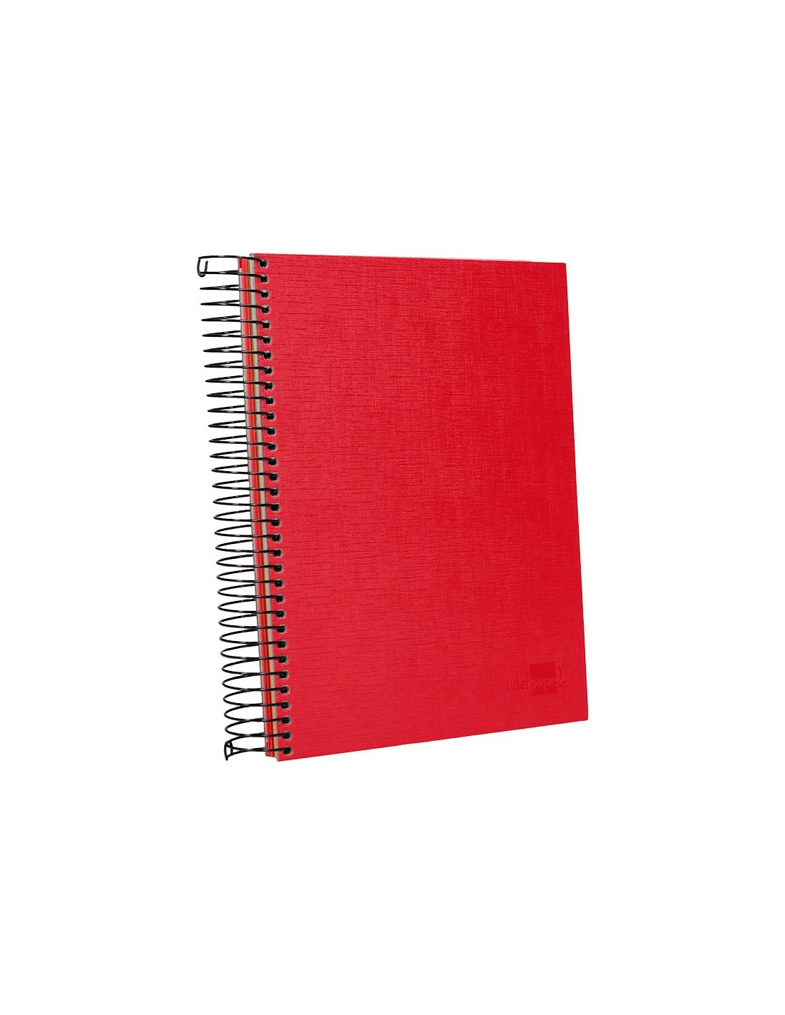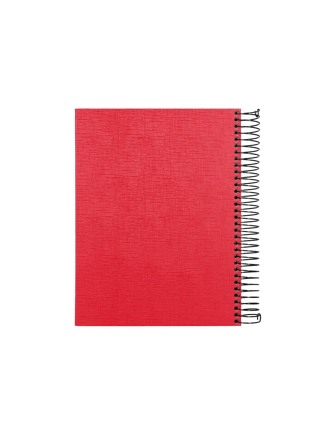 Tapa de cartón entrecolado de 1,50 mm de espesor, forrado con papel de encuadernación plastificado, gofrado tela en PVC. 140 hojas. Papel de 75 g/m². Bandas de 5 colores. Cuadrícula de 5 mm. Guarda interior impresa. Espiral nylonizada negra. Coil-lock.