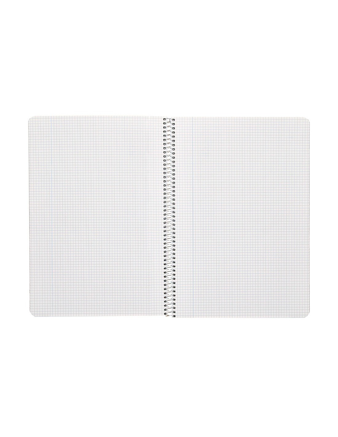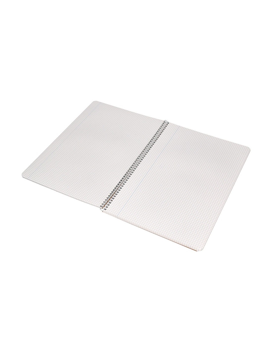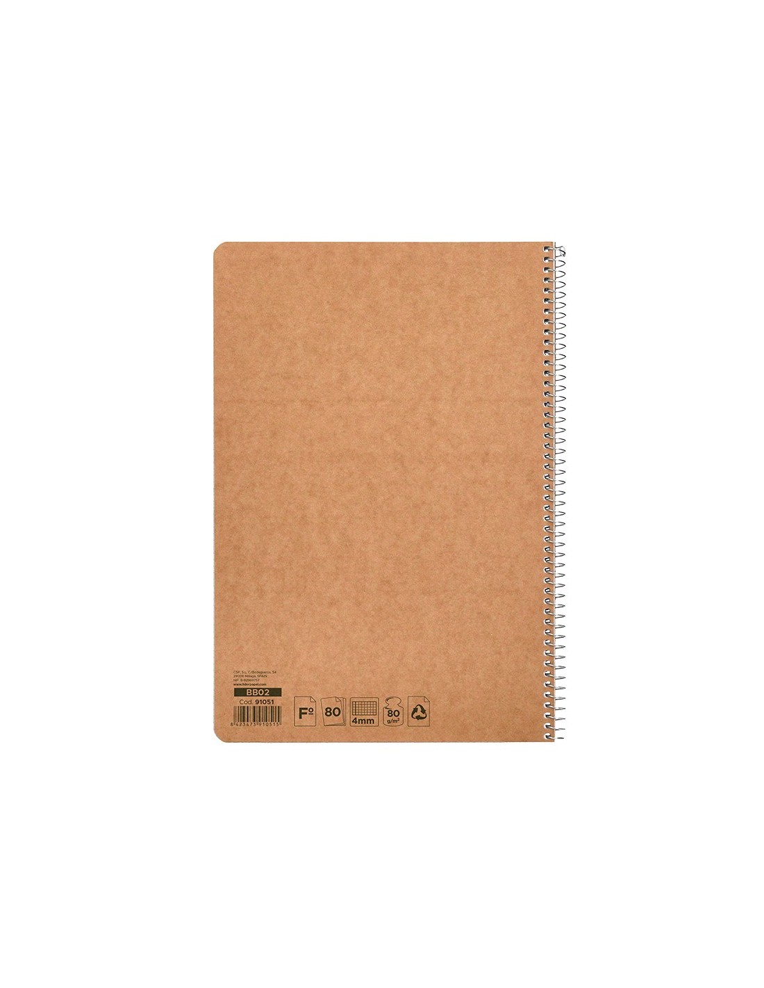 Tapa de cartoncillo fabricada en kraft de 400 g/m². Impresa. 80 hojas. Papel 100 % reciclado de 80 g/m². Espiral nylonizada plateada. Cuadrícula de 4 mm. Con margen. Coil-lock.