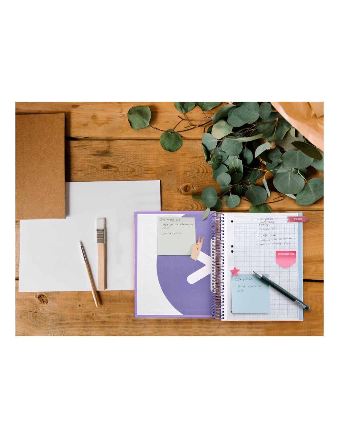 El cuaderno de más alta gama del mercado: exclusivo diseño, características inigualables, un cuaderno sin precedentes que se distingue por la suavidad y blancura de su papel, y además hace la escritura muy fluida. Tapa de cartón entrecolado de 1,5 mm de espesor, forrado a una cara con papel estucado mate extrasuave y reserva de barniz UVI. Guarda interior impresa. 100 y 120 hojas. Gran resistencia y rigidez. Papel extrablanco de 90 g/m², ultrasuave que hace la escritura mucho más fluida. La tinta no traspasa. 4 bandas de colores (formato A6) y 5 bandas de colores (formatos A5 y A4). Espiral nylonizada de colores. Coil-lock.