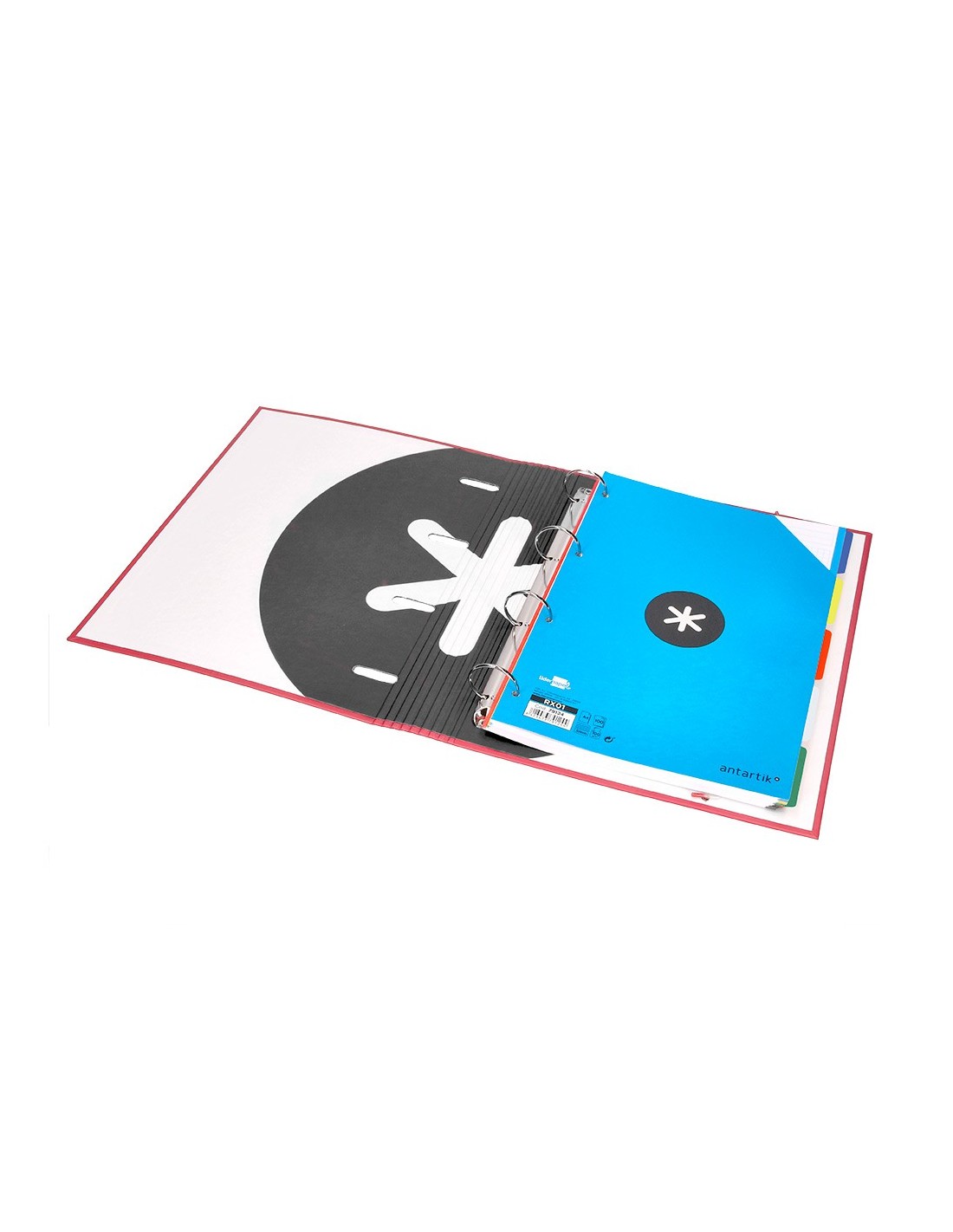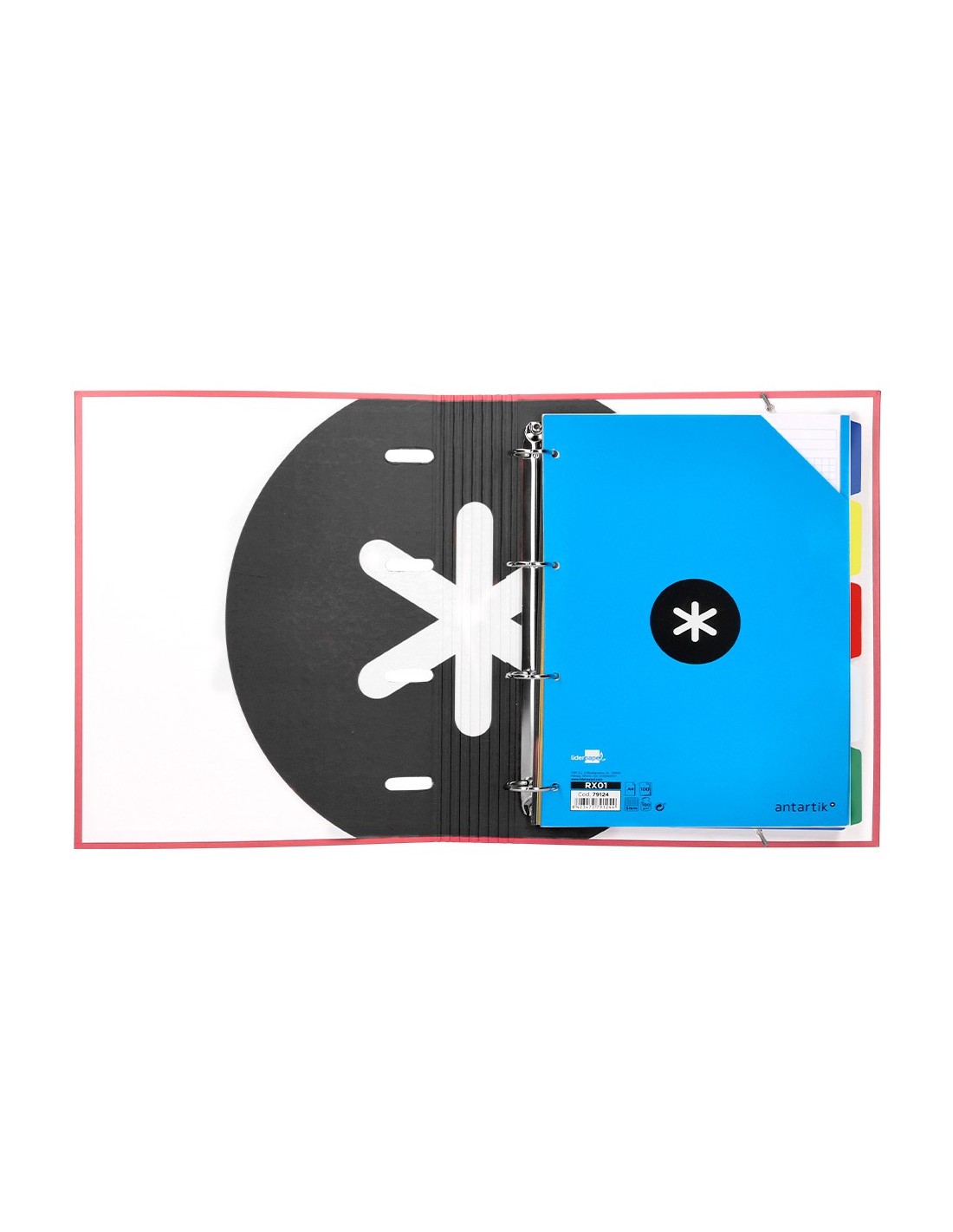 TAPA DE CARTÓN FORRADO DE 1,75 MM DE ESPESOR. FORRADA EN PAPEL ESTUCADO MATE DE 135 G/M² IMPRESO. PLASTIFICADA MATE CON DETALLES BARNIZ UVI. 4 ANILLAS REDONDAS. CIERRE DE GOMILLA. CON RANURAS PARA ANILLAS. 100 HOJAS CON 5 BANDAS DE COLOR Y 4 TALADROS. PAPEL INTERIOR EXTRABLANCO DE 90 G/M². ULTR ASUAVE. CUADRÍCULA DE 5 MM. FORMATO DIN A4. GUARDA INTERIOR IMPRESA. LOMO REDONDO, CON SEPARADOR INTERIOR Y SOLAPA.