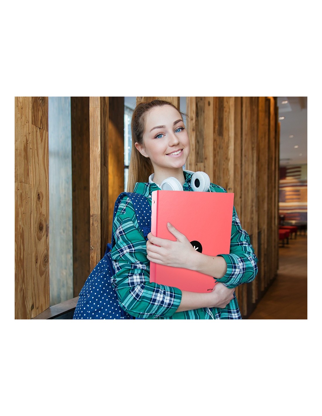 Carpeta fabricada en cartón forrado de 1,5 mm de espesor. Forrada en papel estucado de 135 g/m² impreso. Plastificada mate con detalles en barniz UVI. Con 4 anillas redondas de 25 mm. Guarda interior impresa. Formato DIN A4.