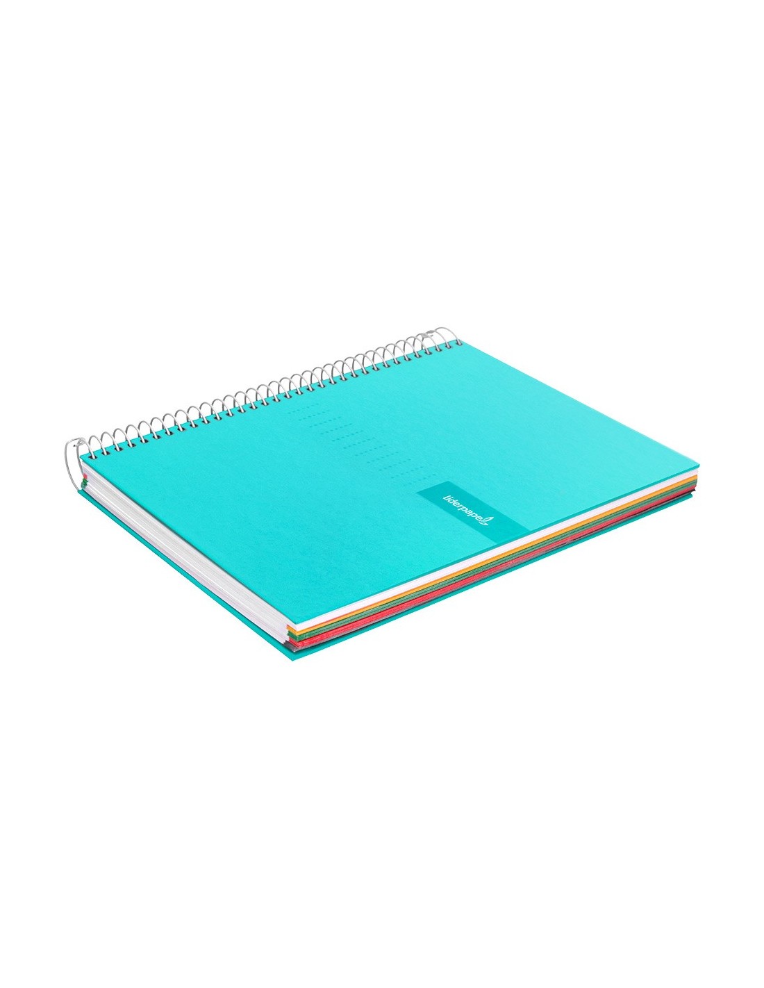 Tapa de cartón entrecolado de 1,5 mm de espesor, forrado con papel estucado mate de 1,35 g/m². Guarda interior impresa y plastificada. Papel de 90 g/m ². Espiral nylonizada. Coil-lock.