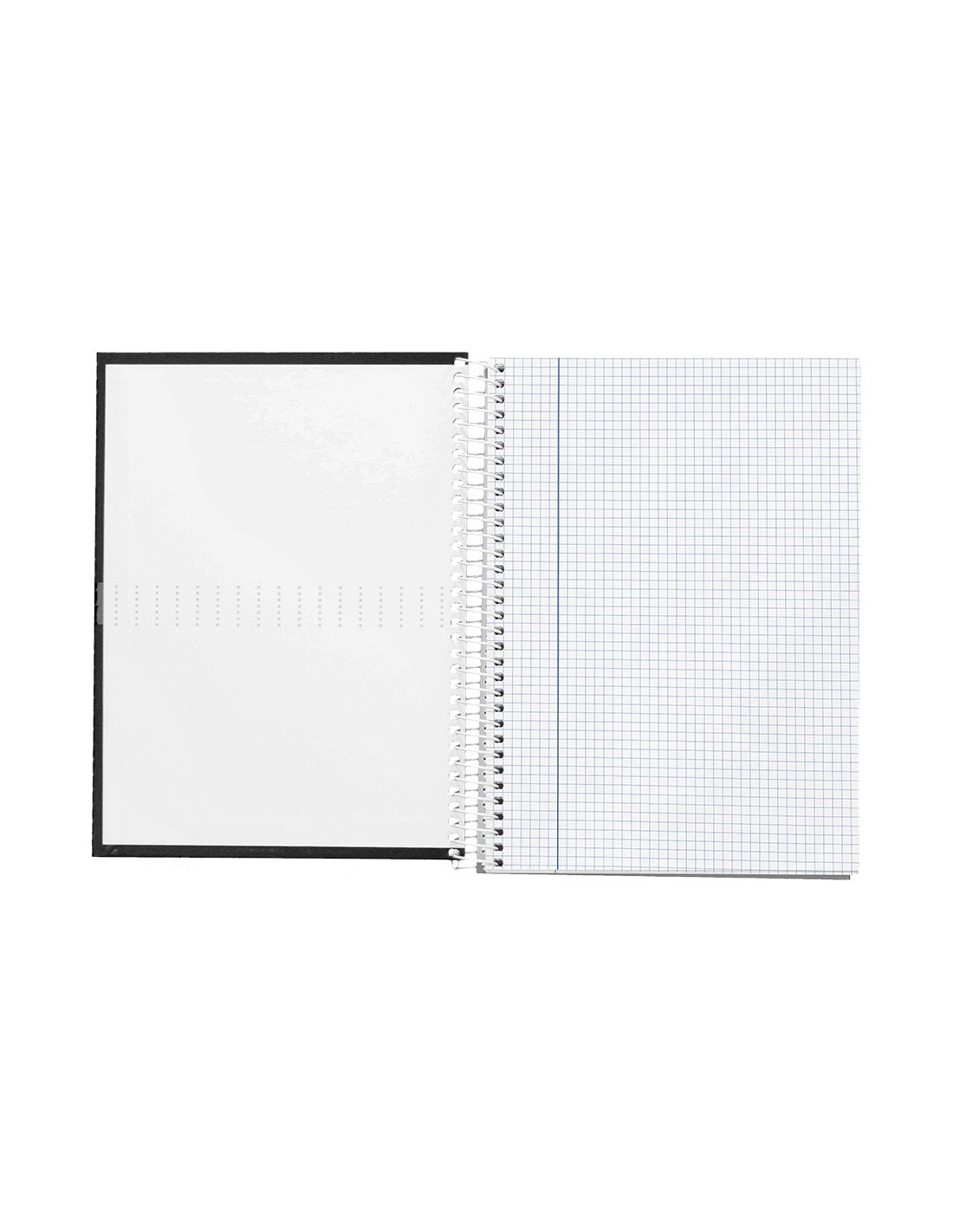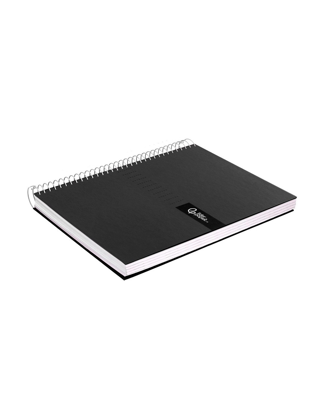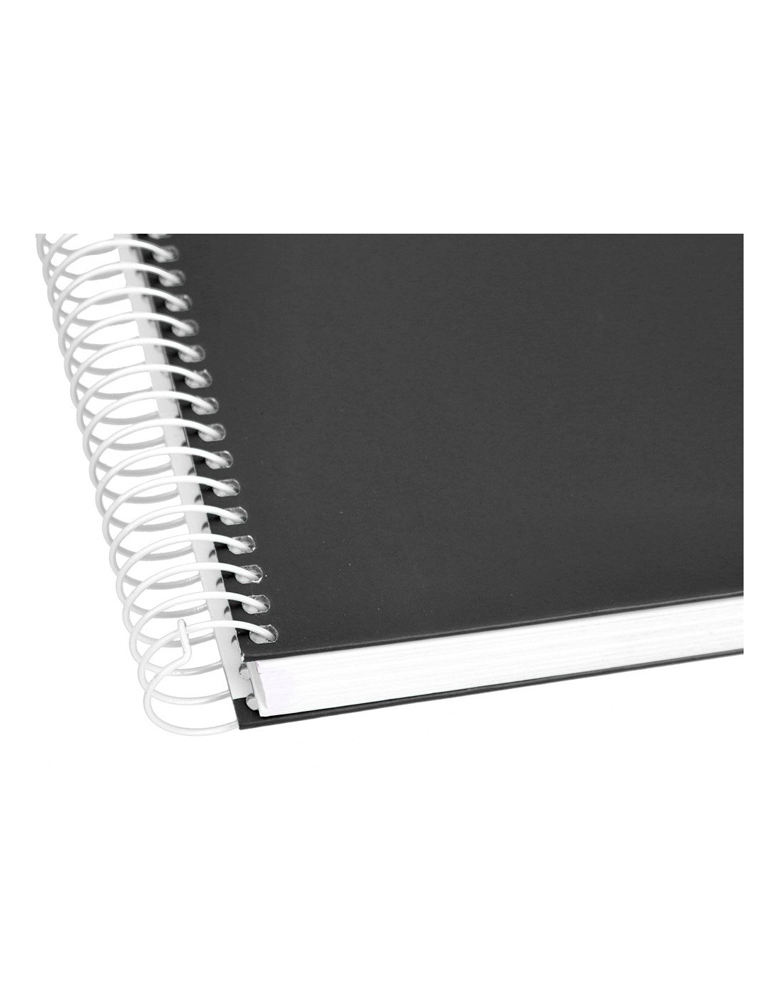 Tapa de cartón entrecolado de 1,5 mm de espesor, forrado con papel estucado mate de 1,35 g/m². Guarda interior impresa y plastificada. Papel de 90 g/m ². Espiral nylonizada. Coil-lock.