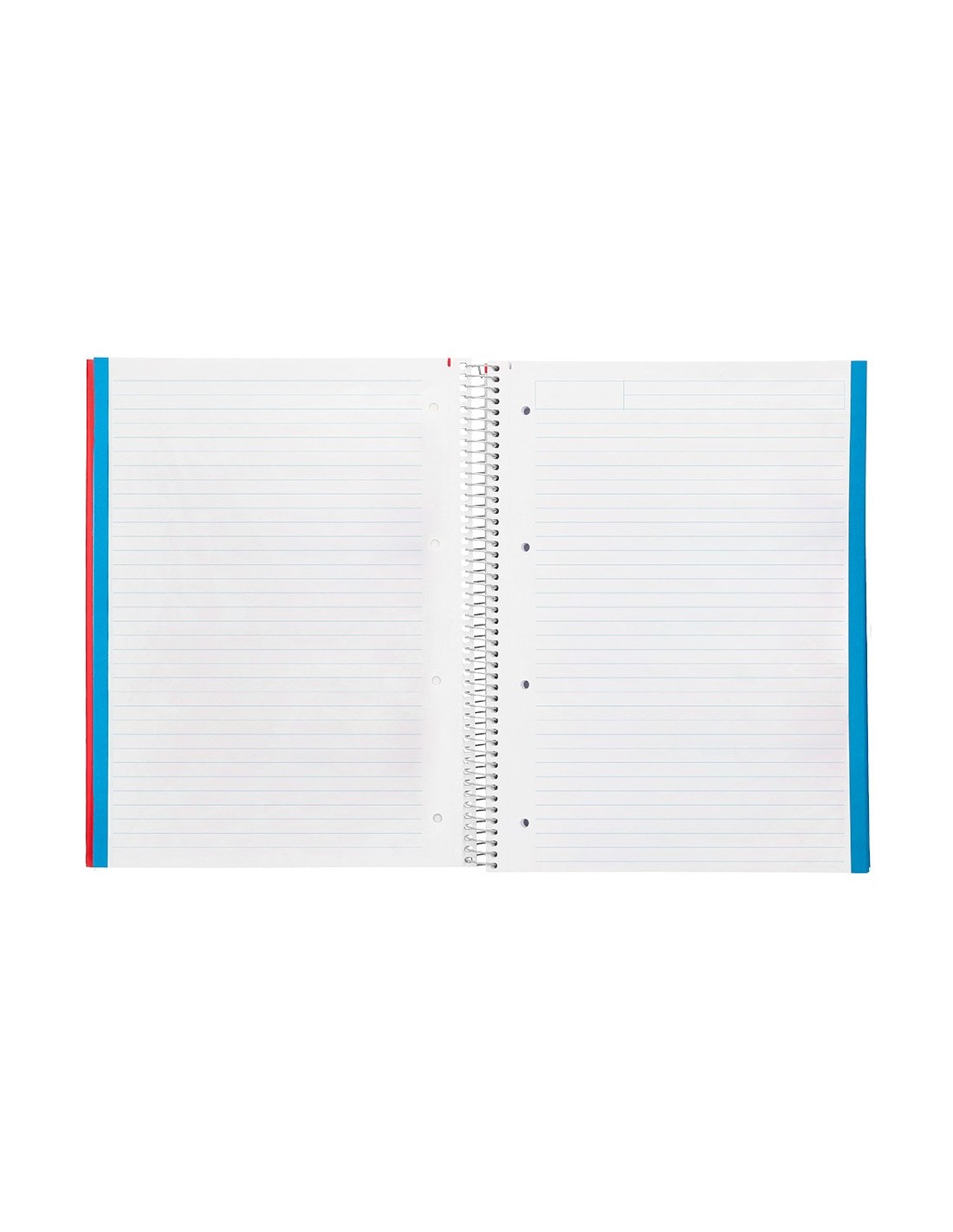 Tapa de cartón entrecolado de 1,5 mm de espesor, forrado con papel estucado mate de 135 g/m². Guarda interior blanca. Papel de 75 g/m ². Microperforado. 140 hojas. Bandas de 5 colores. Con cajetín. Espiral nylonizada. Coil-lock.