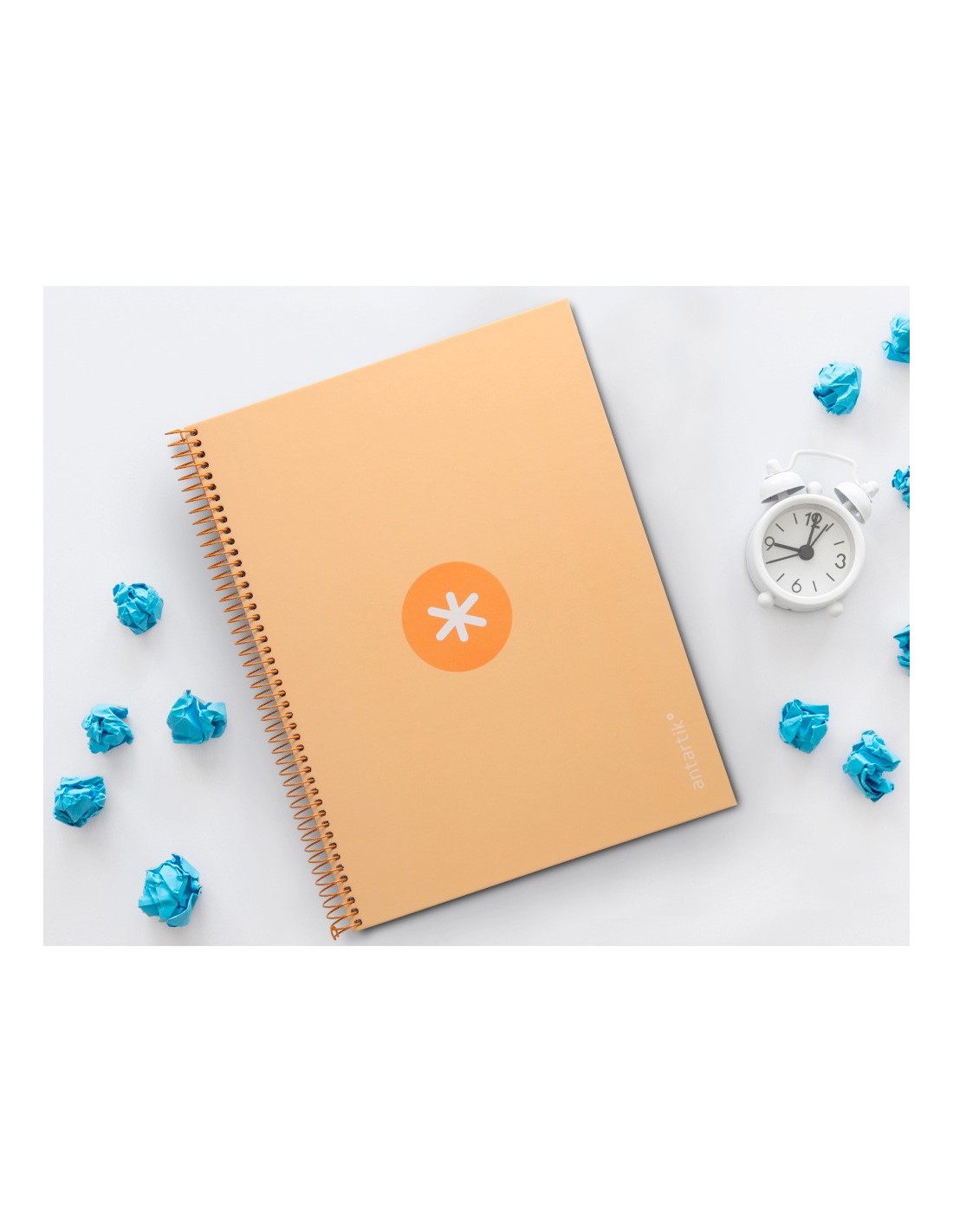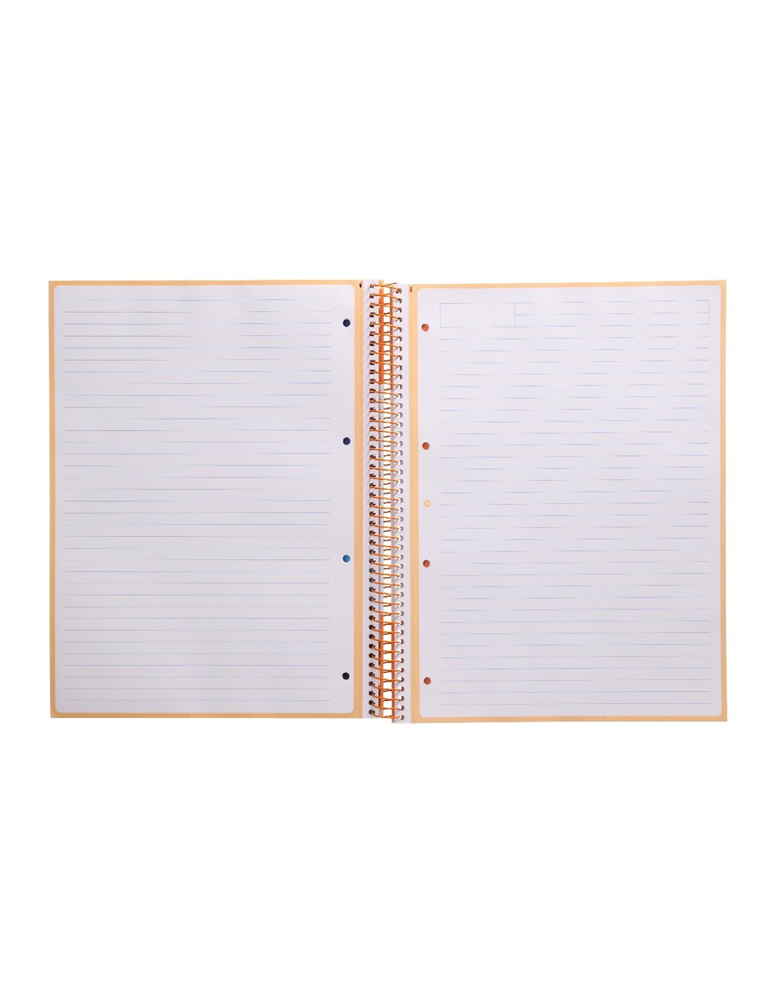 El cuaderno de más alta gama del mercado: exclusivo diseño, características inigualables, un cuaderno sin precedentes que se distingue por la suavidad y blancura de su papel, y además hace la escritura muy fluida. Tapa de cartón entrecolado de 1,5 mm de espesor, forrado a una cara con papel estucado mate extrasuave y reserva de barniz UVI. Guarda interior impresa. 100 y 120 hojas. Gran resistencia y rigidez. Papel extrablanco de 100 g/m², ultrasuave que hace la escritura mucho más fluida. La tinta no traspasa. 4 bandas de colores (formato A6) y 5 bandas de colores (formatos A5 y A4). Espiral nylonizada de colores. Coil-lock.
