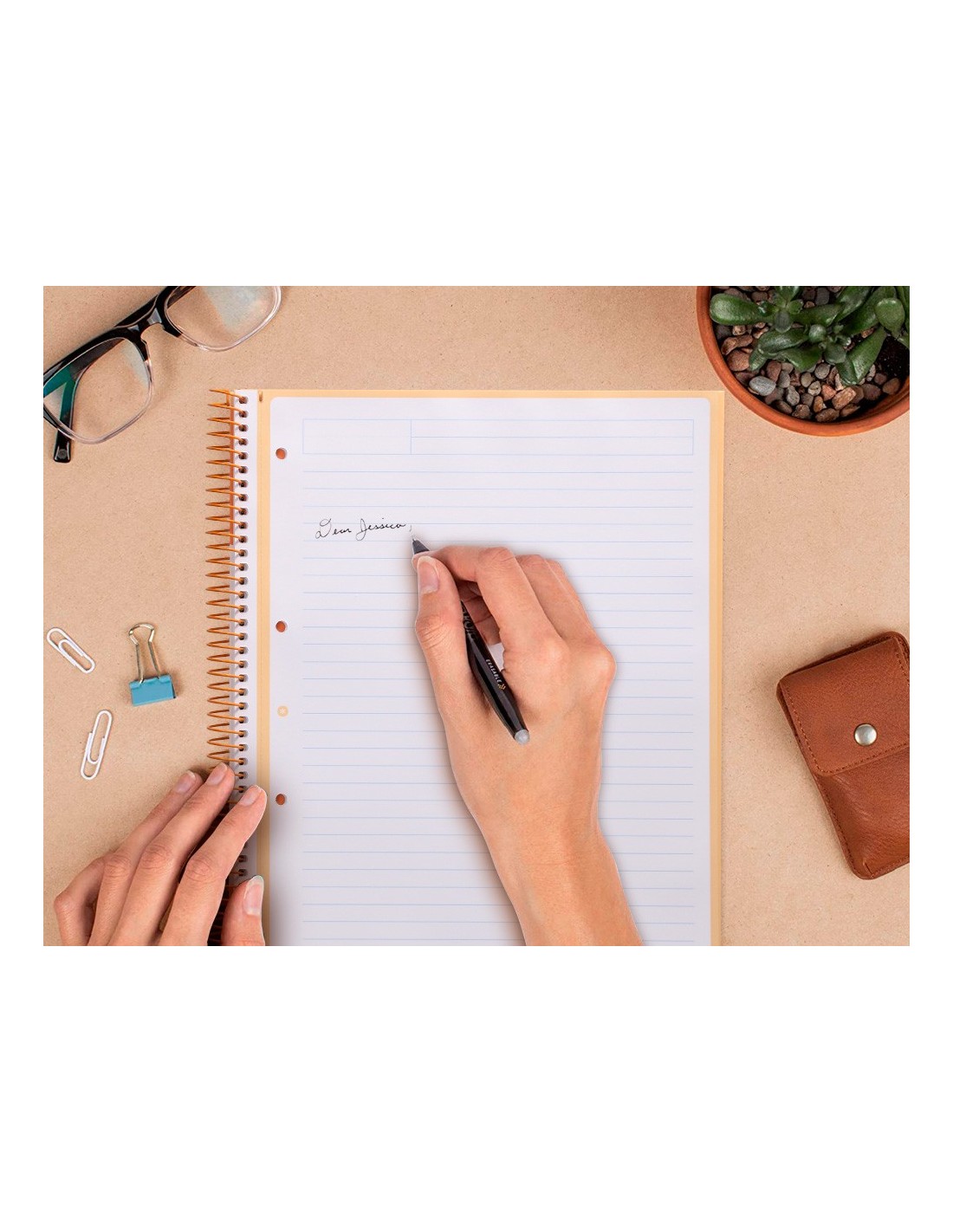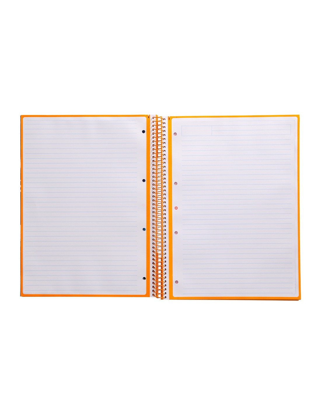 El cuaderno de más alta gama del mercado: exclusivo diseño, características inigualables, un cuaderno sin precedentes que se distingue por la suavidad y blancura de su papel, y además hace la escritura muy fluida. Tapa de cartón entrecolado de 1,5 mm de espesor, forrado a una cara con papel estucado mate extrasuave y reserva de barniz UVI. Guarda interior impresa. 100 y 120 hojas. Gran resistencia y rigidez. Papel extrablanco de 100 g/m², ultrasuave que hace la escritura mucho más fluida. La tinta no traspasa. 4 bandas de colores (formato A6) y 5 bandas de colores (formatos A5 y A4). Espiral nylonizada de colores. Coil-lock.