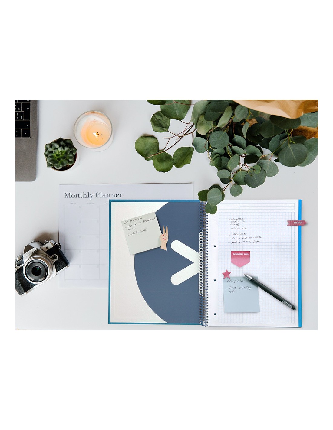El cuaderno de más alta gama del mercado: exclusivo diseño, características inigualables, un cuaderno sin precedentes que se distingue por la suavidad y blancura de su papel, y además hace la escritura muy fluida. Tapa de cartón entrecolado de 1,5 mm de espesor, forrado a una cara con papel estucado mate extrasuave y reserva de barniz UVI. Guarda interior impresa. 100 y 120 hojas. Gran resistencia y rigidez. Papel extrablanco de 90 g/m², u ltrasuave que hace la escritura mucho más fluida. La tinta no traspasa. 4 bandas de colores (formato A6) y 5 bandas de colores (formatos A5 y A4). Espiral nylonizada de colores. Coil-lock.