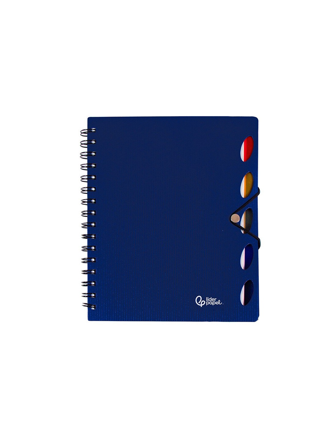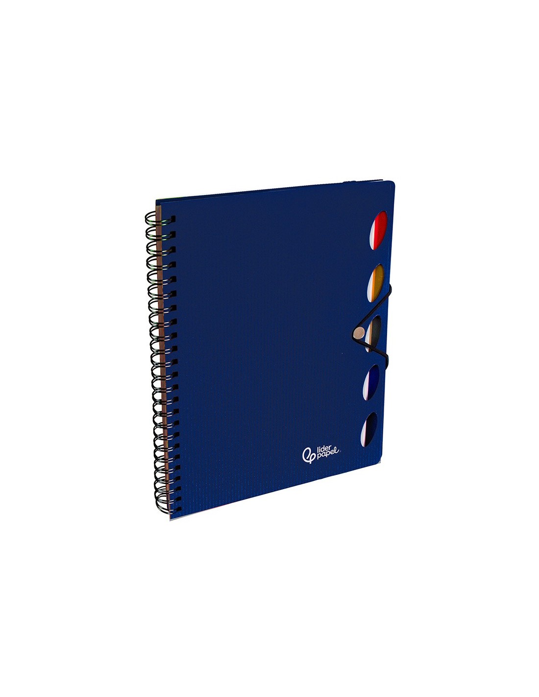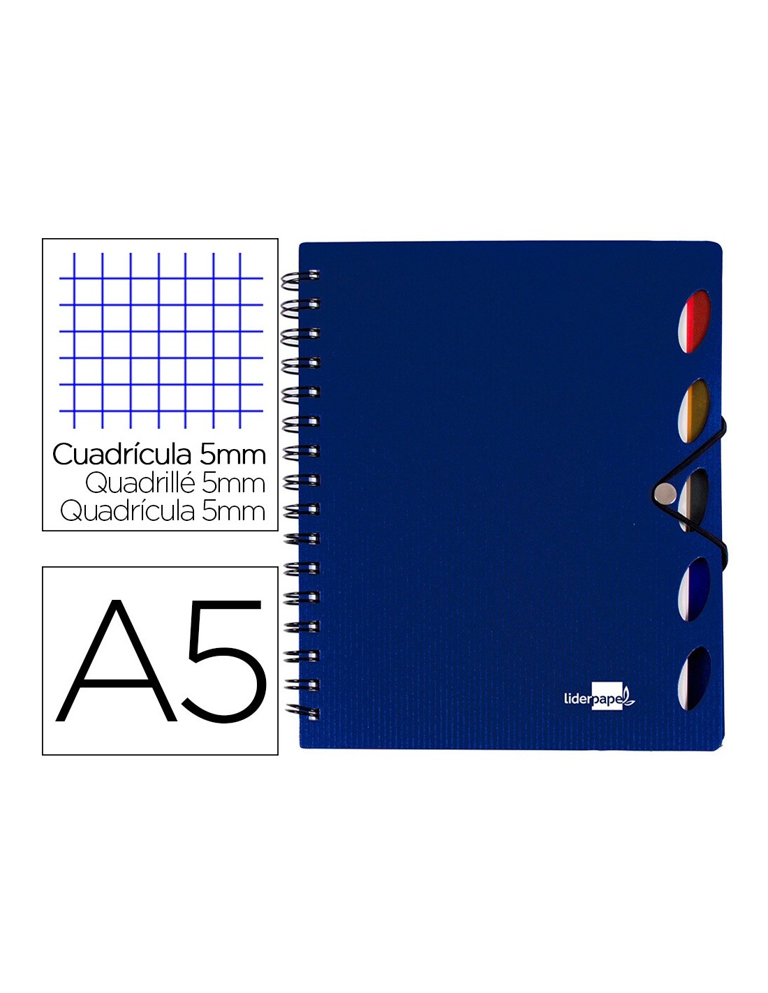 Tapa de polipropileno de 1650 micras de espesor extrarresistente metalizada. 100 hojas. Papel de 80 g/m². Cuadrícula de 5 mm. Microperforado. Doble espiral nylonizada color negro. 5 separadores intercambiables. 5 índices de color. Cierre de gomilla con elástico y sujeción metálica.