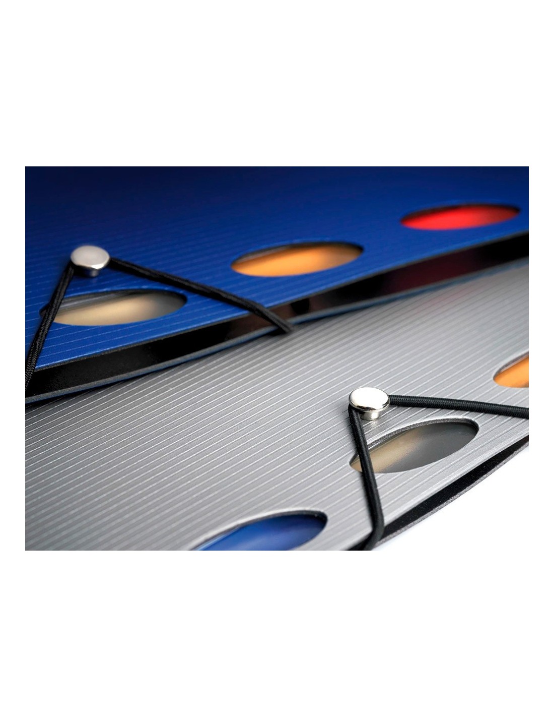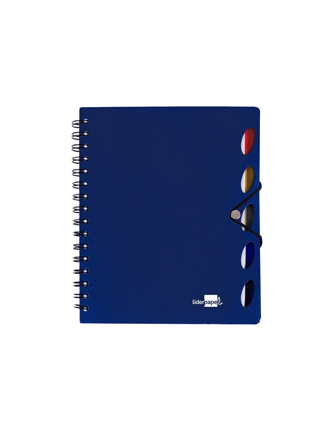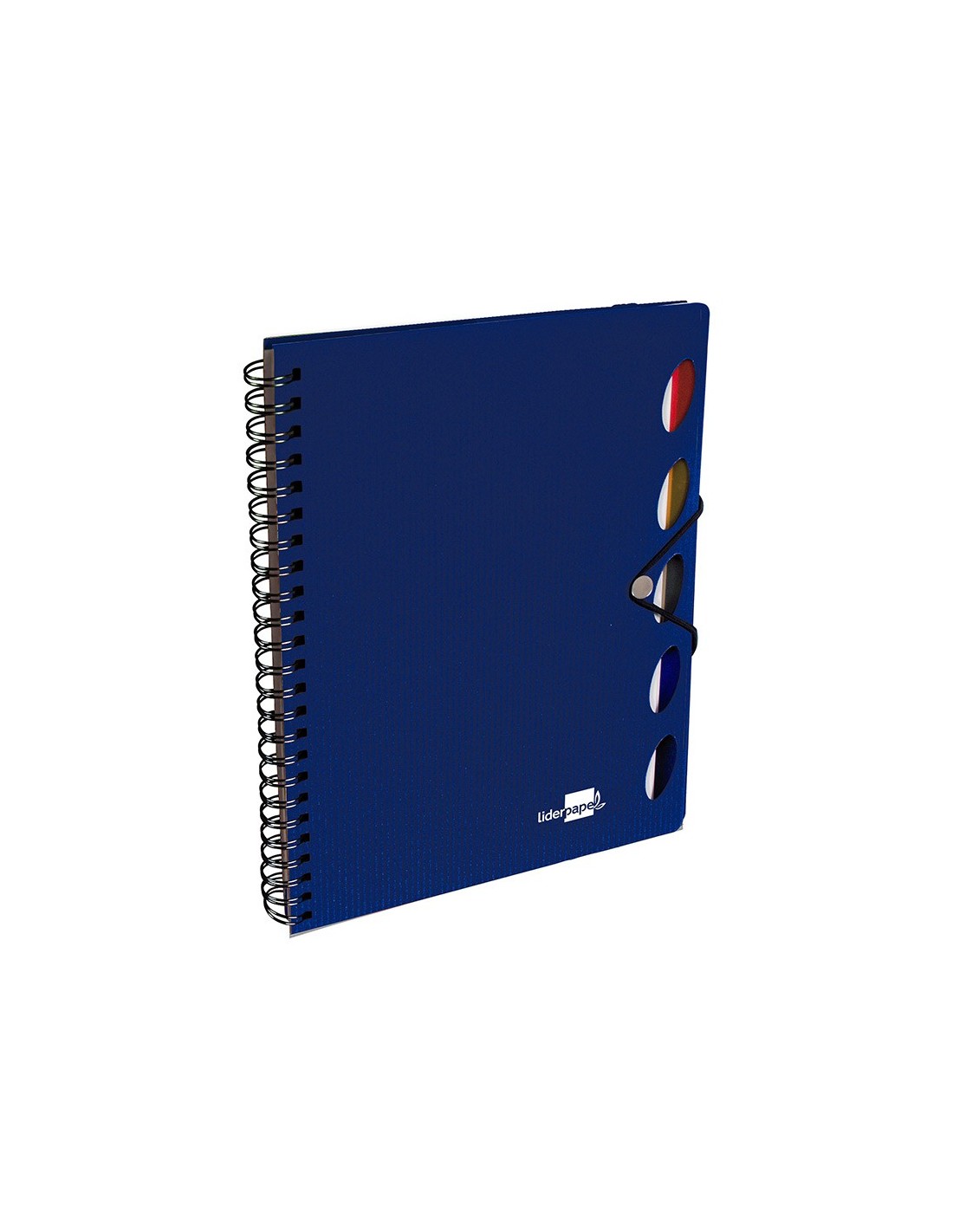 Tapa de polipropileno de 1650 micras de espesor extrarresistente metalizada. 100 hojas. Papel de 80 g/m². Cuadrícula de 5 mm. Microperforado. Doble espiral nylonizada color negro. 5 separadores intercambiables. 5 índices de color. Cierre de gomilla con elástico y sujeción metálica.