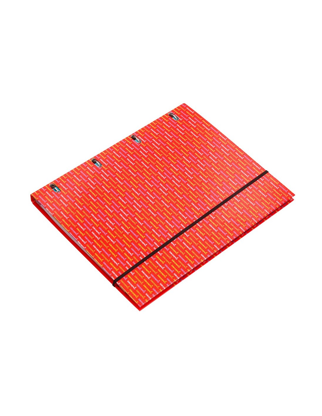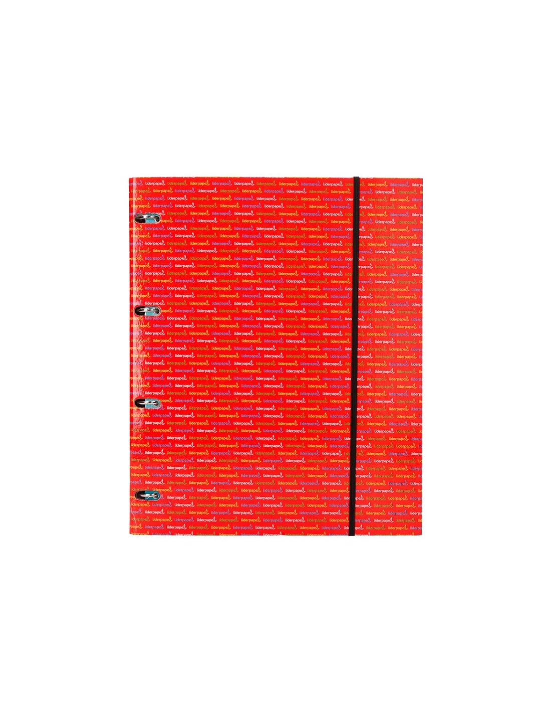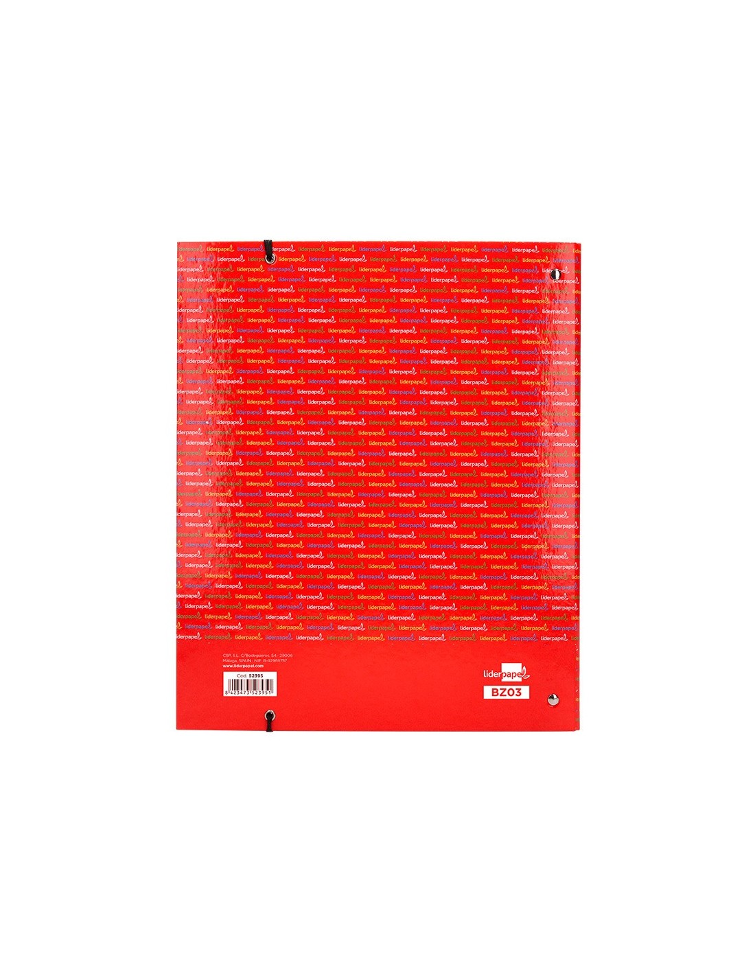 Tapa de cartón forrada de 1,75 mm de espesor. 4 anillas redondas de 20 mm. Cierre de gomilla. Con ranuras para anillas. Lomo de 20 mm. 120 hojas con 5 bandas de colores. Papel interior de 80 g/m². Cuadrícula 5 mm. Guarda interior impresa. Colores surtidos: azul, blanco, celeste, naranja, rojo y verde.