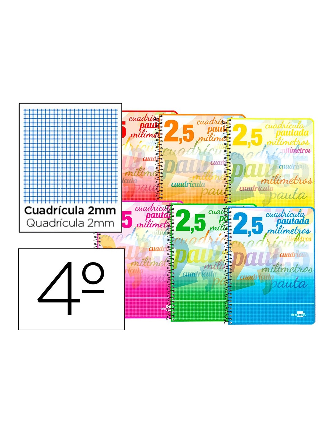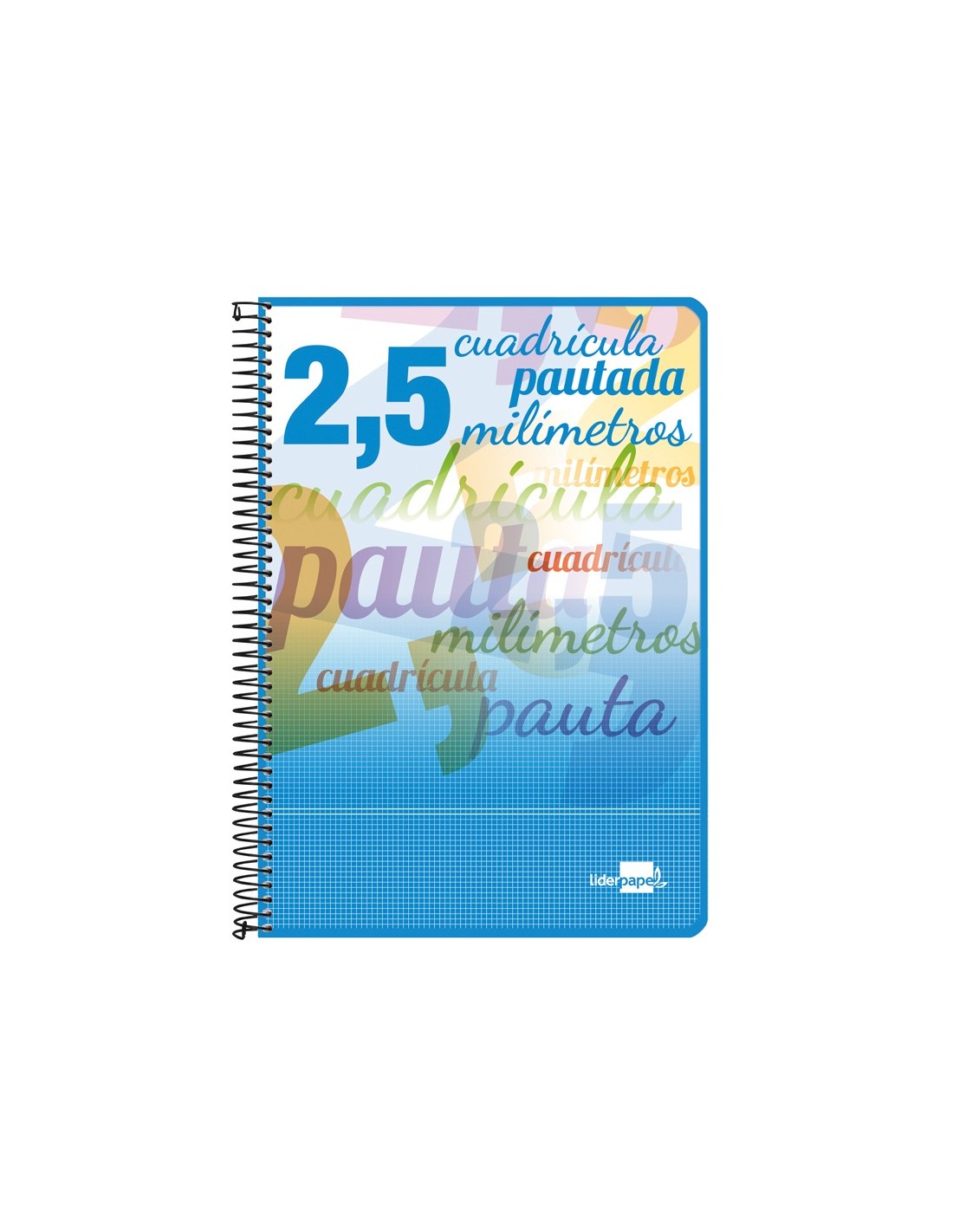 Tapa de cartoncillo impresa y plastificada brillo con relieve. Cuadrícula pautada en su interior que marca en cada línea el inicio de la escritura. Contratapa de cartoncillo. Papel de 80 g/m².