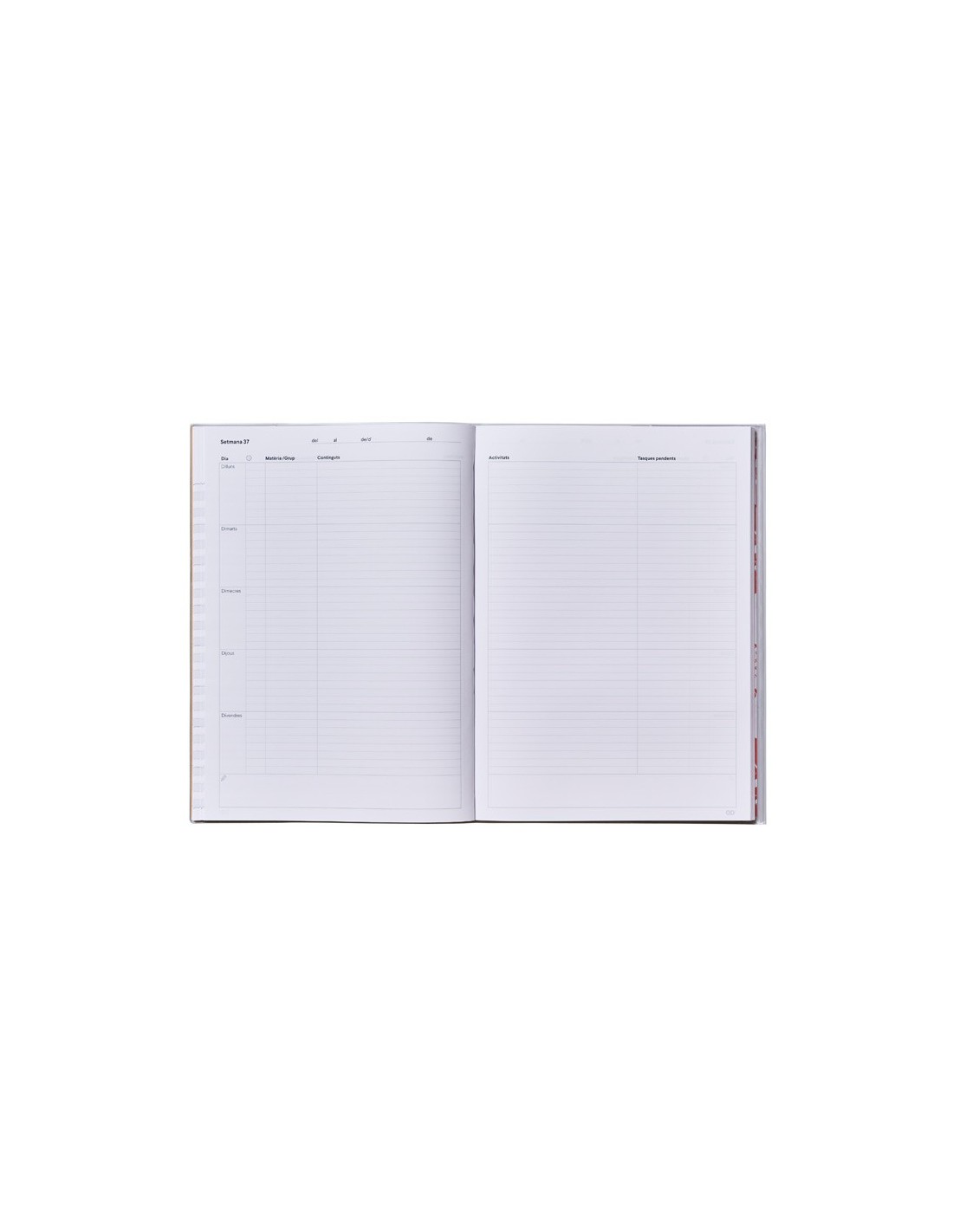Bloc para la planificación semanal y evaluación contínua. Contenido: horario, evaluación continua, planificación semanal para todo el curso (2 páginas por semana) y webs de interés. Incluye funda con solapa multihendido para máxima carga de papeles, calendario de curso y etiquetas autoadhesivas para la lista de alumnos. Colores surtidos. Formato Din A4.