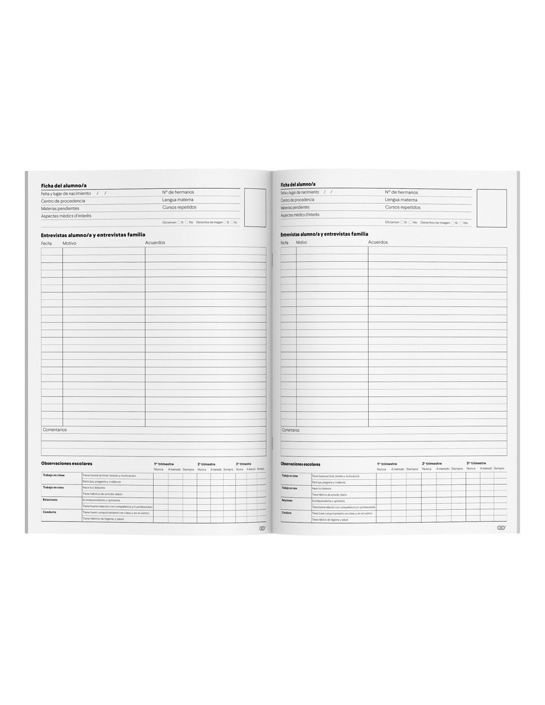 Bloc para la tutoría. Contenido: horario del profesor/a y del grupo, plano de la clase, calendario de evaluaciones, tutoría, datos de los alumnos, asistencia por meses, calendario de entrevistas, fichas individuales de los alumnos (36), reuniones, valoración de los resultados del grupo, fotografías del grupo. Con funda portadocumentos y calendario. Colores surtidos. Formato Din A4.