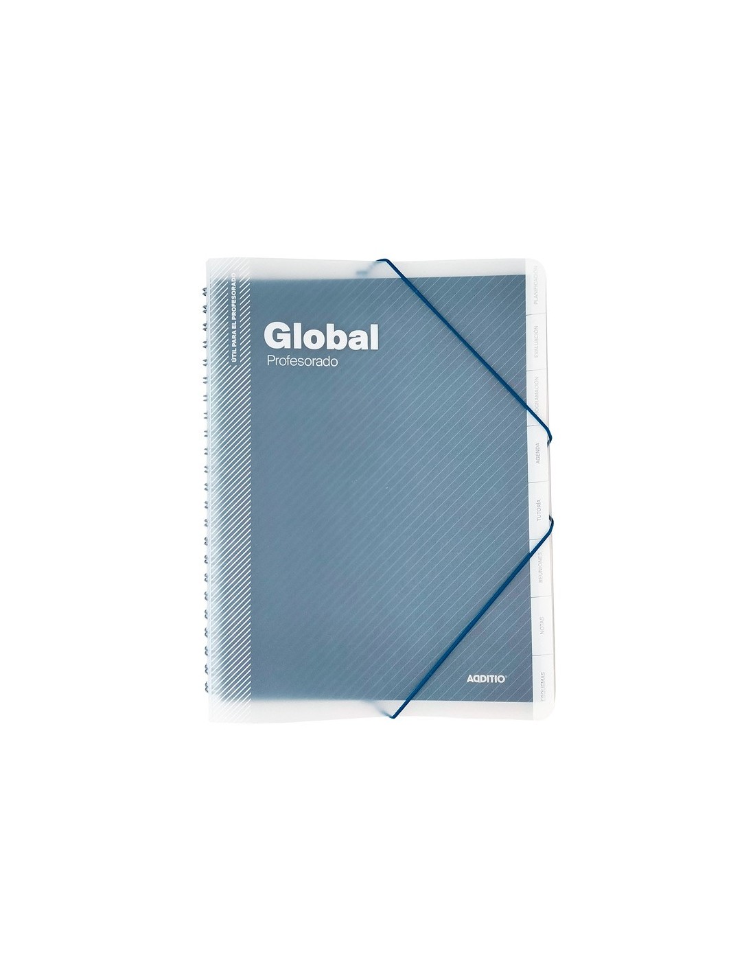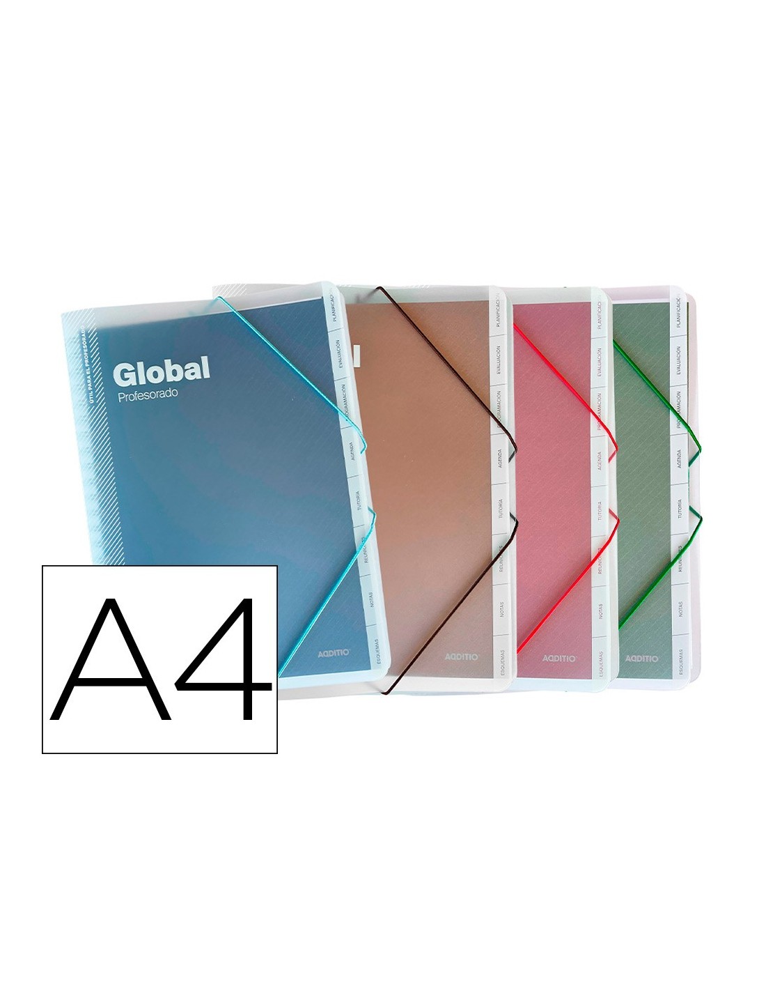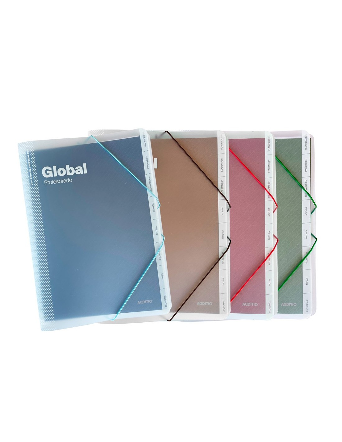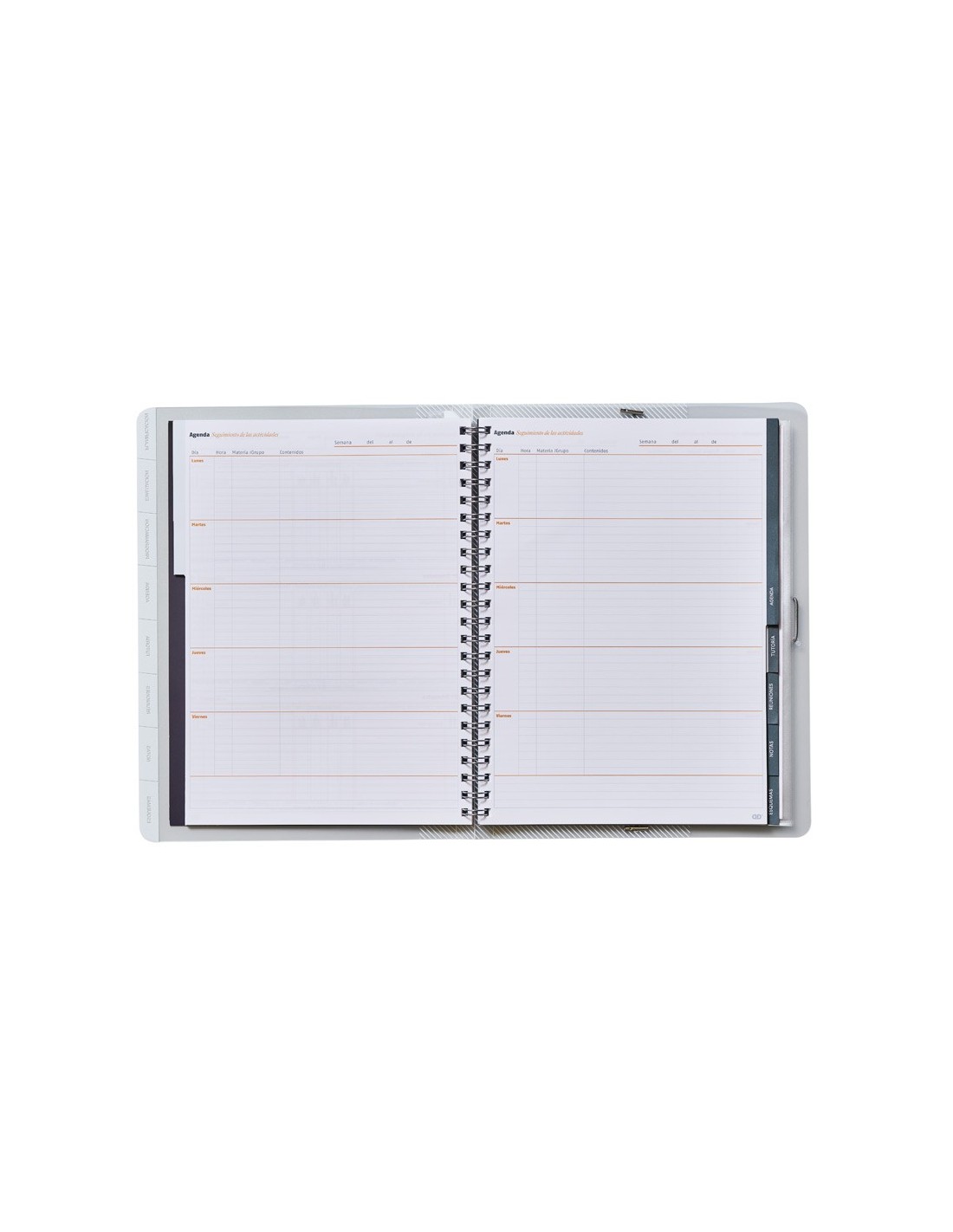 Carpeta con organización por pestañas. Contenido: datos personales y horario, planificación mensual, evaluación continua, registro de la programación, agenda (40 semanas), tutoría, reuniones. Con doble espiral, regla marca páginas, fundas de polipropileno y etiquetas autoadhesivas para la lista de alumnos. Tamaño 24 x 32 cm.