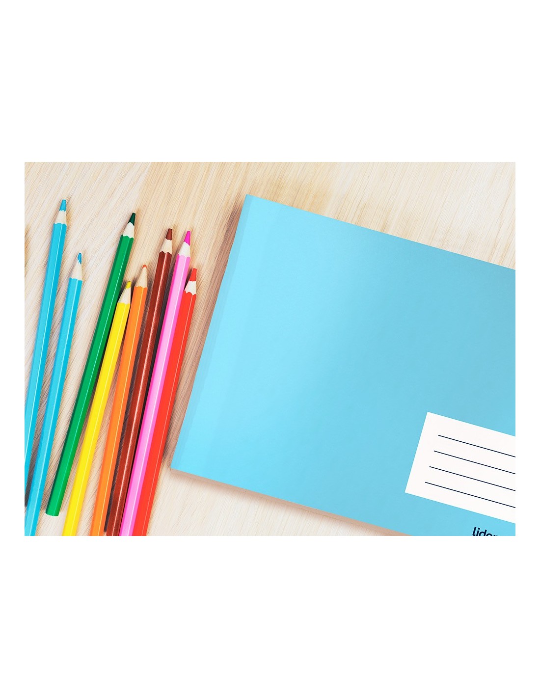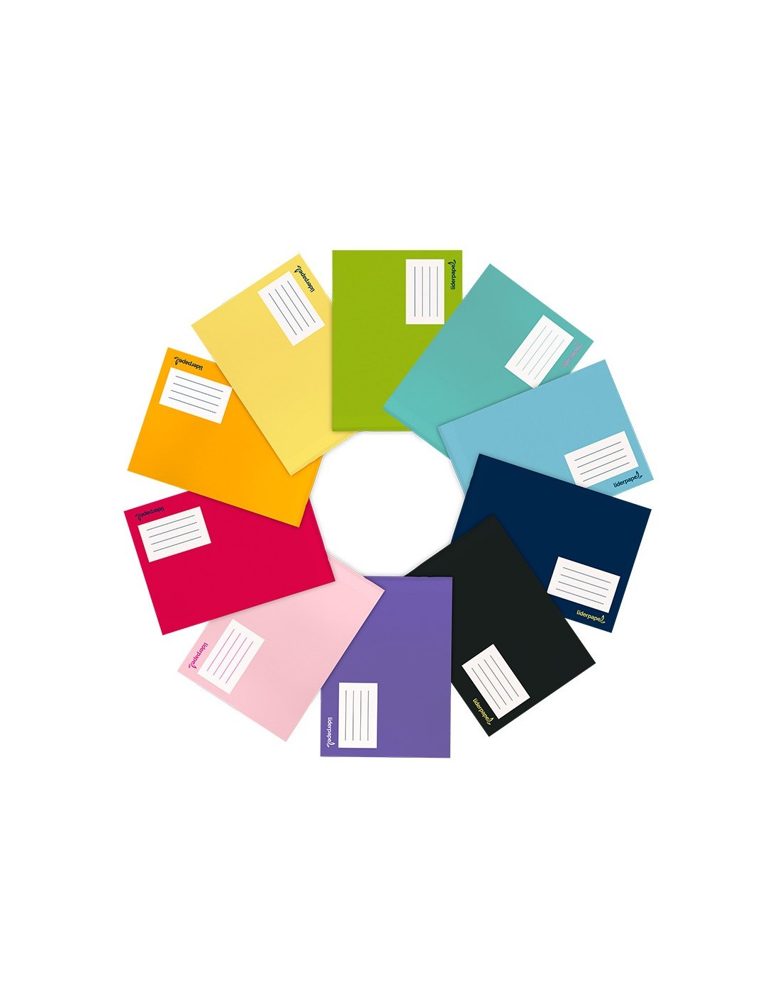 Tapa de 250 g/m² fabricada en cartoncillo impreso y plastificado brillo. Papel de 60 g/m². Contienen etiqueta en la portada para rellenar con datos. Con margen. Colores surtidos.