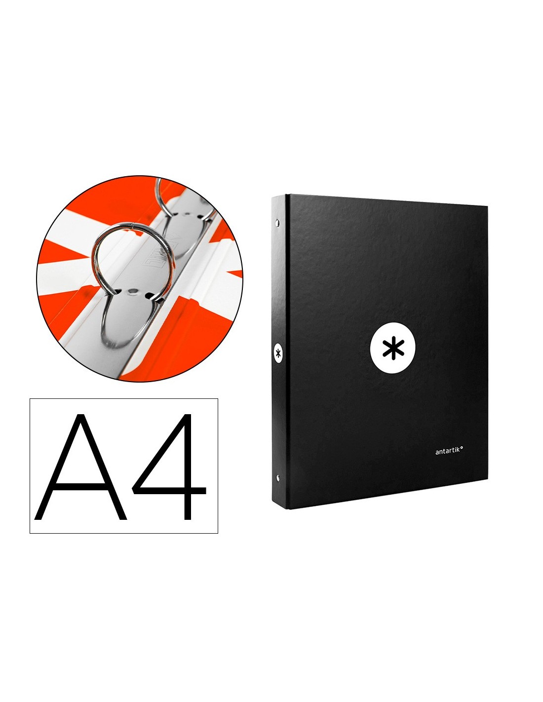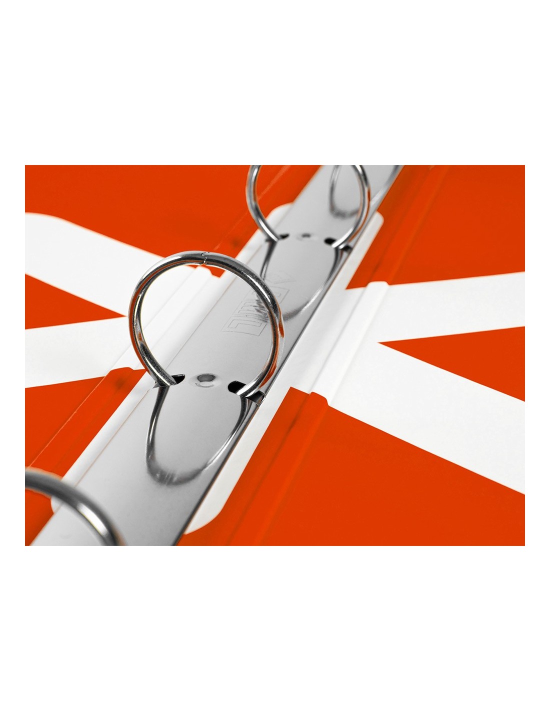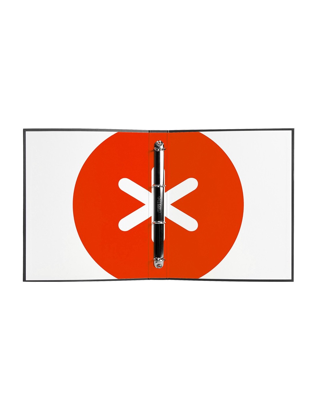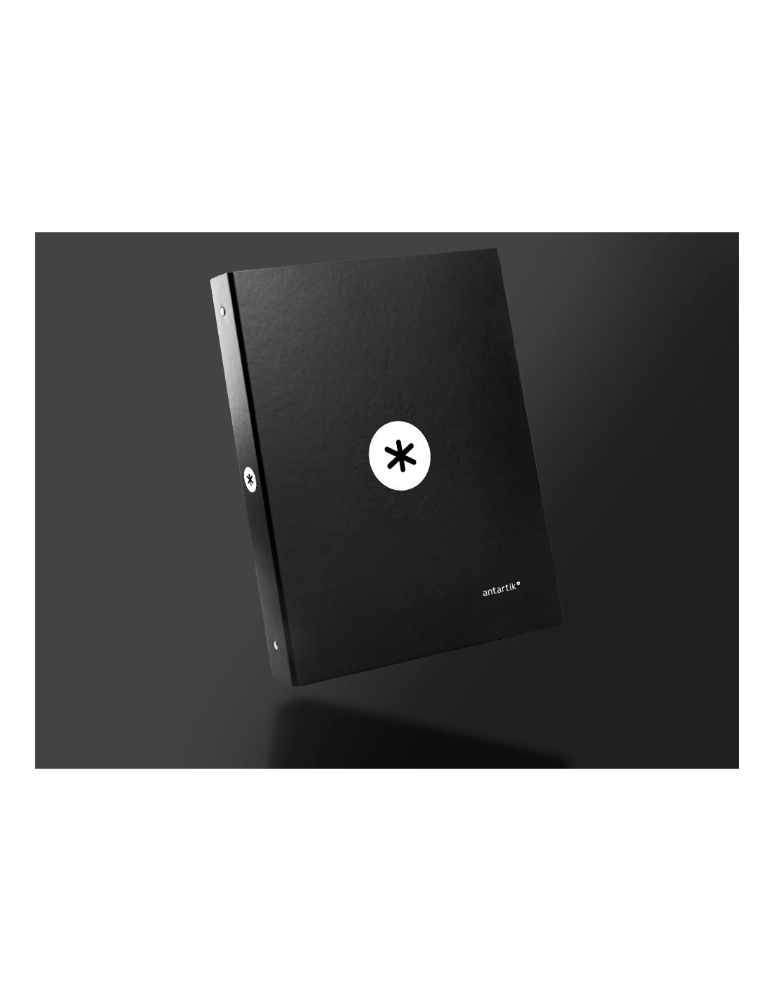 Carpeta fabricada en cartón forrado de 1,5 mm de espesor. Forrada en papel estucado de 135 g/m² impreso. Plastificada mate con detalles en barniz UVI. Con 4 anillas redondas de 25 mm. Guarda interior impresa. Formato DIN A4.