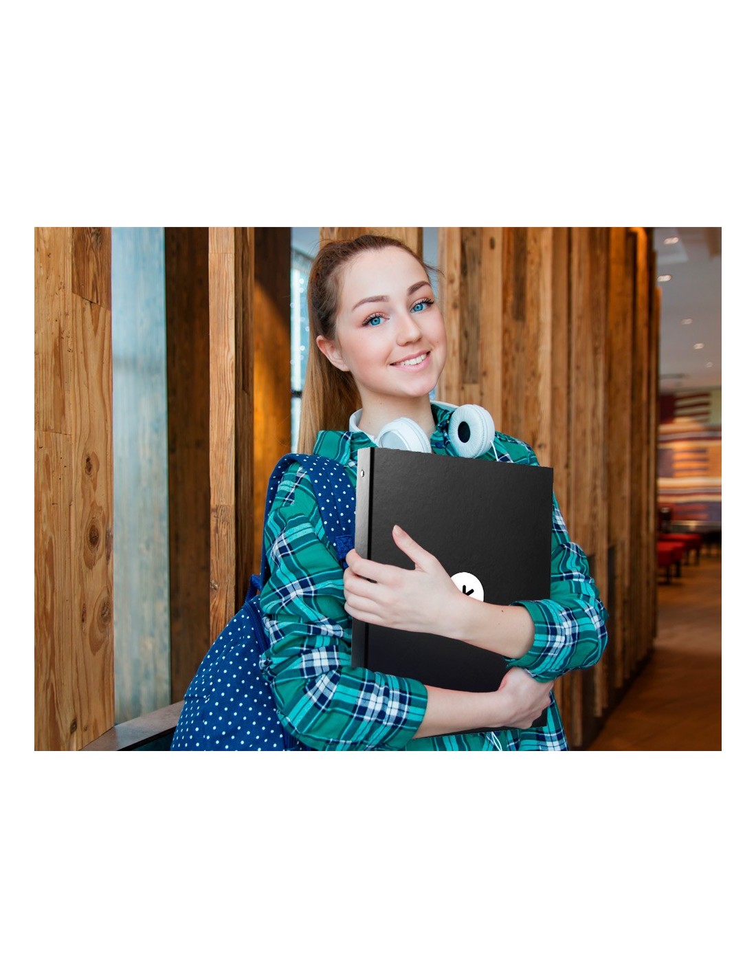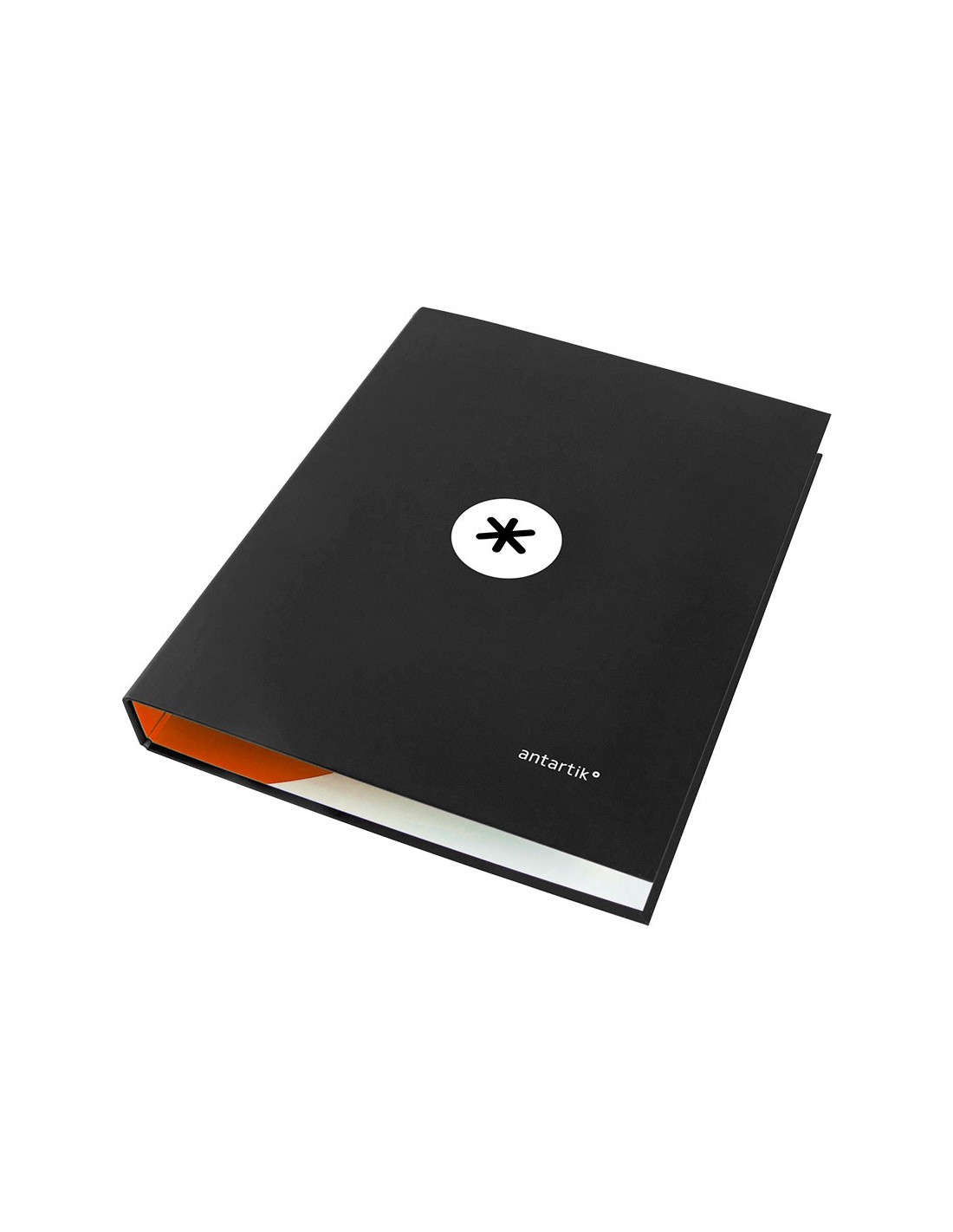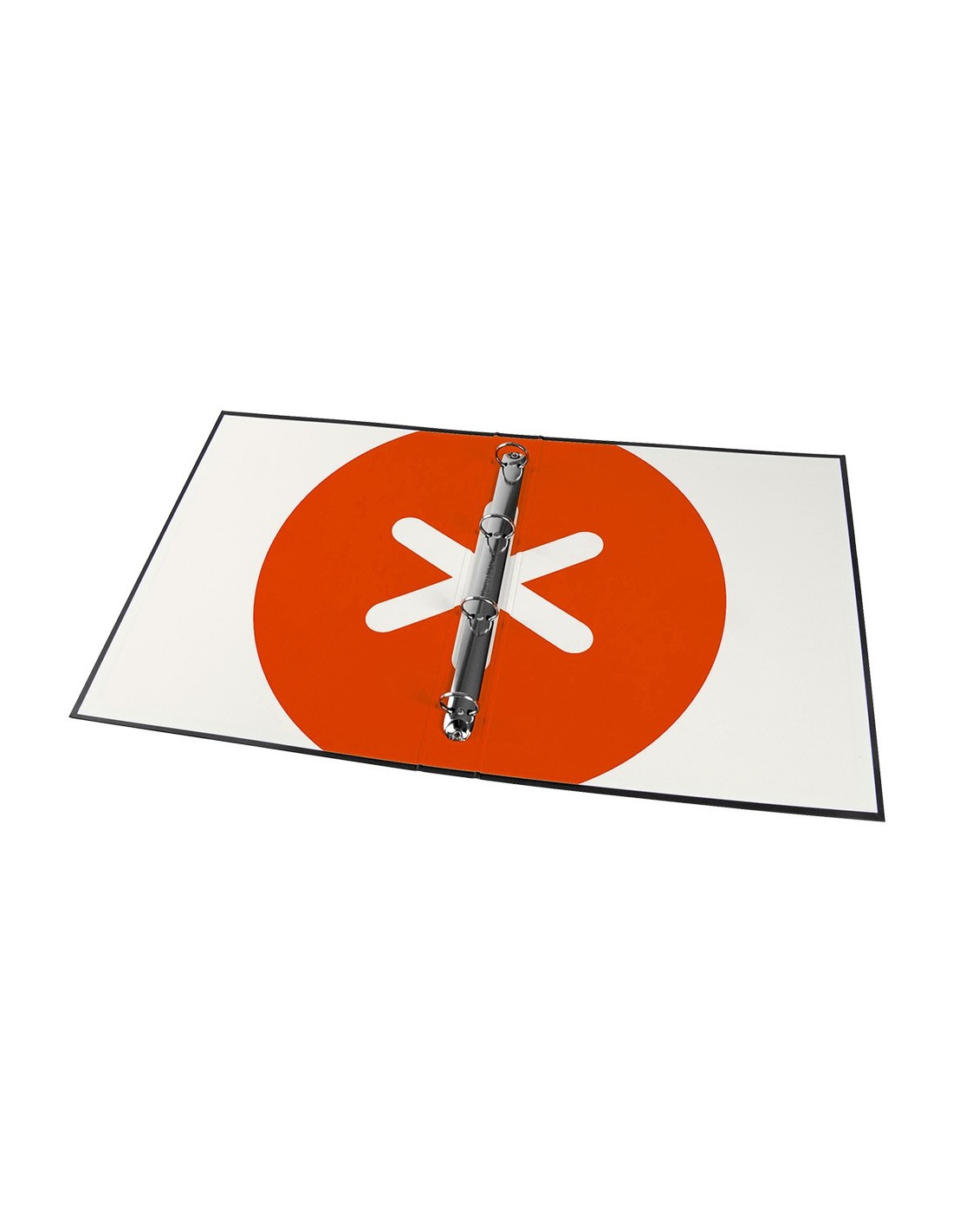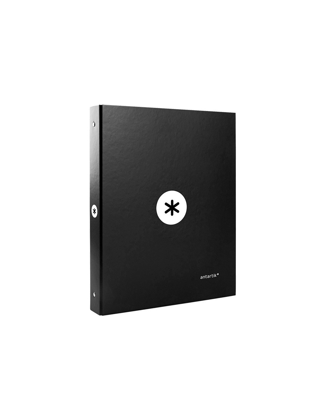Carpeta fabricada en cartón forrado de 1,5 mm de espesor. Forrada en papel estucado de 135 g/m² impreso. Plastificada mate con detalles en barniz UVI. Con 4 anillas redondas de 25 mm. Guarda interior impresa. Formato DIN A4.