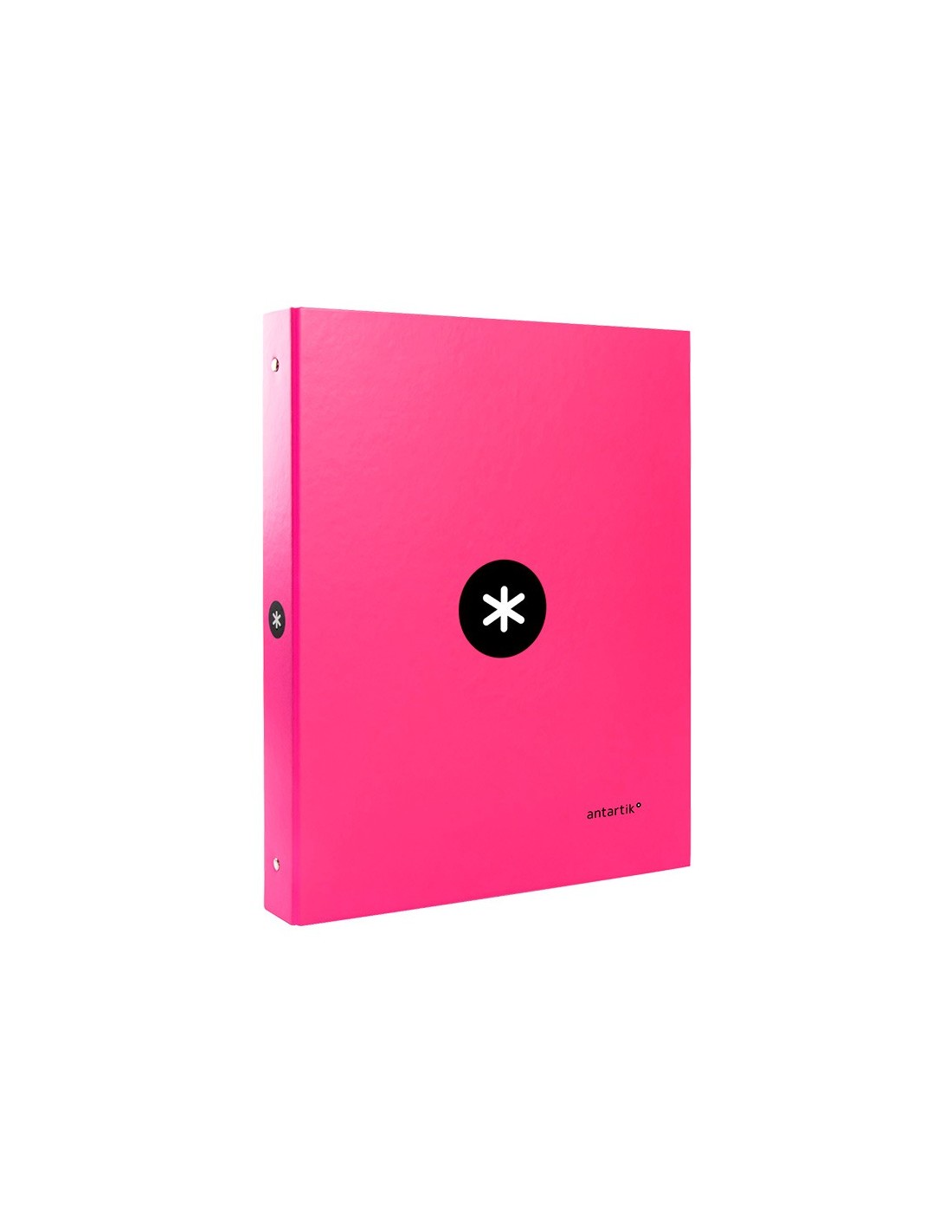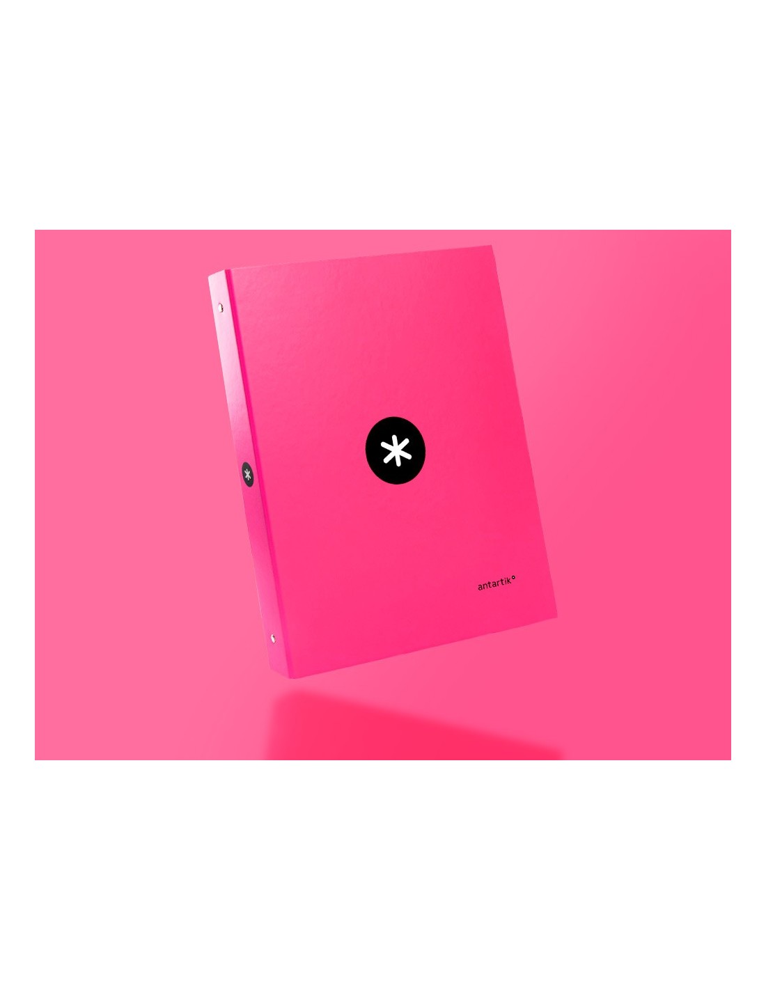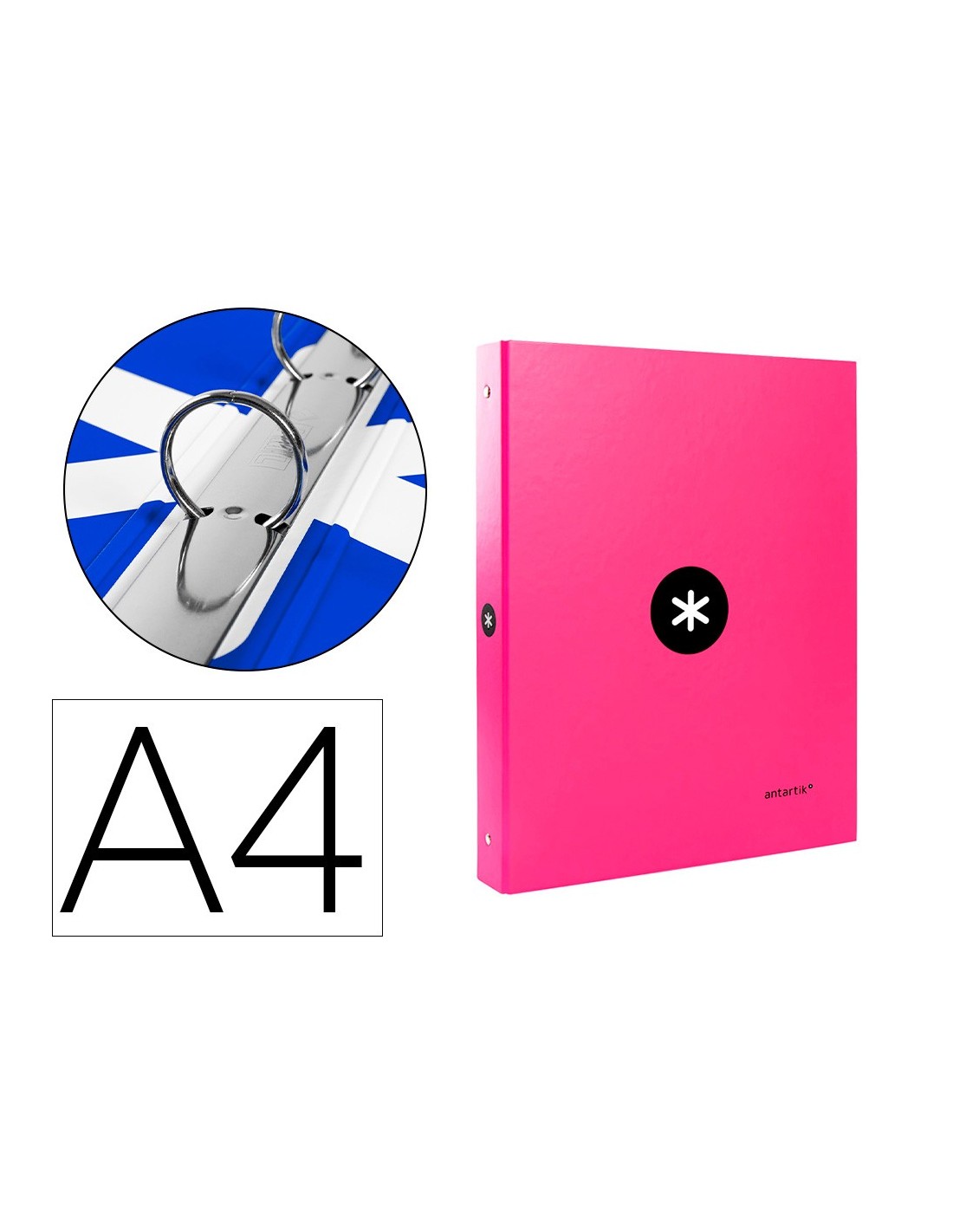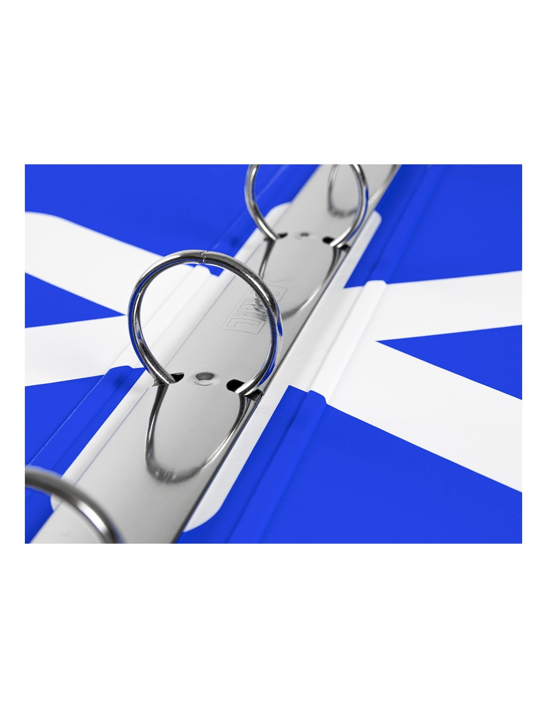 Carpeta fabricada en cartón forrado de 1,5 mm de espesor. Forrada en papel estucado de 135 g/m² impreso. Plastificada mate con detalles en barniz UVI. Con 4 anillas redondas de 25 mm. Guarda interior impresa. Formato DIN A4.