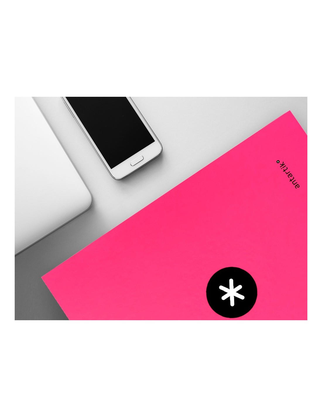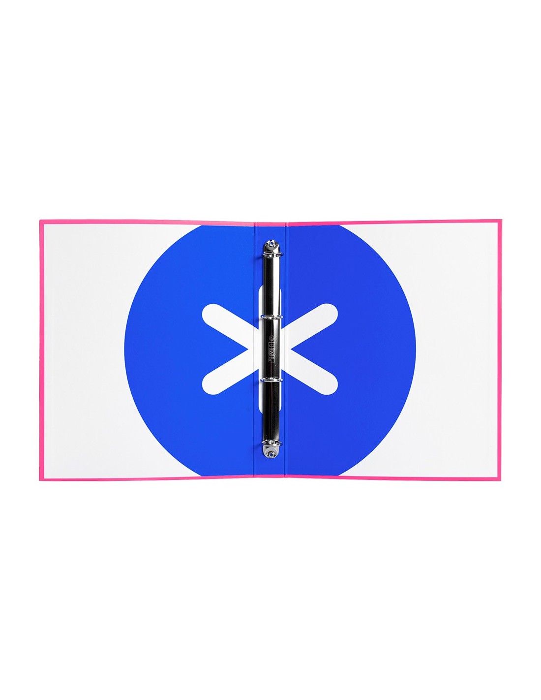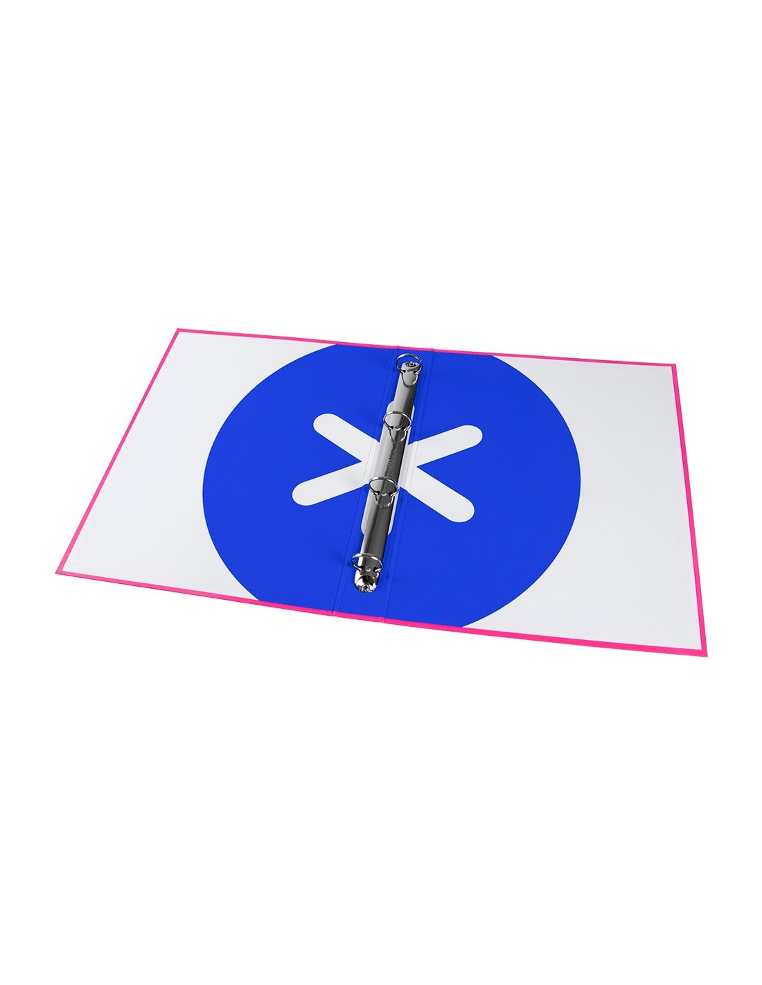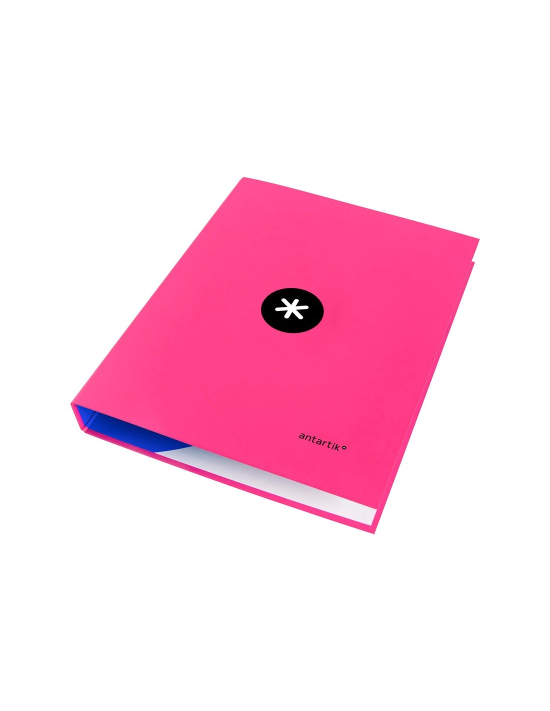 Carpeta fabricada en cartón forrado de 1,5 mm de espesor. Forrada en papel estucado de 135 g/m² impreso. Plastificada mate con detalles en barniz UVI. Con 4 anillas redondas de 25 mm. Guarda interior impresa. Formato DIN A4.