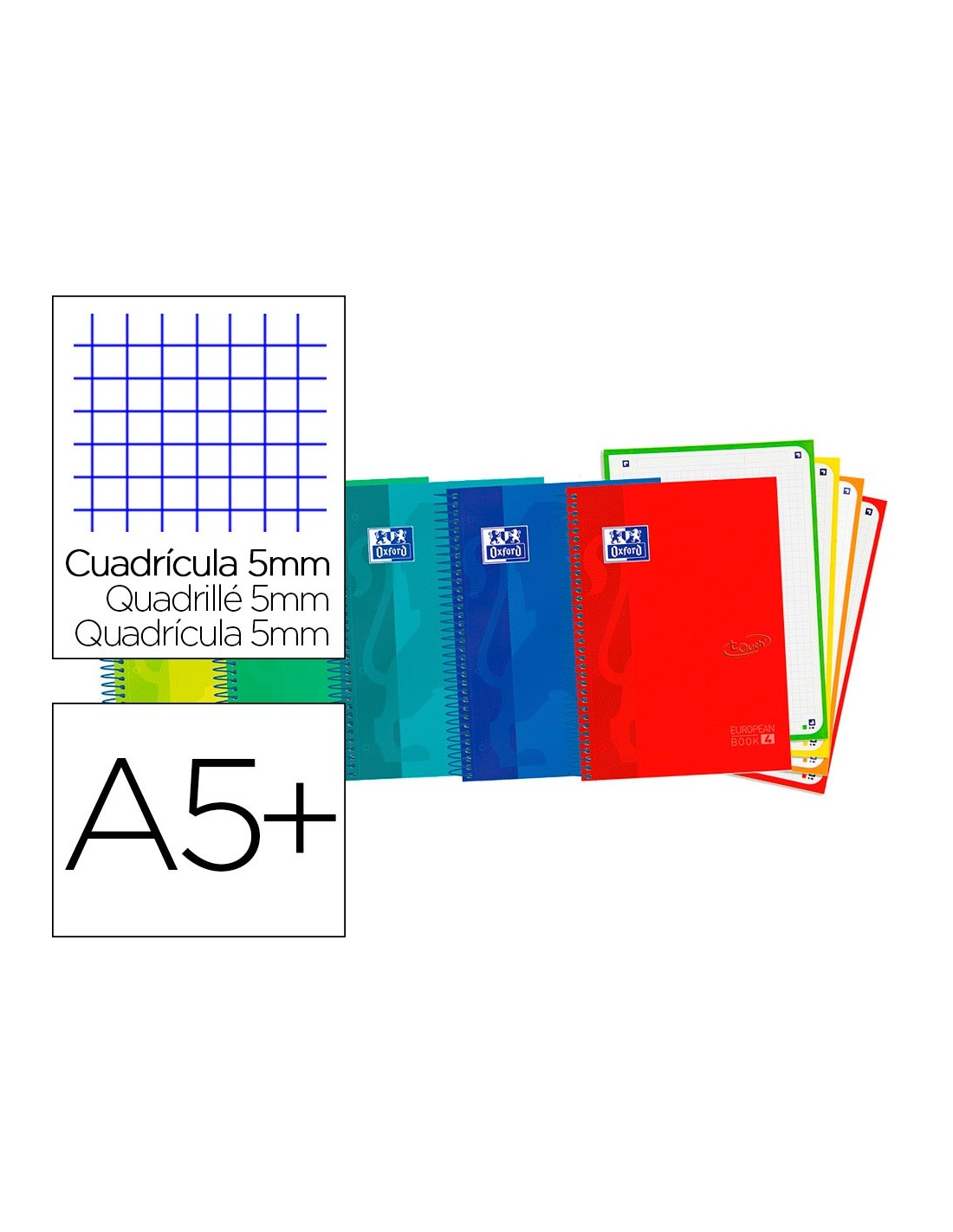 Tapa dura. 120 hojas. Papel de 90 g/m², extrablanco y satinado. Con un tacto suave y un acabado mate. OPTIK PAPER. Permite escribir por las dos caras. 4 taladros. Espiral simple a juego con el color de la tapa y el recuadro. Cuadrícula de 5 mm. Formato Din A5+. Medidas: 21,5 x 15,5 cm.