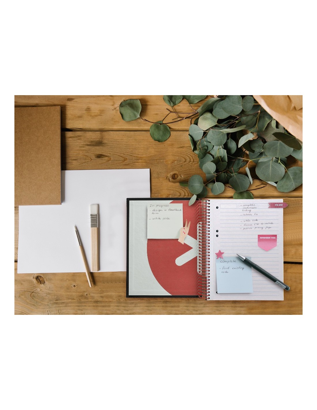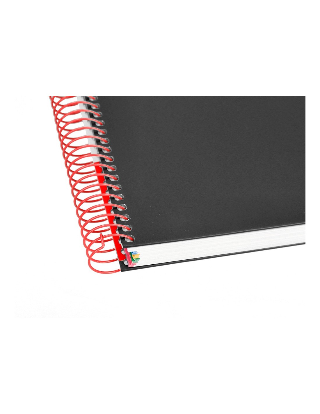 El cuaderno de más alta gama del mercado: exclusivo diseño, características inigualables, un cuaderno sin precedentes que se distingue por la suavidad y blancura de su papel, y además hace la escritura muy fluida. Tapa de cartón entrecolado de 1,5 mm de espesor, forrado a una cara con papel estucado mate extrasuave y reserva de barniz UVI. Guarda interior impresa. 100 y 120 hojas. Gran resistencia y rigidez. Papel extrablanco de 90 g/m², ultrasuave que hace la escritura mucho más fluida. La tinta no traspasa. 4 bandas de colores (formato A6) y 5 bandas de colores (formatos A5 y A4). Espiral nylonizada de colores. Coil-lock.