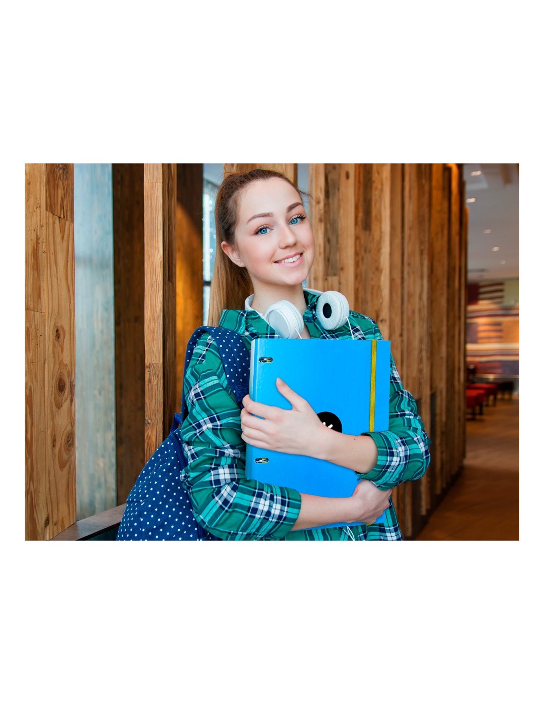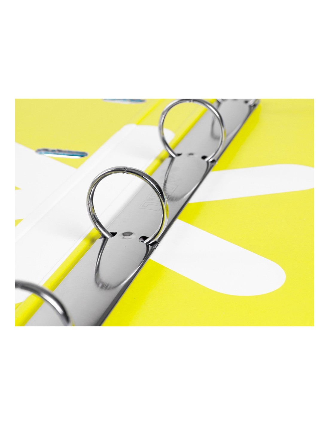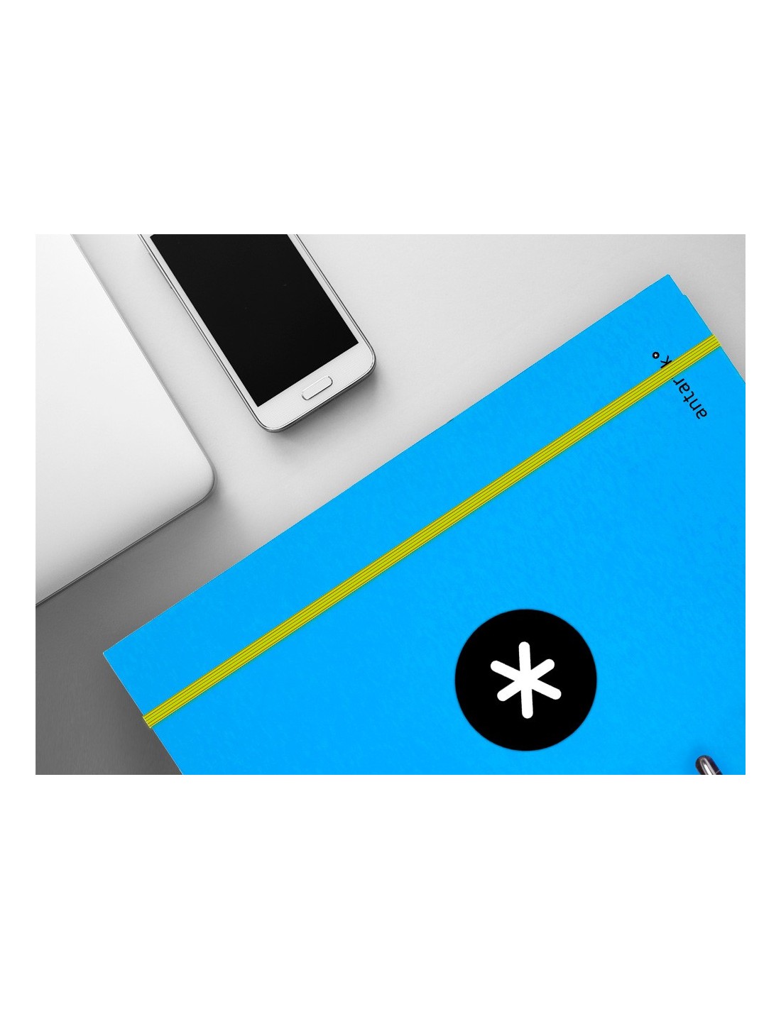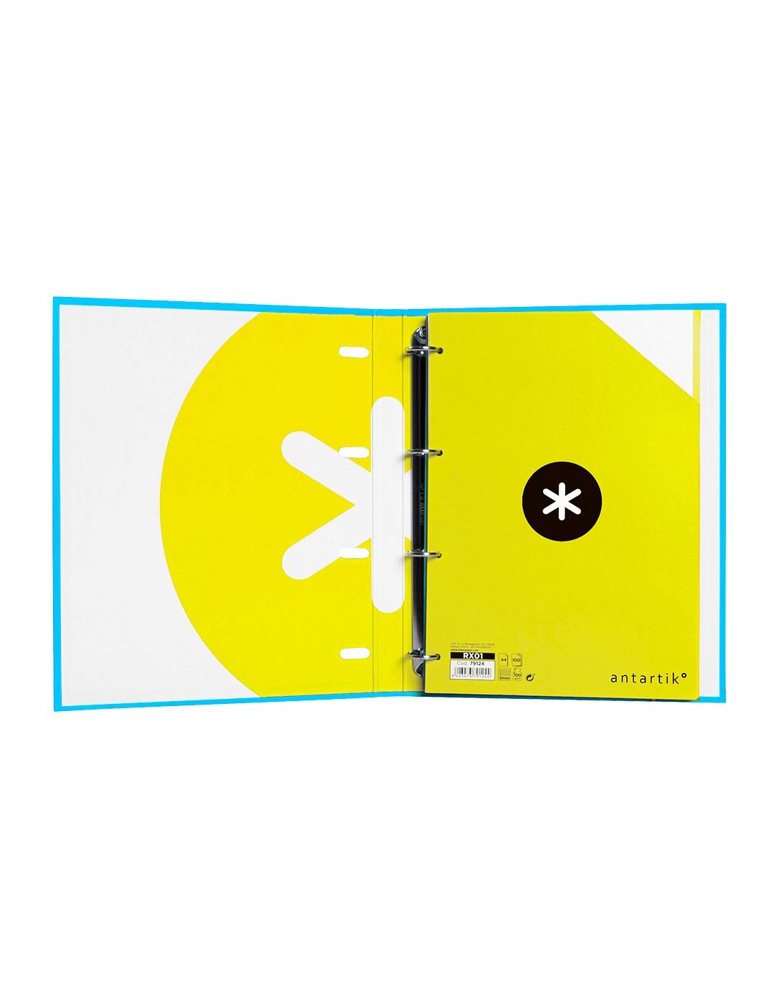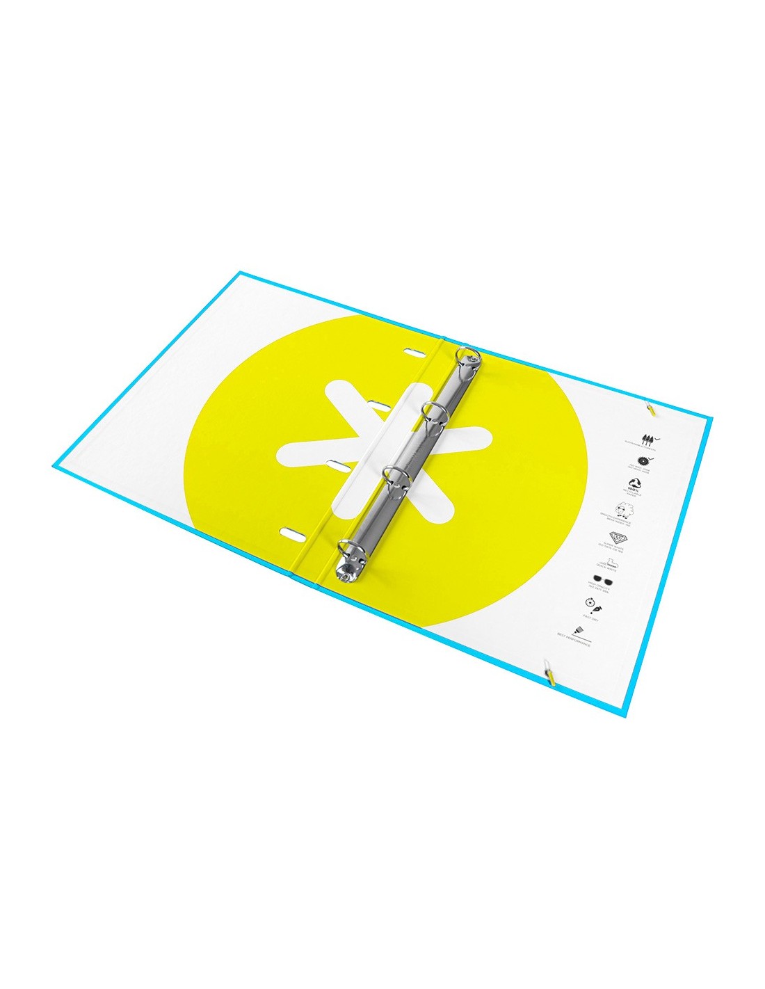 Tapa de cartón forrado de 1,75 mm de espesor. Forrada en papel estucado mate de 135 g/m² impreso. Plastificada mate con detalles barniz UVI. 4 anillas redondas. Cierre de gomilla. Con ranuras para anillas. 100 hojas con 5 bandas de color y 4 taladros. Papel interior extrablanco de 100 g/m². Ultrasuave. Cuadrícula de 5 mm. Formato DIN A4. Guarda interior impresa.