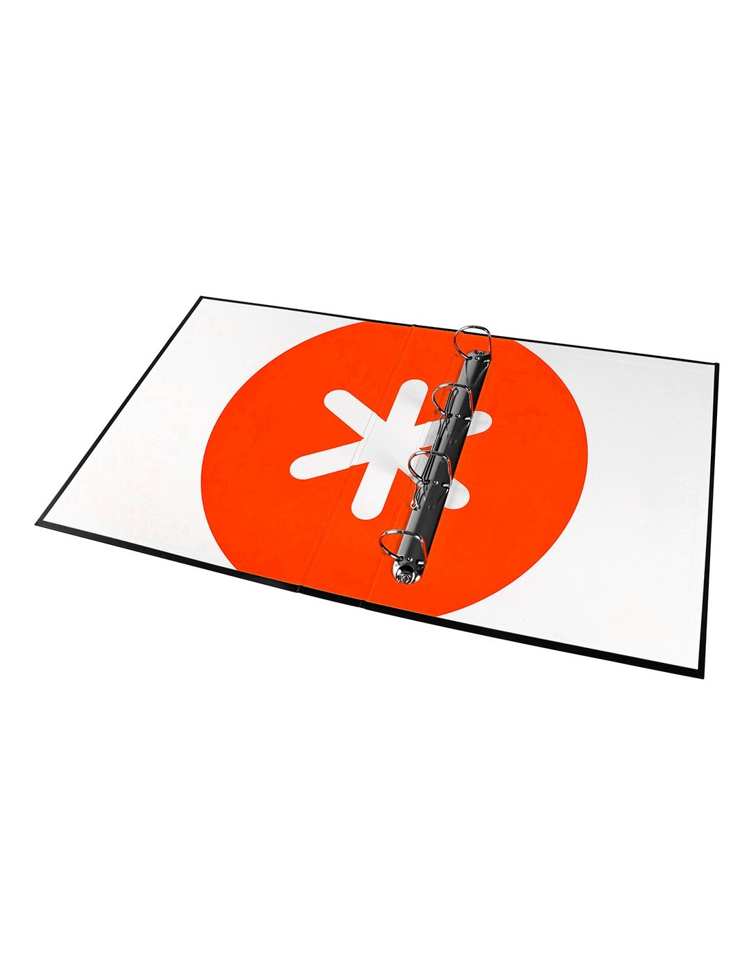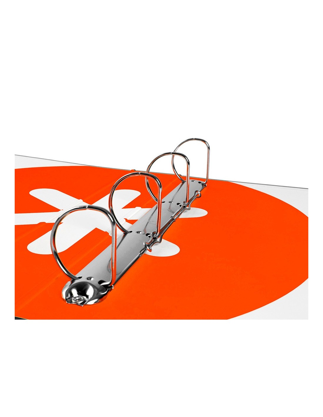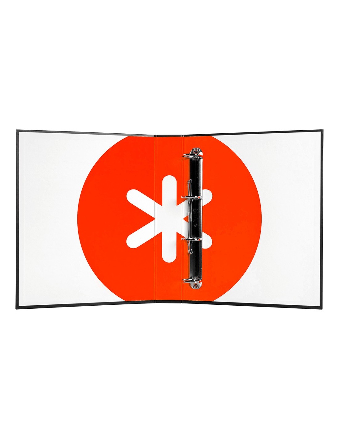 Carpeta fabricada en cartón forrado de 1,5 mm de espesor. Forrada en papel estucado de 135 g/m² impreso. Plastificada mate con detalles en barniz UVI. Con 4 anillas de 40 mm. Guarda interior impresa. Formato DIN A4.