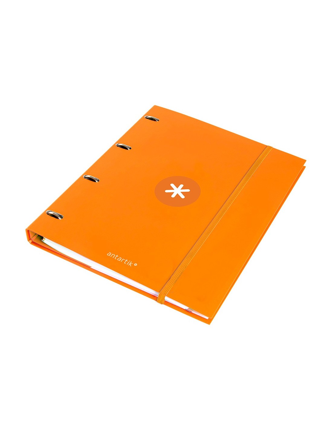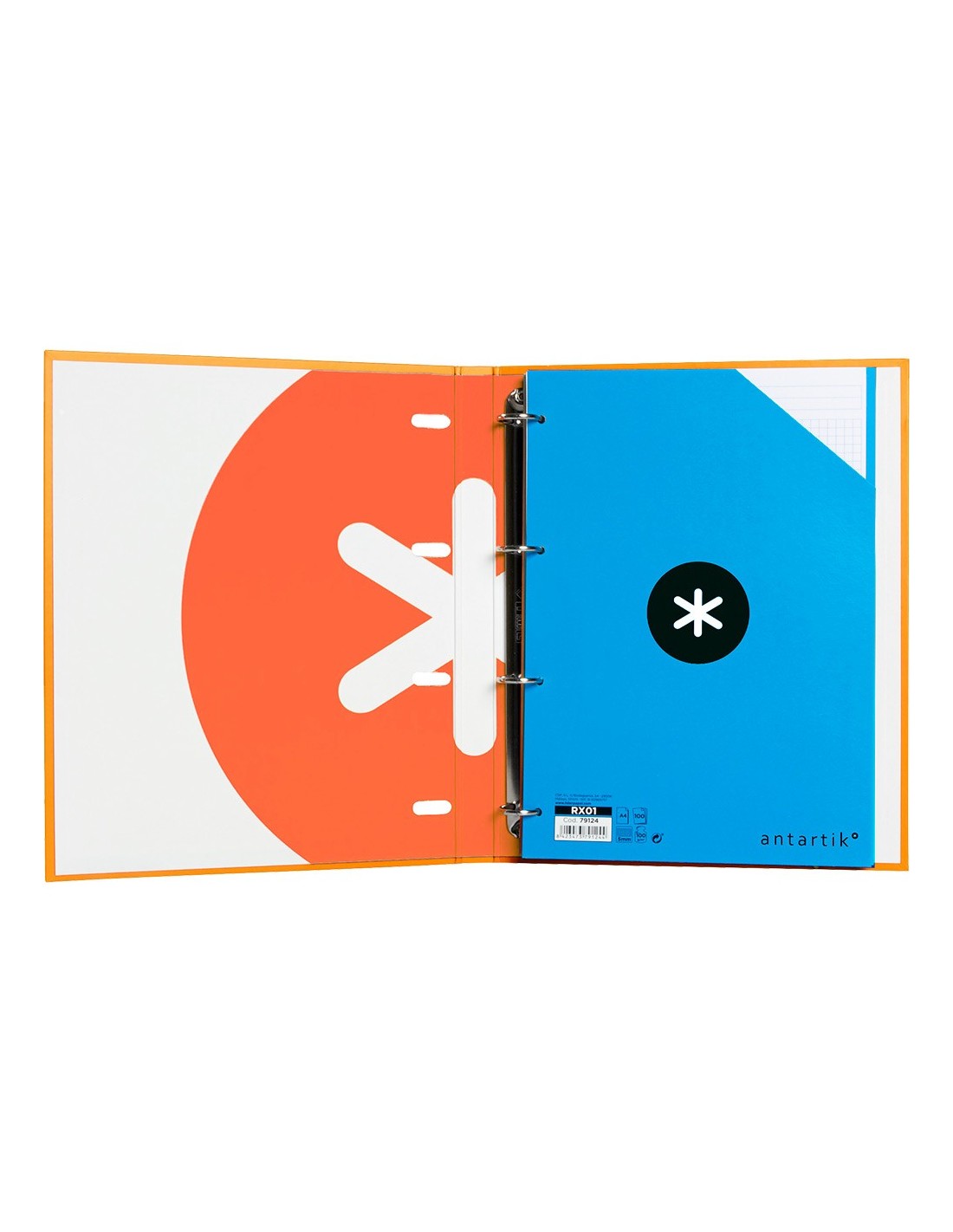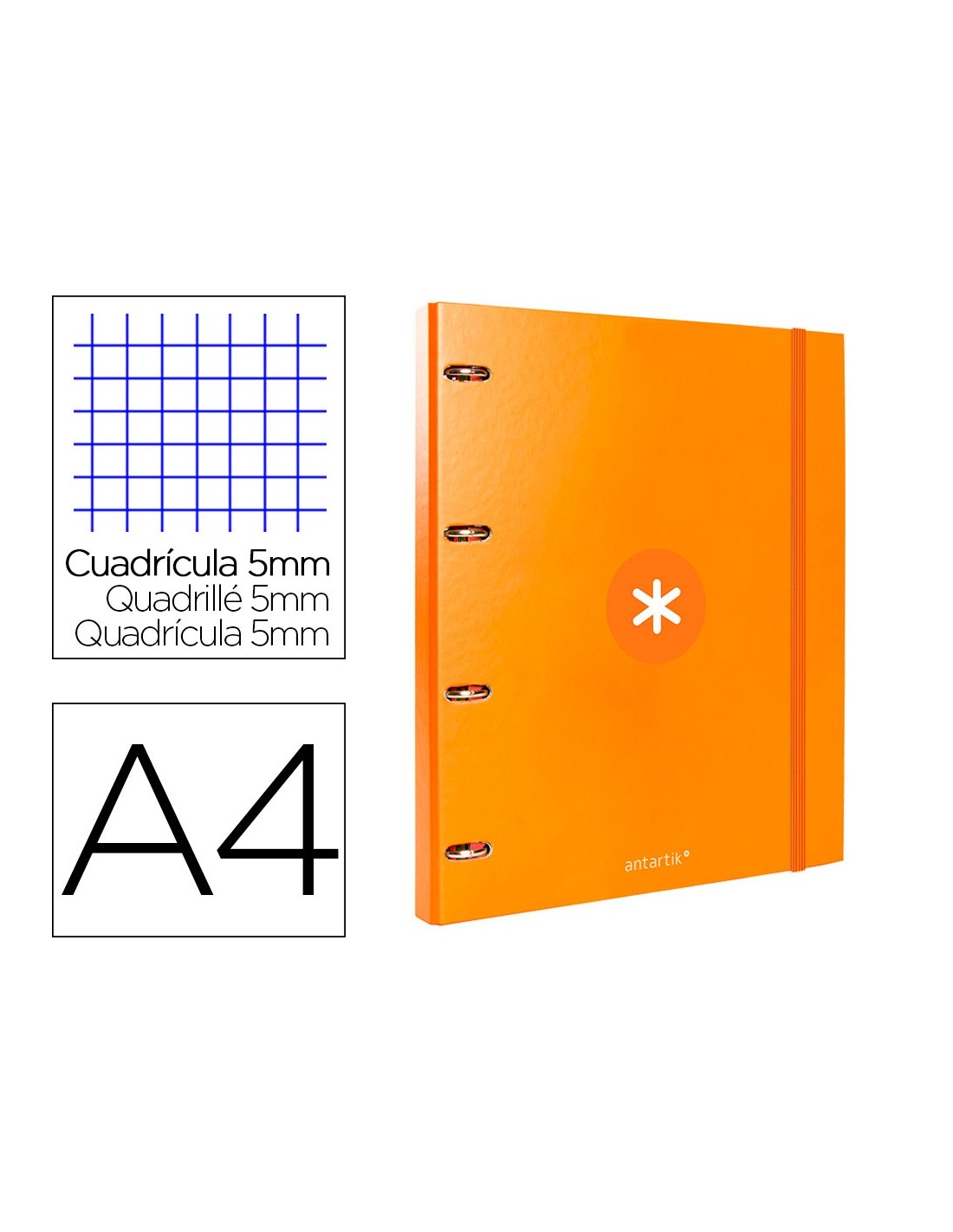 Tapa de cartón forrado de 1,75 mm de espesor. Forrada en papel estucado mate de 135 g/m² impreso. Plastificada mate con detalles barniz UVI. 4 anillas redondas. Cierre de gomilla. Con ranuras para anillas. 100 hojas con 5 bandas de color y 4 taladros. Papel interior extrablanco de 100 g/m². Ultrasuave. Cuadrícula de 5 mm. Formato DIN A4. Guarda interior impresa.