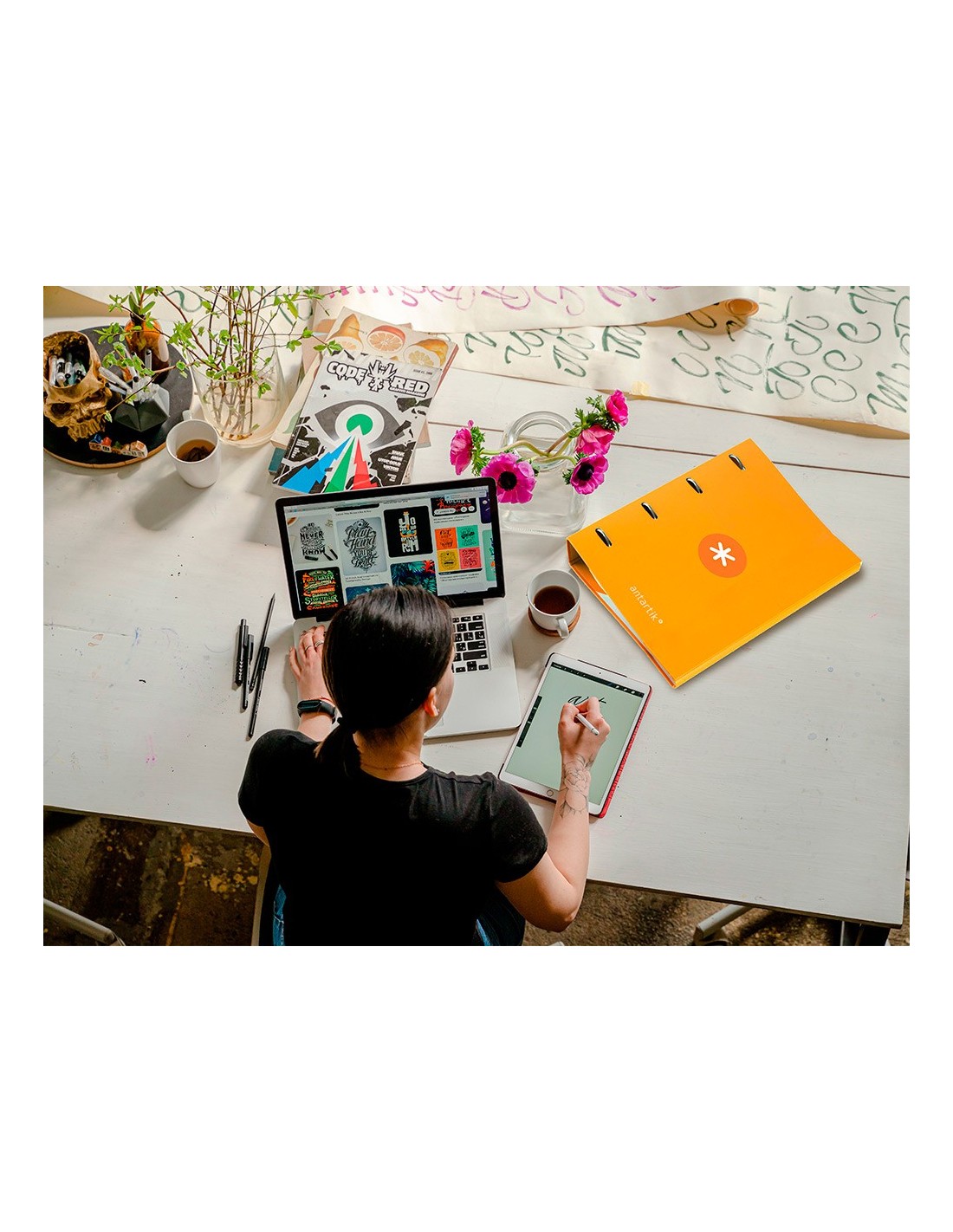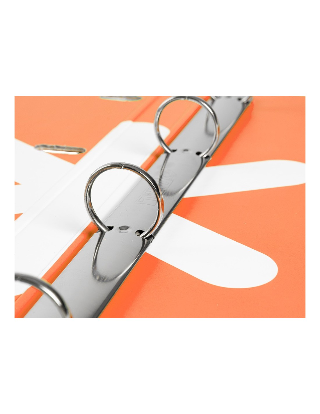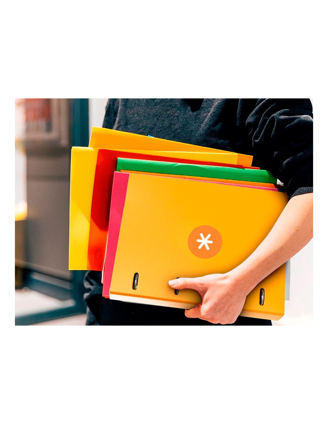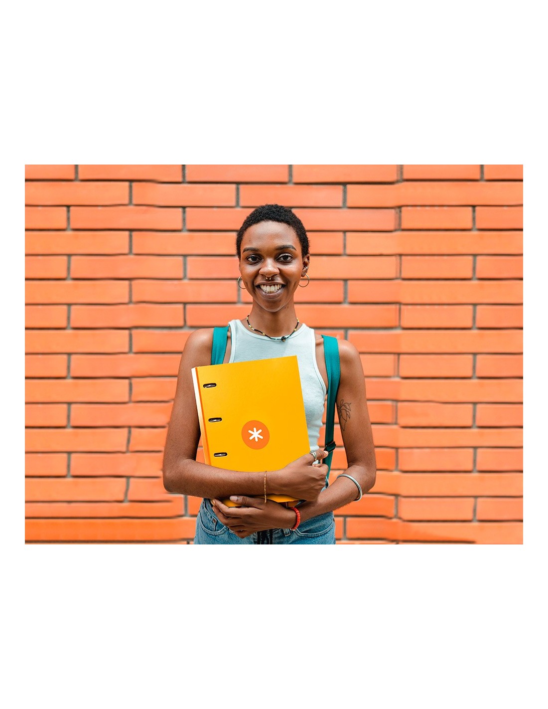 Tapa de cartón forrado de 1,75 mm de espesor. Forrada en papel estucado mate de 135 g/m² impreso. Plastificada mate con detalles barniz UVI. 4 anillas redondas. Cierre de gomilla. Con ranuras para anillas. 100 hojas con 5 bandas de color y 4 taladros. Papel interior extrablanco de 100 g/m². Ultrasuave. Cuadrícula de 5 mm. Formato DIN A4. Guarda interior impresa.