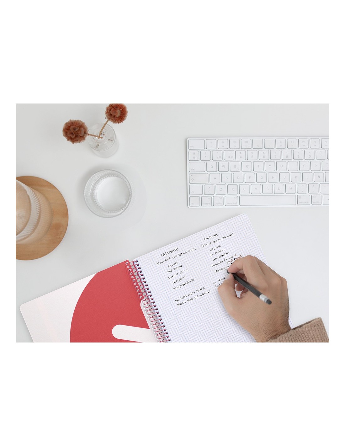 El cuaderno de más alta gama del mercado: exclusivo diseño, características inigualables, un cuaderno sin precedentes que se distingue por la suavidad y blancura de su papel, y además hace la escritura muy fluida. Tapa dura de cartoncillo de 800 g/m² con doble encolado, impresa y plastificada mate extrasuave. Interior de portada impresa y plastificada mate. Gran resistencia y rigidez. Papel extrablanco de 100 g/m², ultrasuave que hace la escritura mucho más fluida. La tinta no traspasa. Espiral nylonizada de colores. Coil-lock.