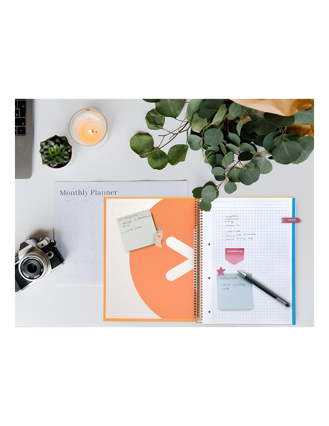 El cuaderno de más alta gama del mercado: exclusivo diseño, características inigualables, un cuaderno sin precedentes que se distingue por la suavidad y blancura de su papel, y además hace la escritura muy fluida. Tapa de cartón entrecolado de 1,5 mm de espesor, forrado a una cara con papel estucado mate extrasuave y reserva de barniz UVI. Guarda interior impresa. 100 y 120 hojas. Gran resistencia y rigidez. Papel extrablanco de 90 g/m², u ltrasuave que hace la escritura mucho más fluida. La tinta no traspasa. 4 bandas de colores (formato A6) y 5 bandas de colores (formatos A5 y A4). Espiral nylonizada de colores. Coil-lock.