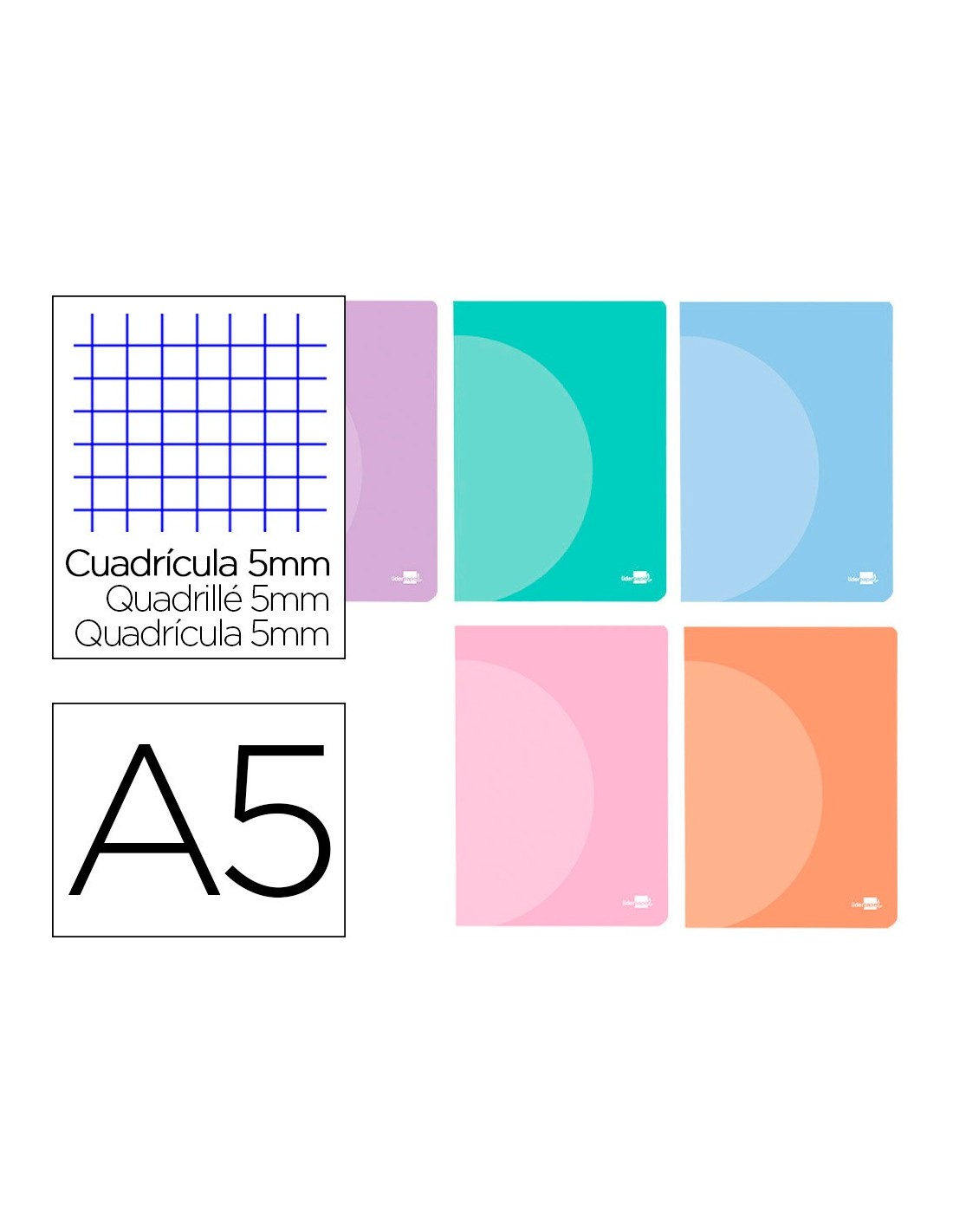 Libreta con tapa de plástico flexible y resistente. Se puede abrir completamente para una mayor comodidad. 48 hojas. Papel de 90 g/m². Cuadrícula de5 mm. con doble margen. Colores pasteles surtidos.
