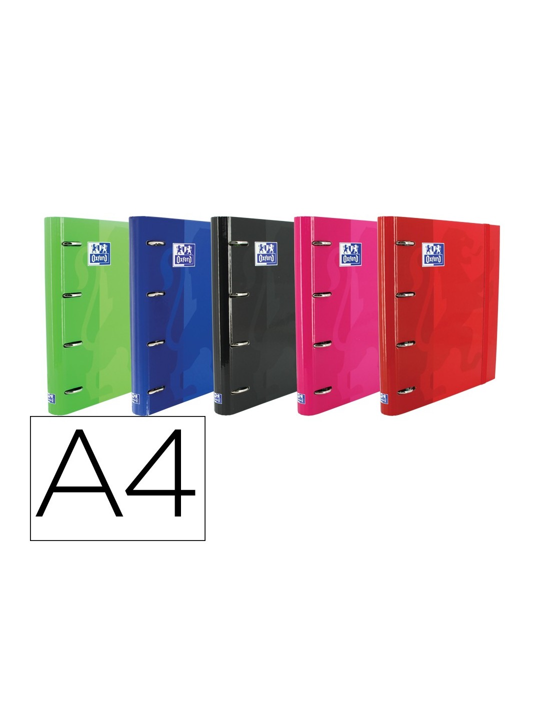 Carpeta de 4 anillas de 35 mm. Tapa extradura con peliculado brillante. Incluye recambio Oxford con bandas de color. Hojas con cuadrícula 5 x 5 mm en su interior. Cierre con goma elástica.
